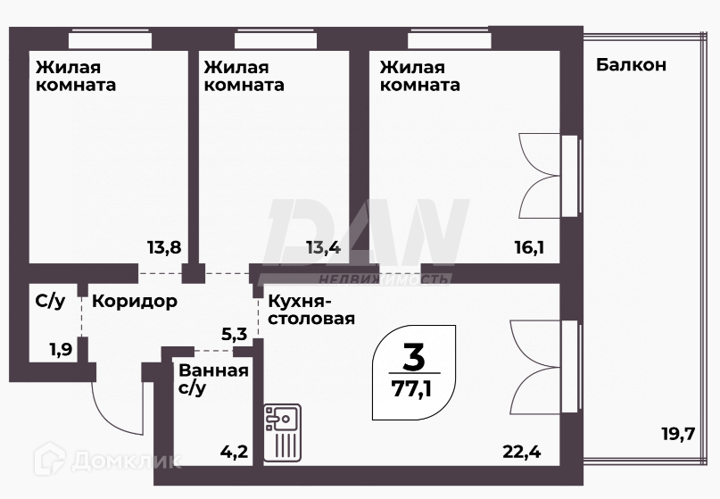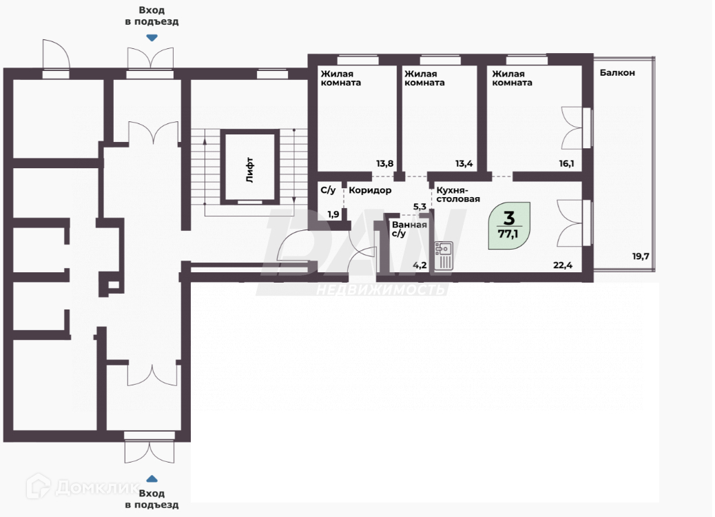 Общая площадь объекта 77,1 кв.м.