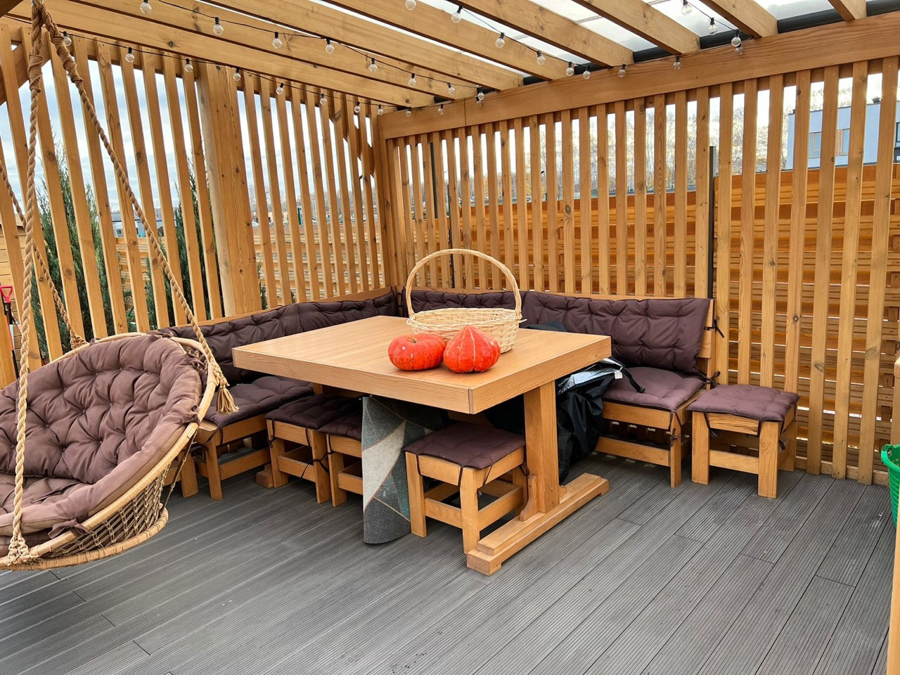 - Терраса с беседкой и деревянной мебелью
