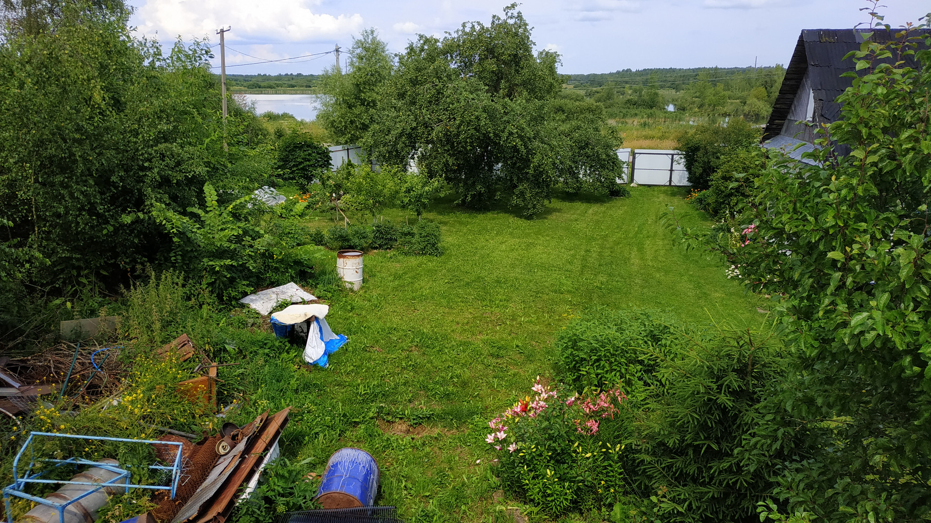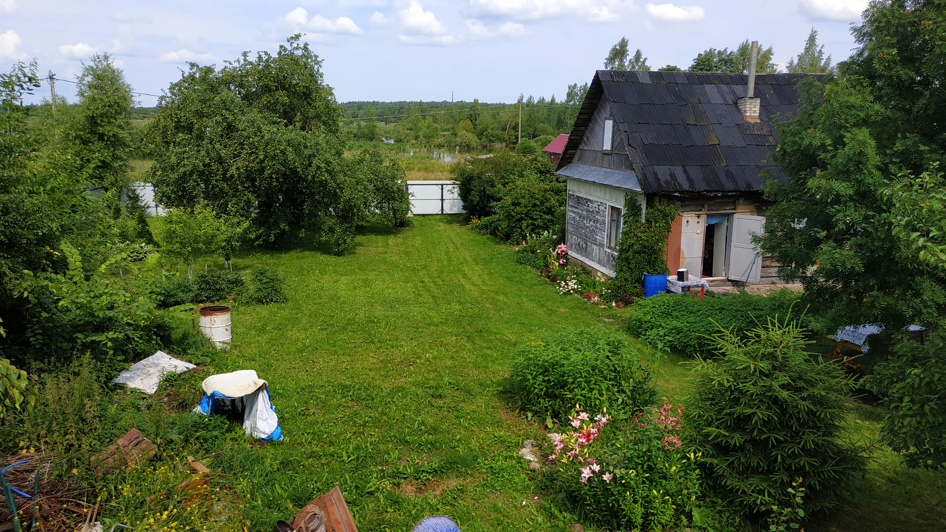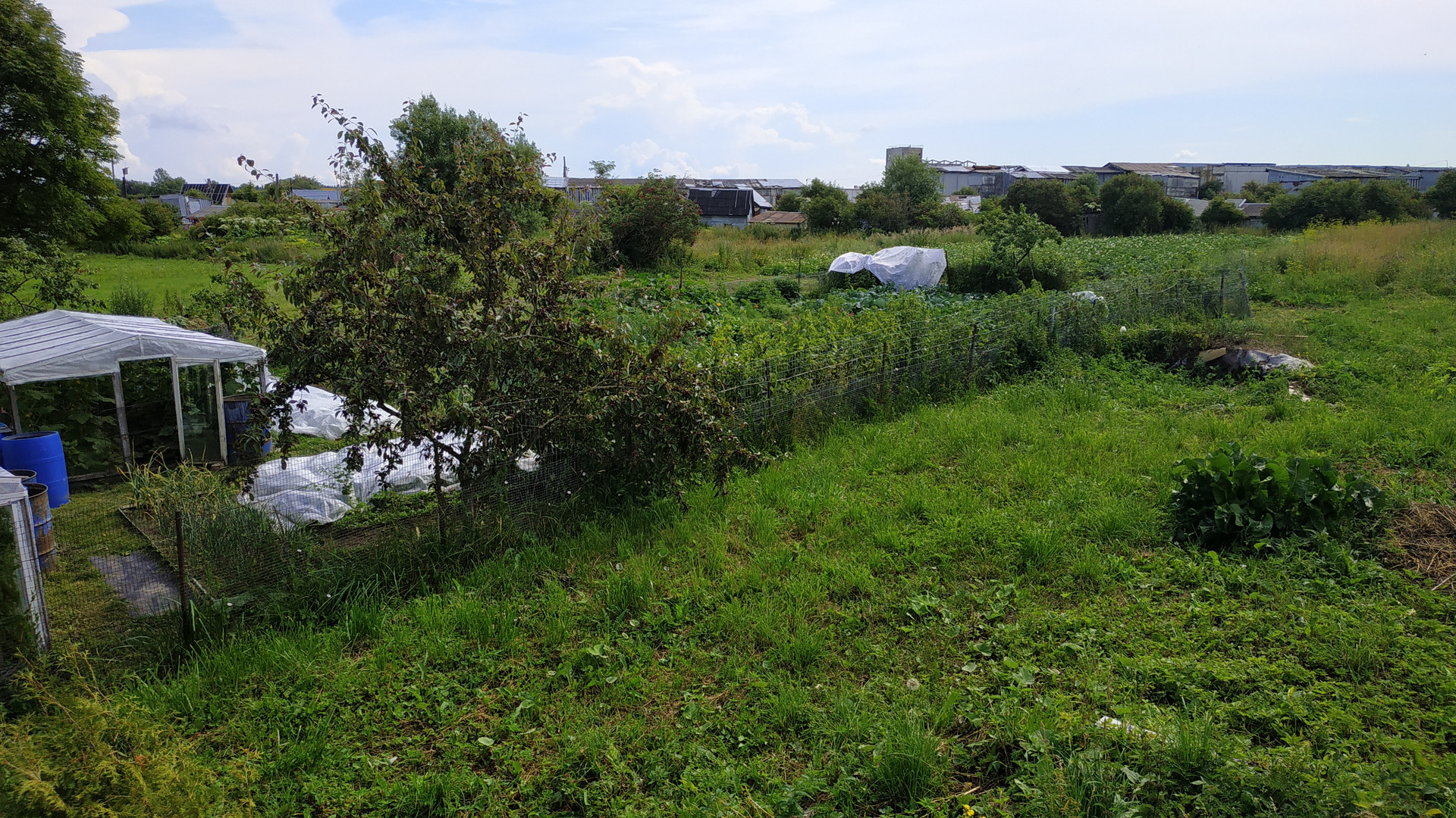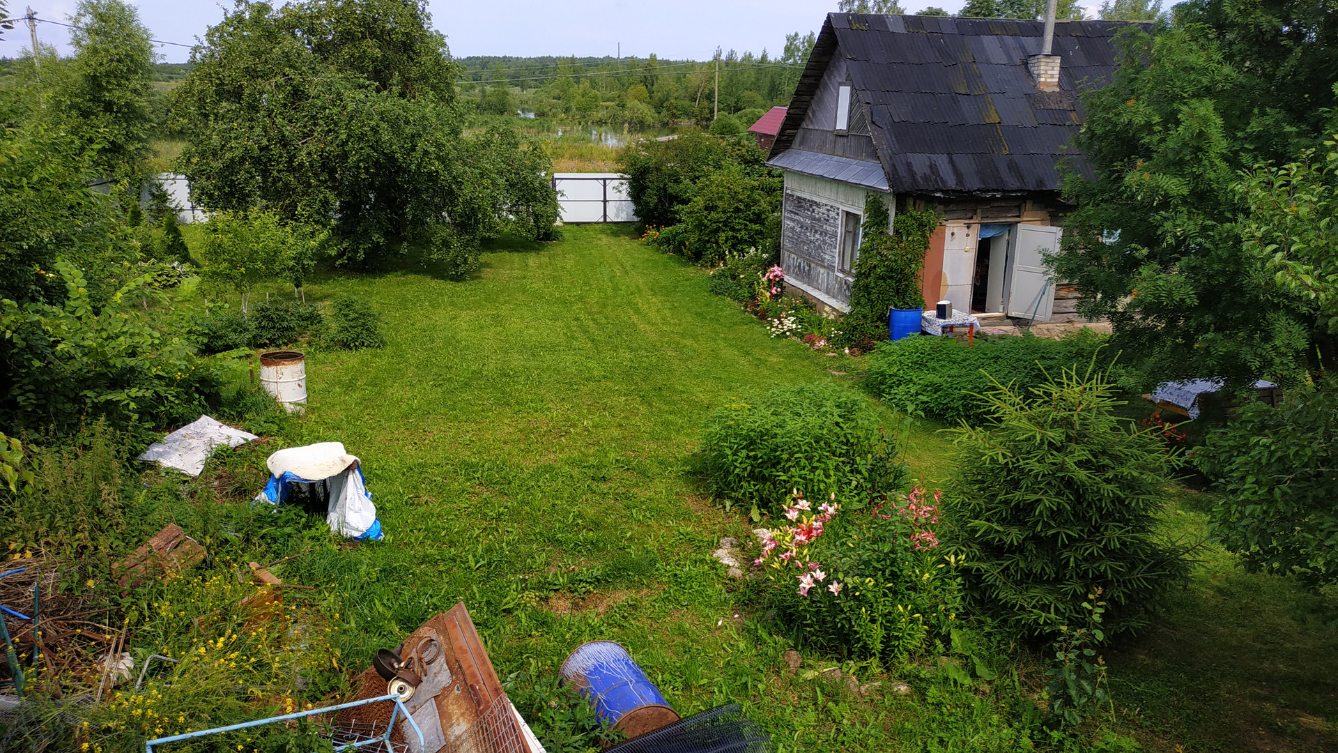 Участок просторный, почти правильной формы. Возможно полное или частичное освоение- огород, хозпостройки для животных или для других нужд. На территории растут плодоносящие яблони, овощи, цветы.