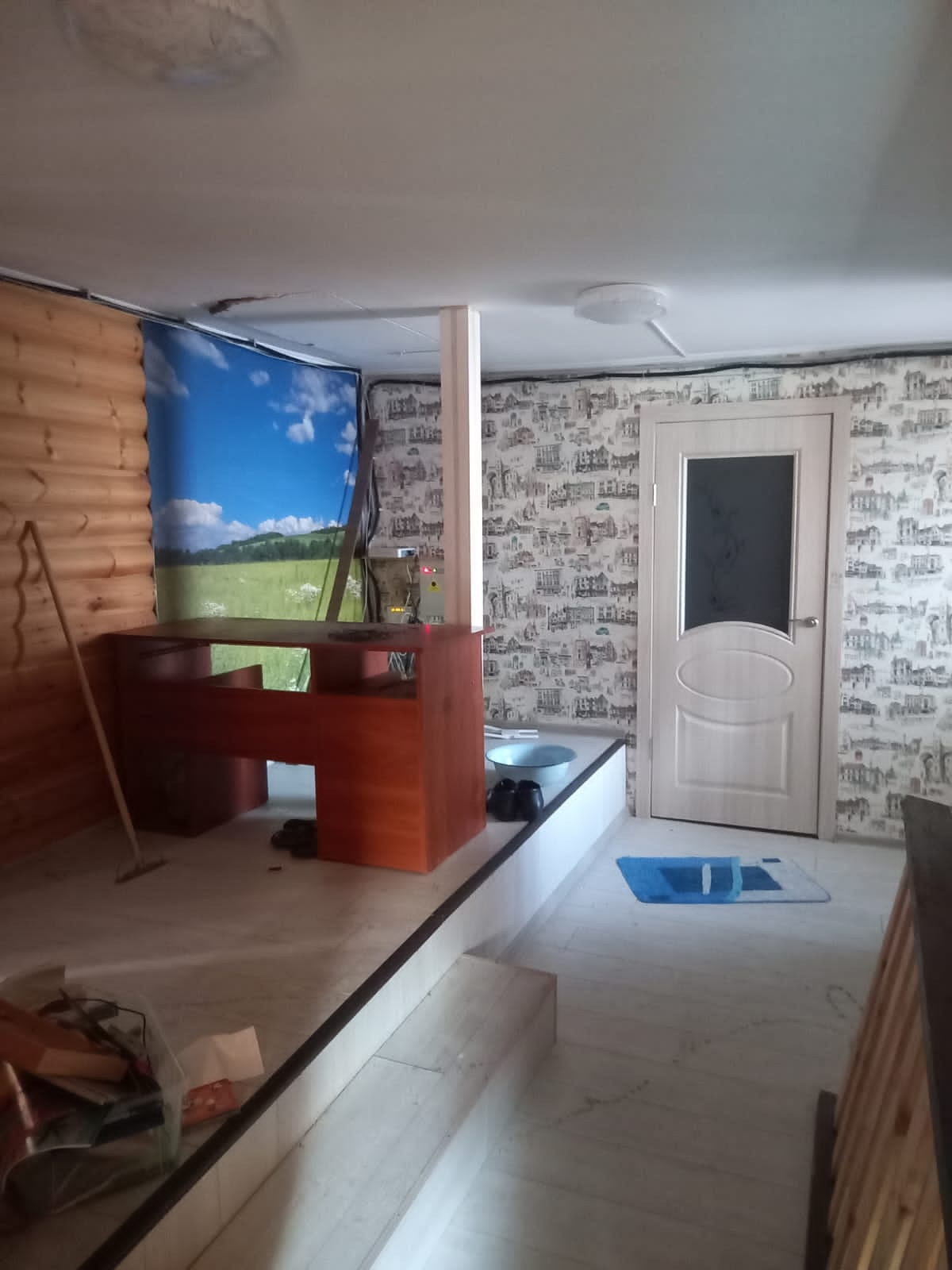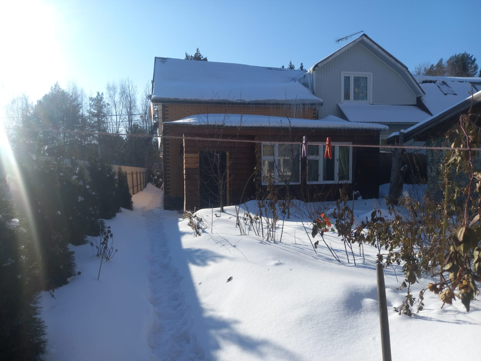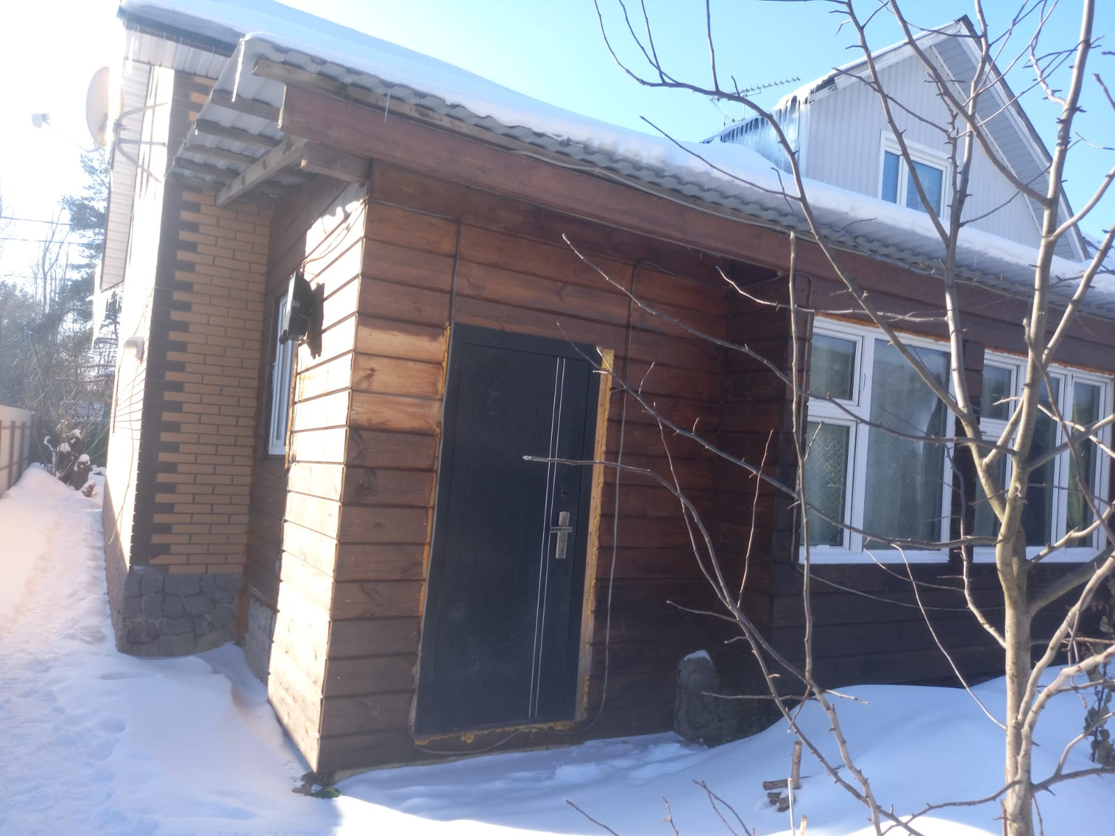 Постройка с баней и бассейном и 2 этажом, без отделки. Сзади участка выход, в лес. Дом отделан облицовочным кирпичом, пластиковые окна, теплый пол.
