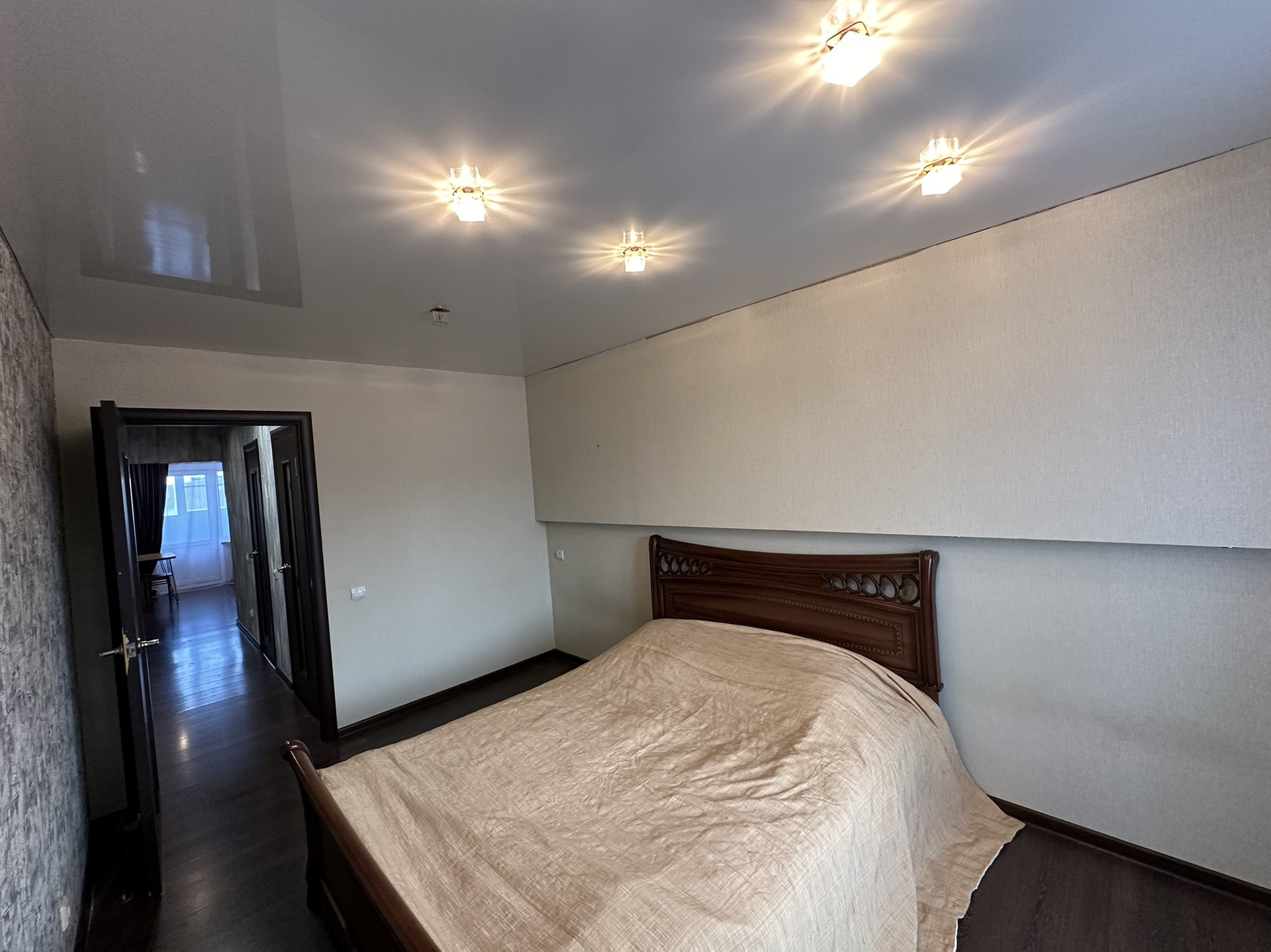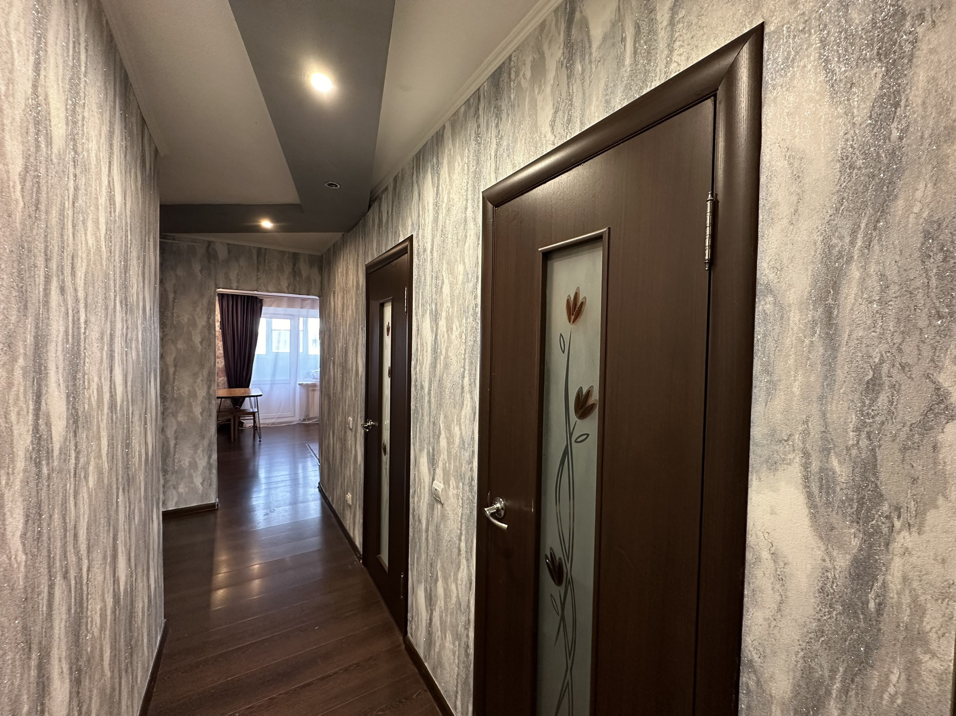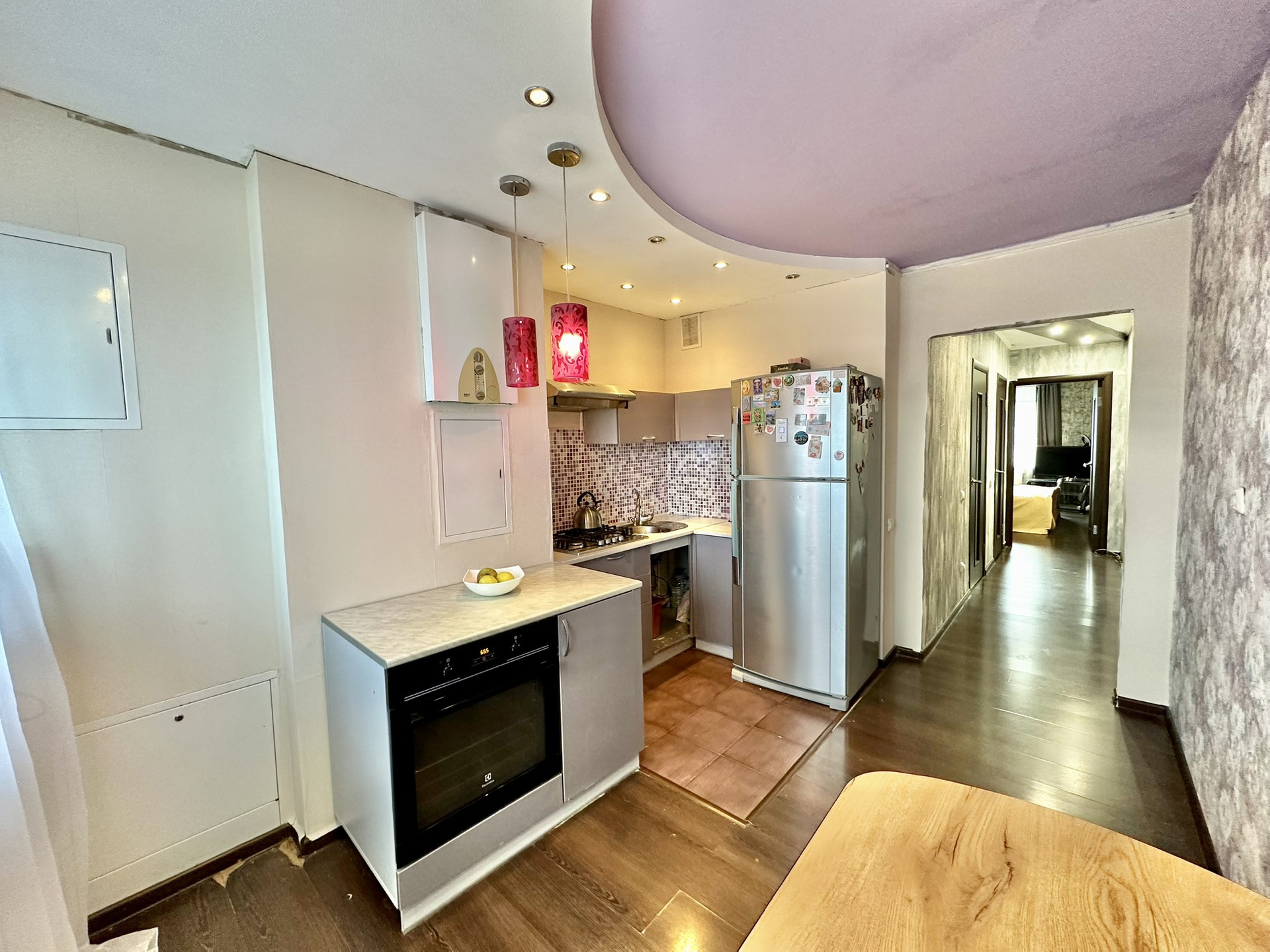 В комнатах натяжные потолки; в кухне и коридорах с модульными навесными конструкциями.