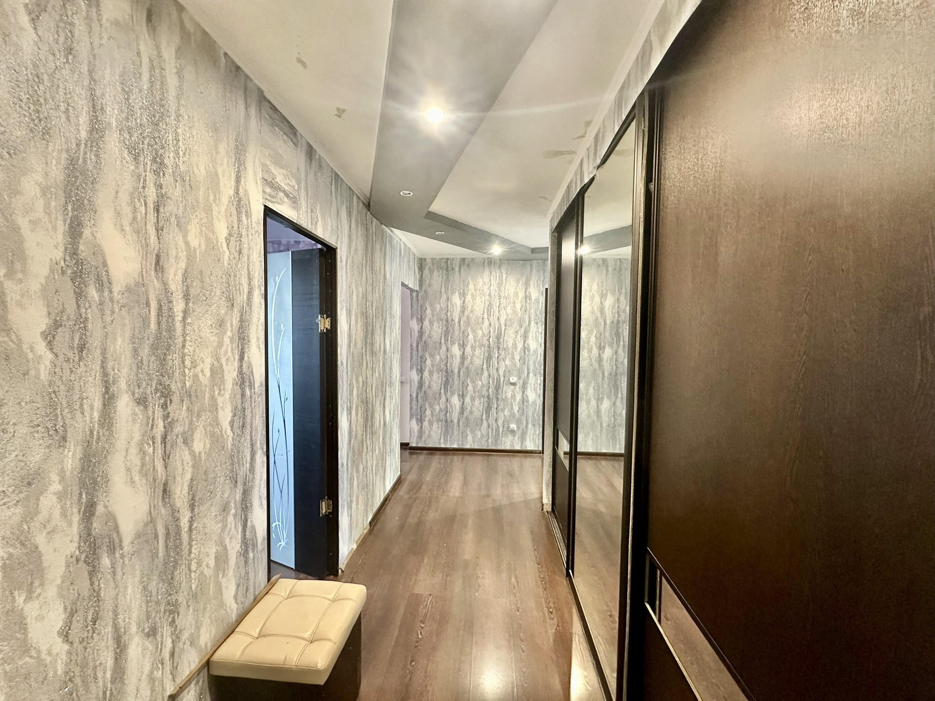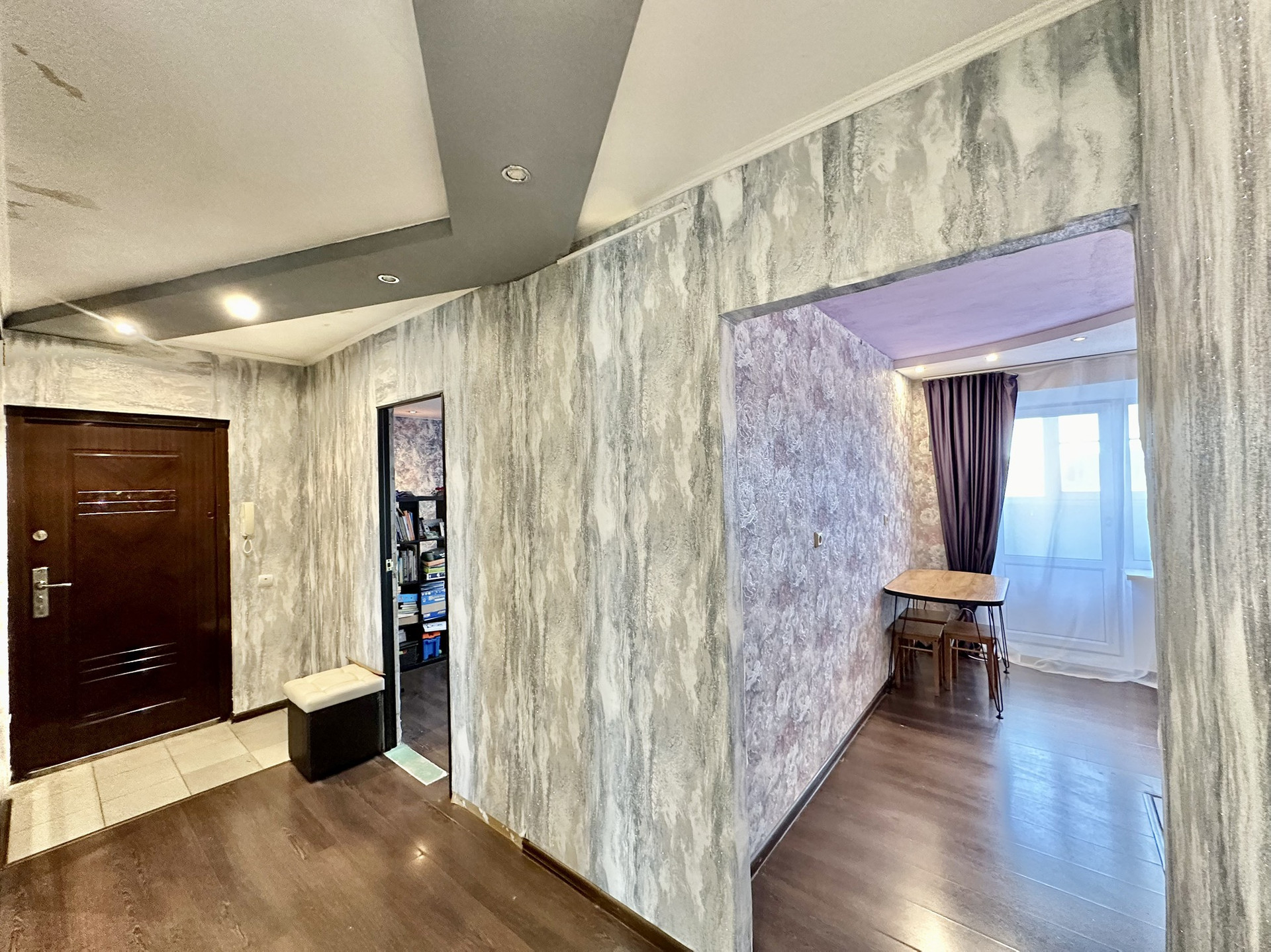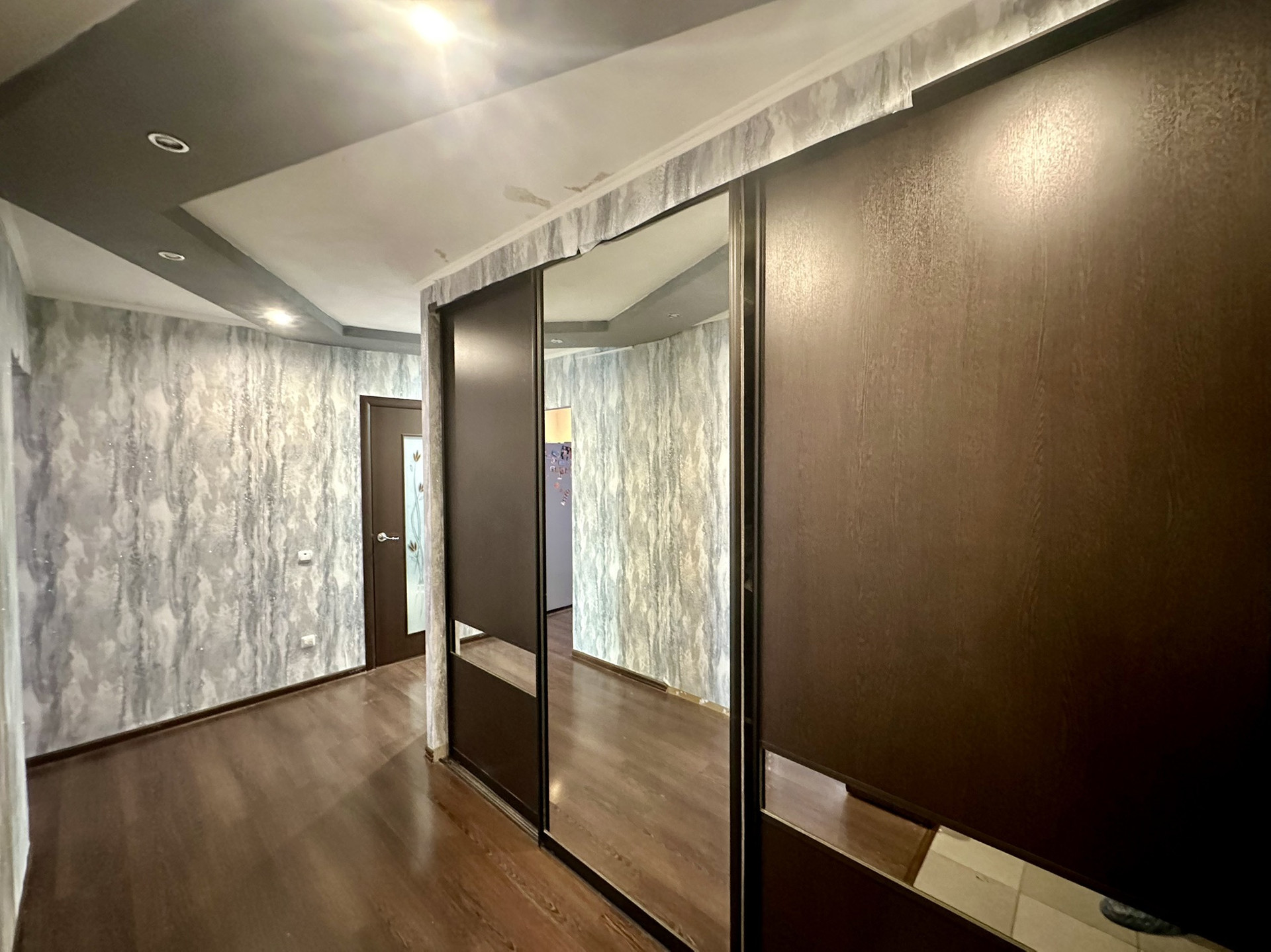 На полу во входной зоне кафель, а также около кухонного гарнитура, в остальных помещениях ламинат.