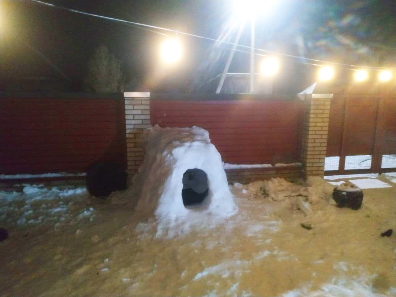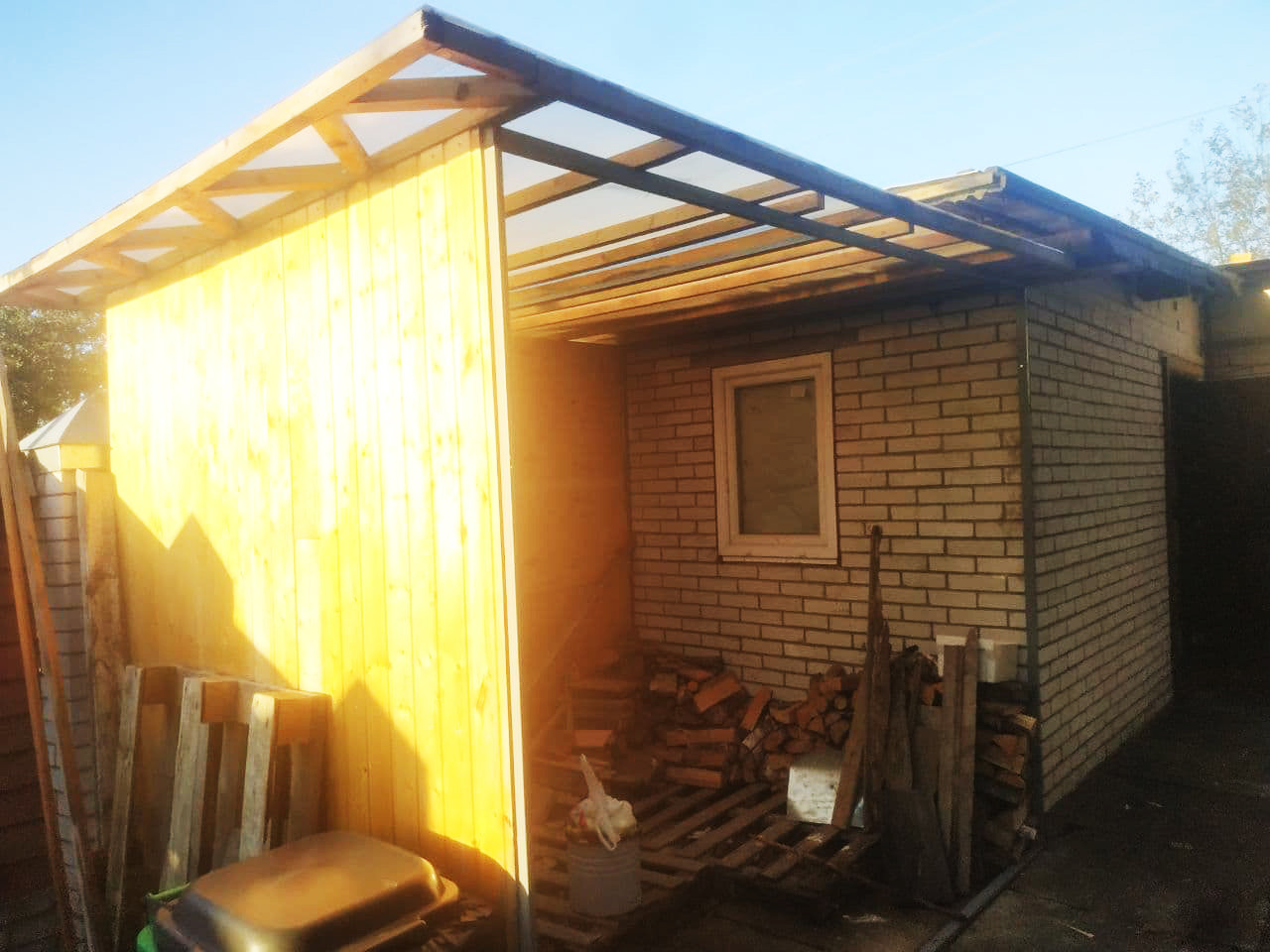 На территории складируются кирпичи, которых должно хватить для надстройки второго этажа бани.