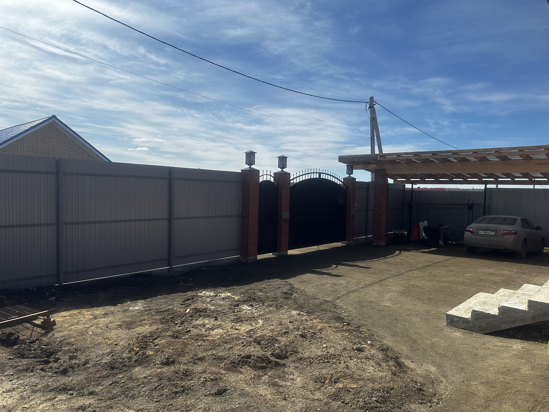 -Участок огорожен забором из профнастила, ворота кованные.