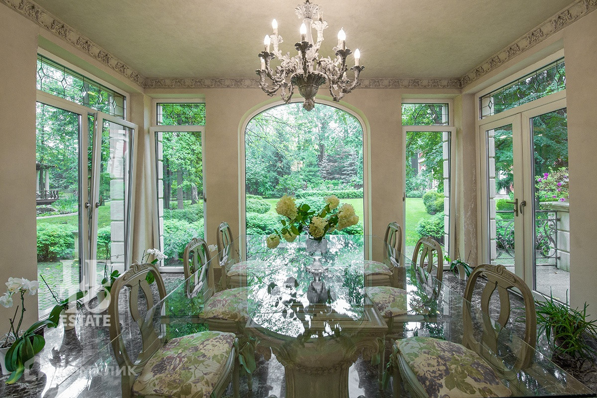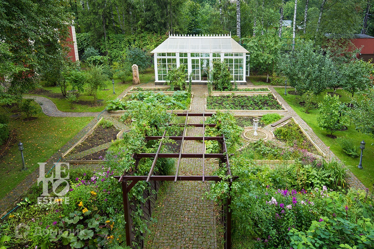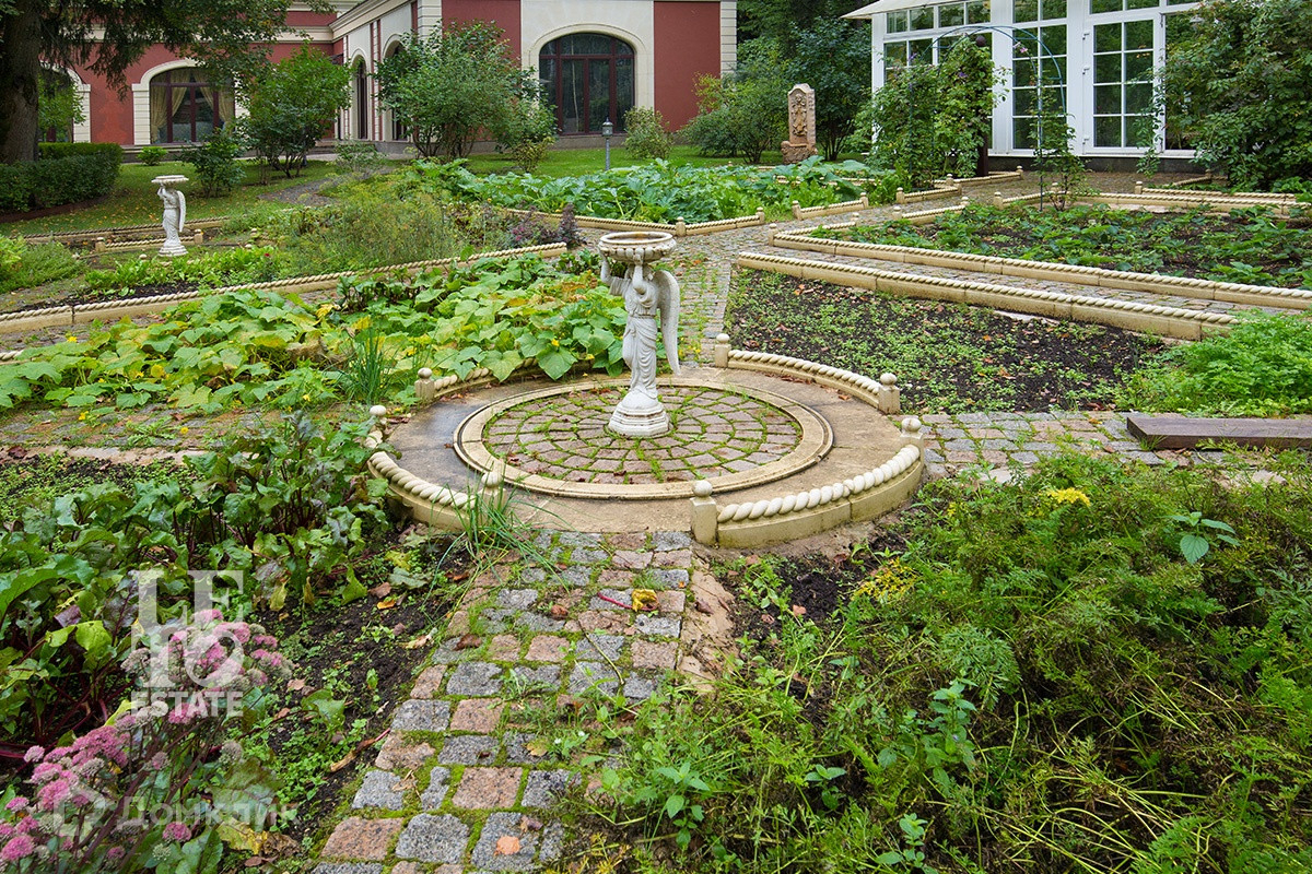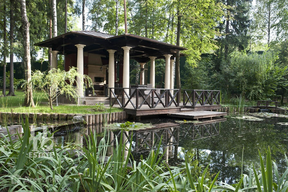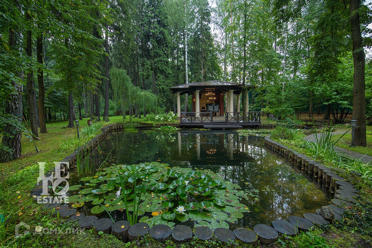 На участке сделан ландшафтный дизайн, с устройством декоративного озера, на берегу которого расположена беседка с печью-барбекю, также на участке построен отдельно стоящий СПА-комплекс и гараж на 3 м/м с квартирой для персонала.