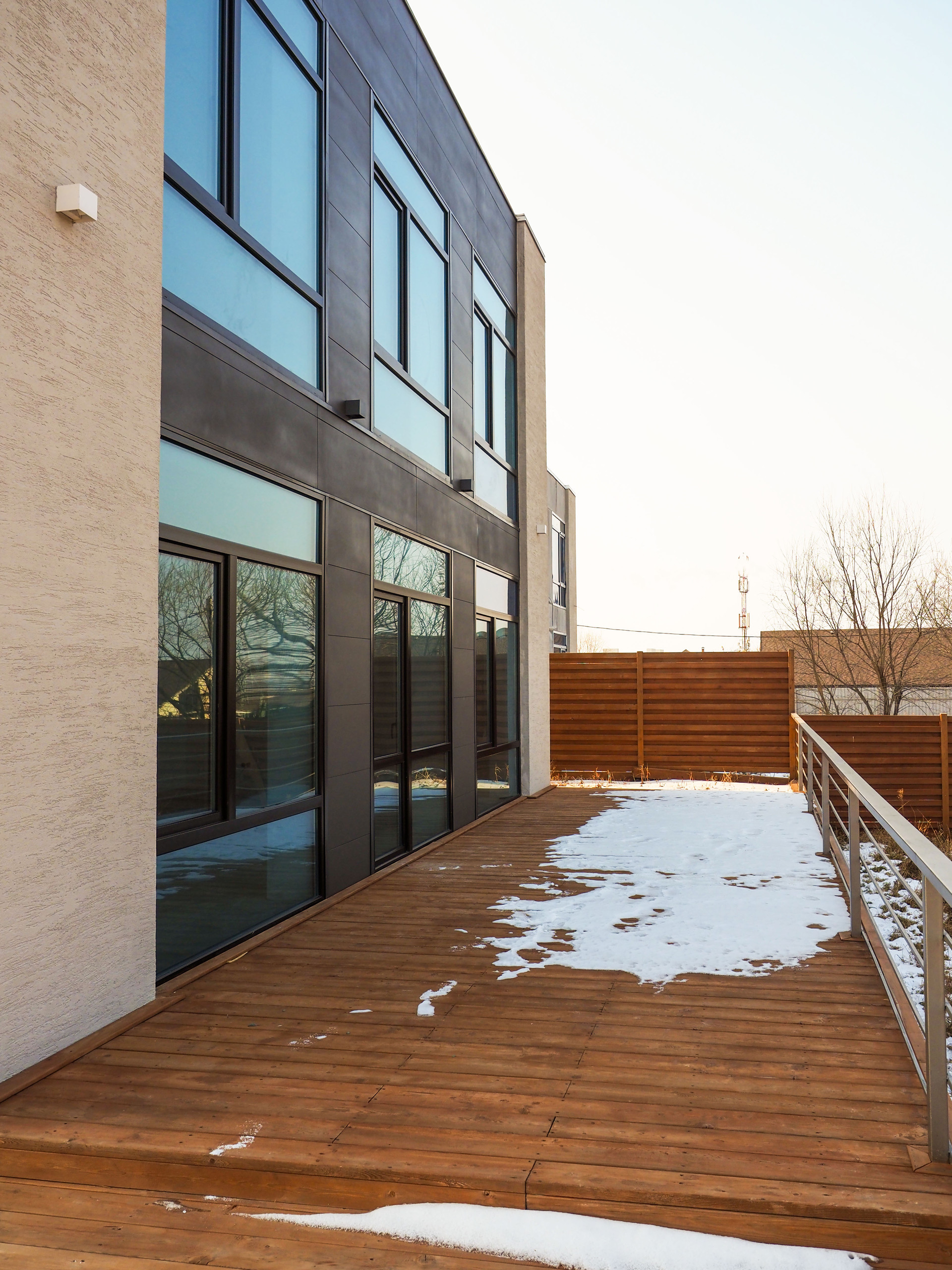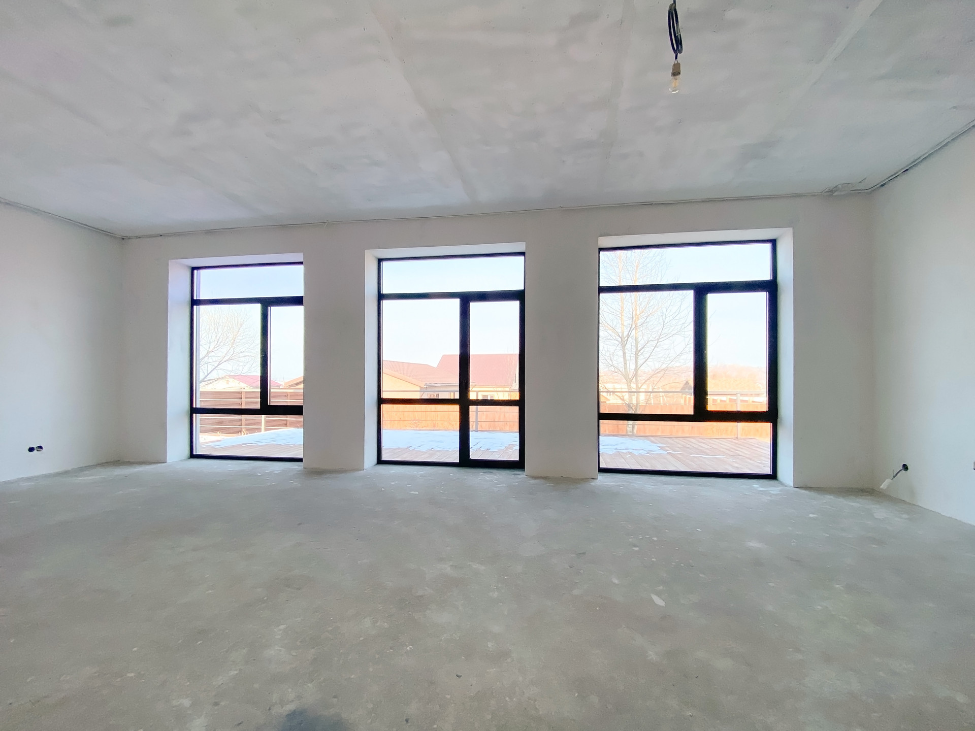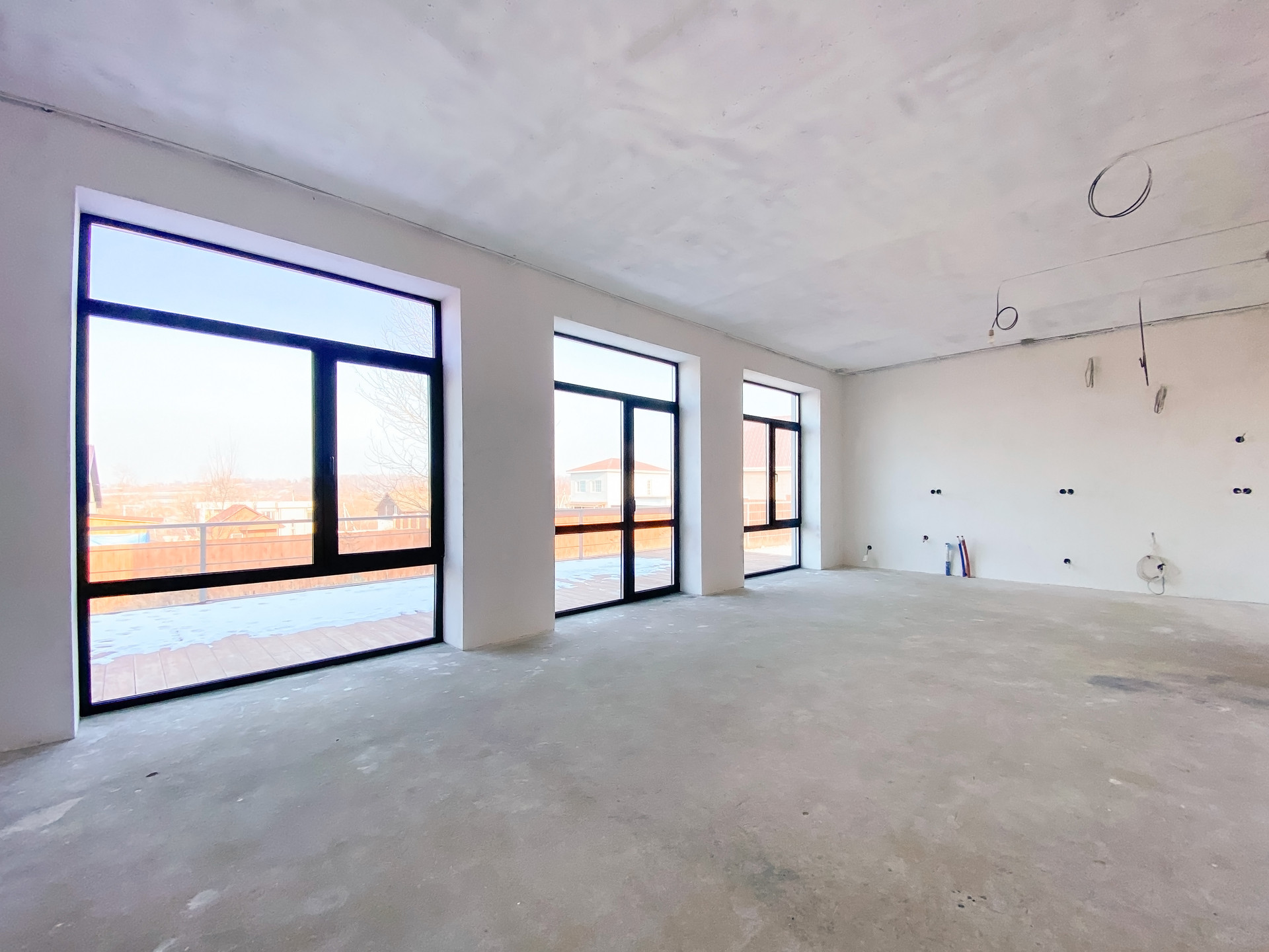 Прихожая, техпомещение, большой санузел и большая кухня-гостиная с витражными окнами и выходом на террасу с деревянным настилом. Площадь террасы 30 м2