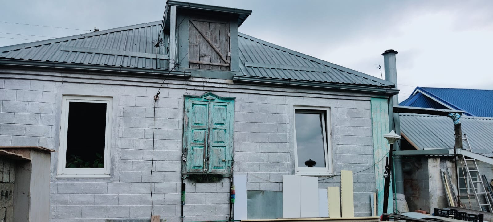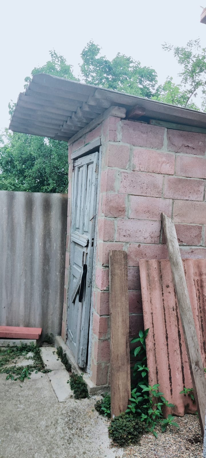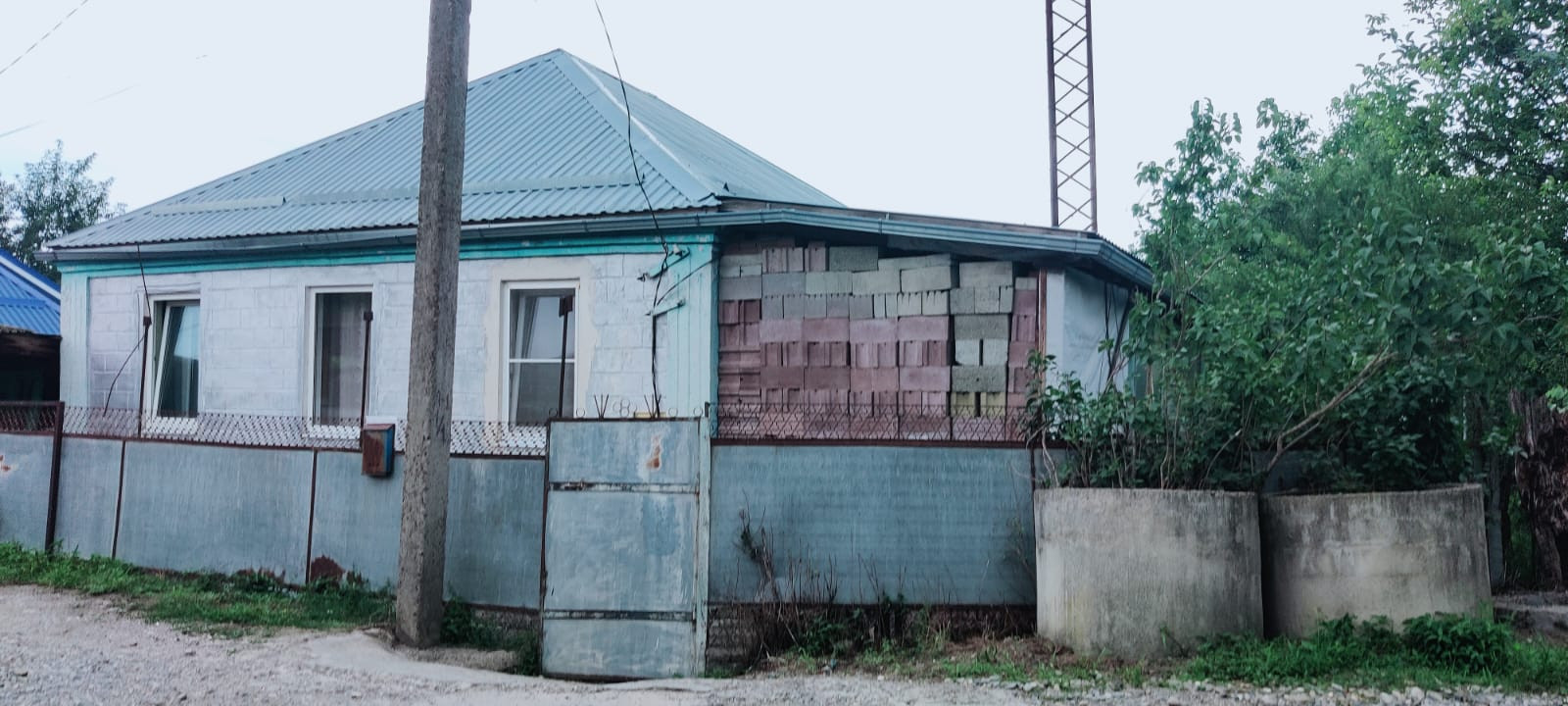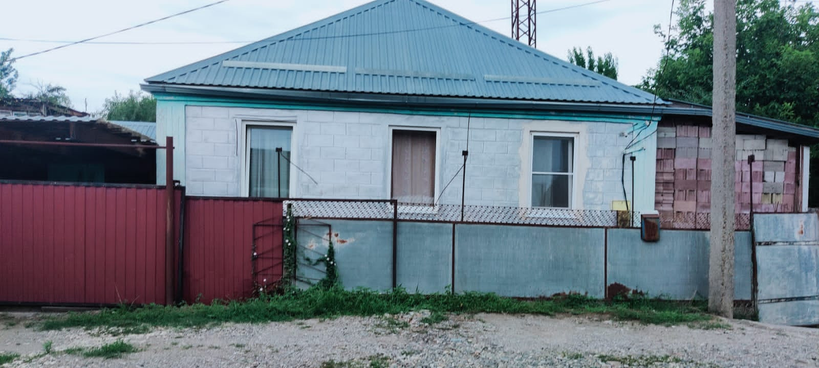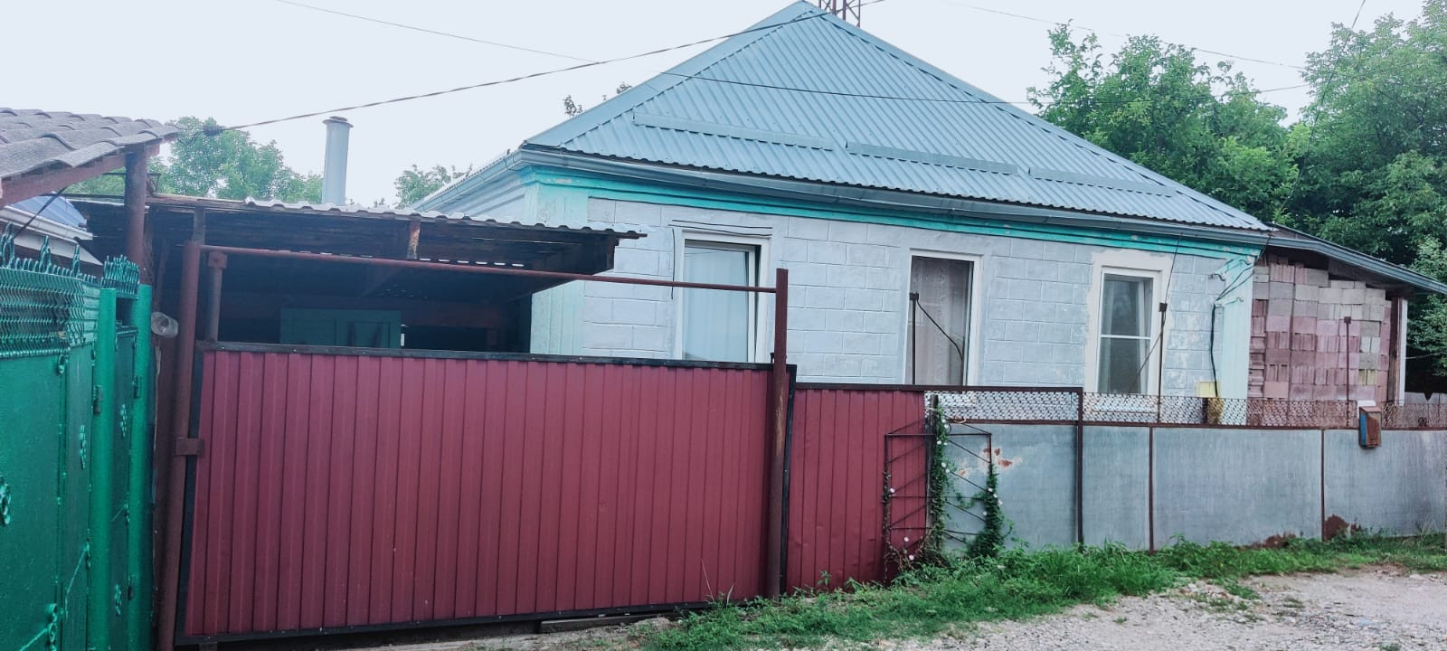 Прямо с домом навес-гараж, ворота на въезд сделаны. На остальной забор профнастил куплен.