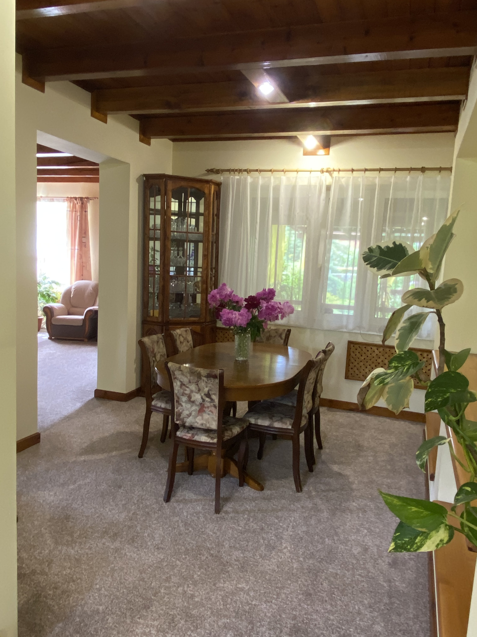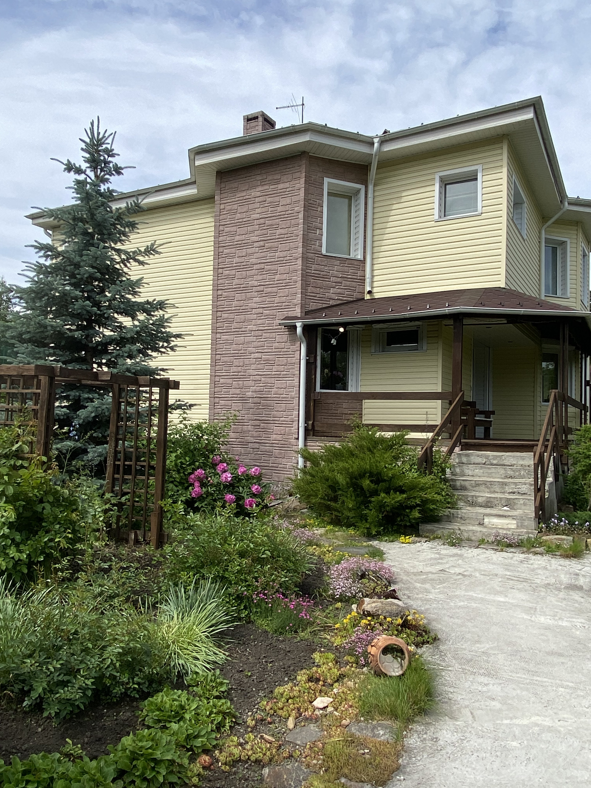 Участок благоустроен: хвойные деревья, фруктовые, газон, пруд с водопадом, теплица, гараж на две машины.