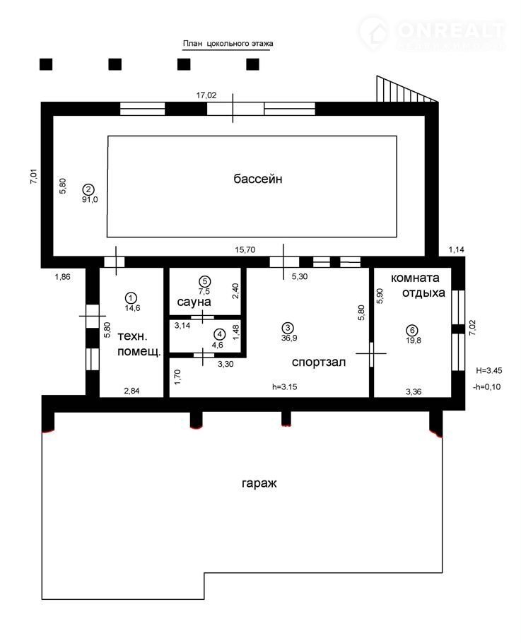 Цокольный этаж-бассейн,спортзал,саунакомната отдыха,,гараж,техническое помещение.