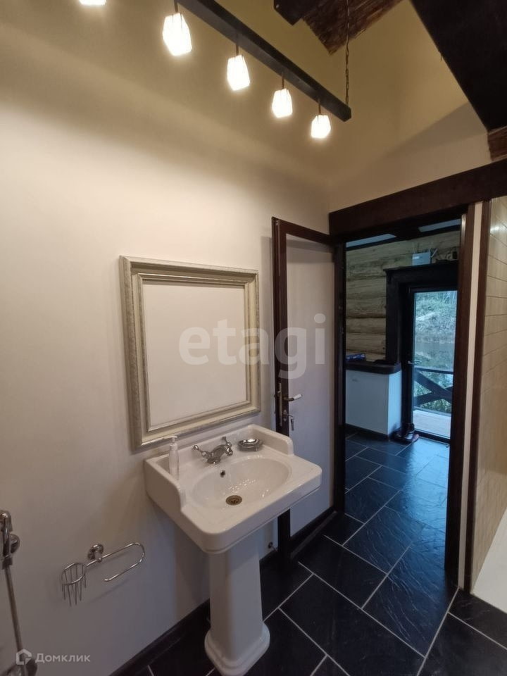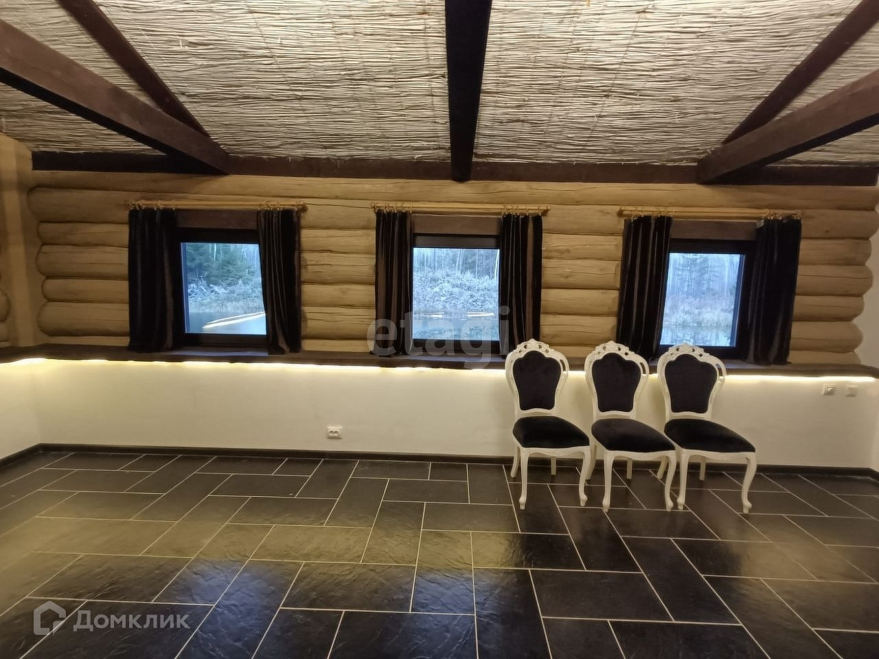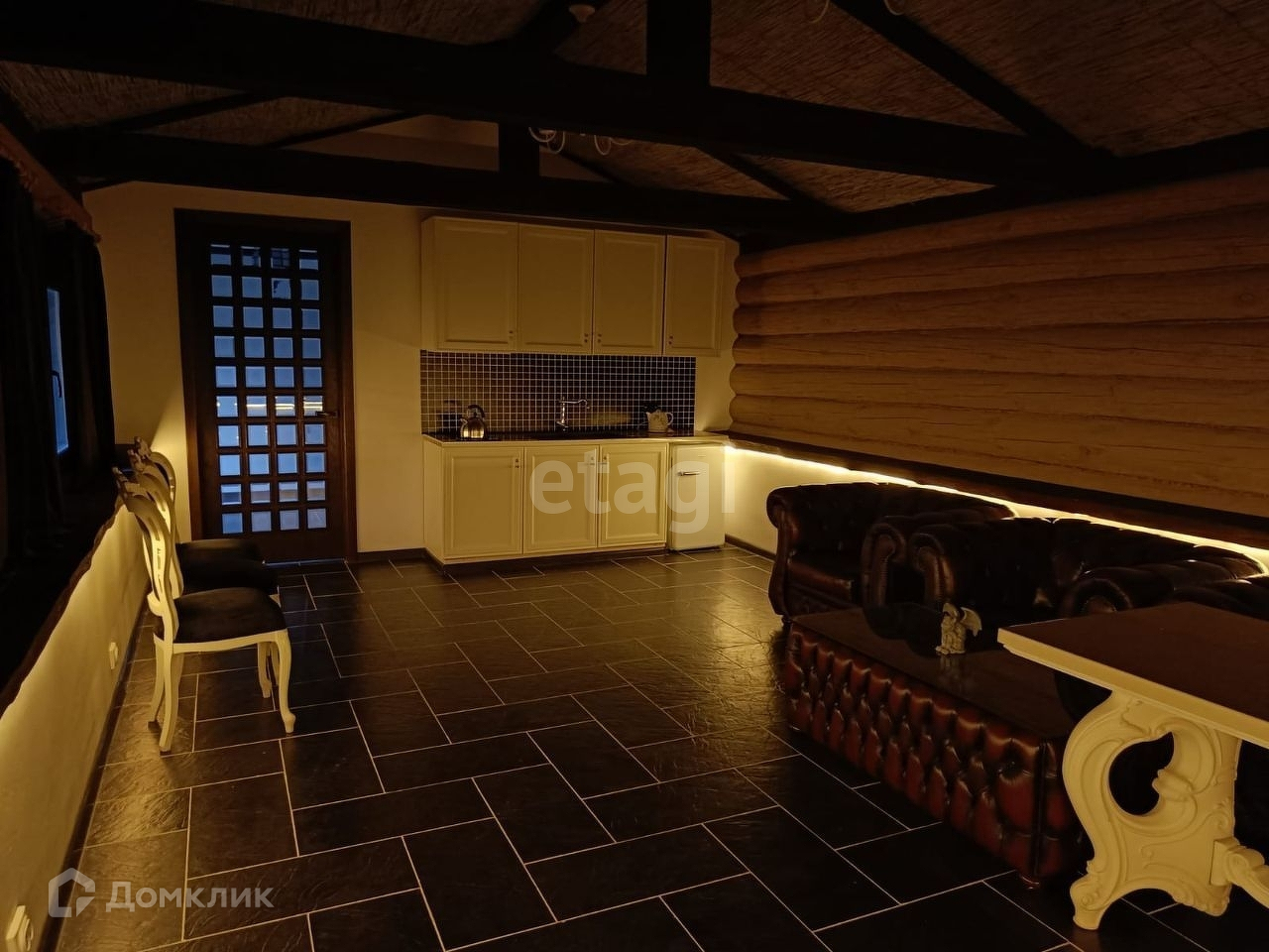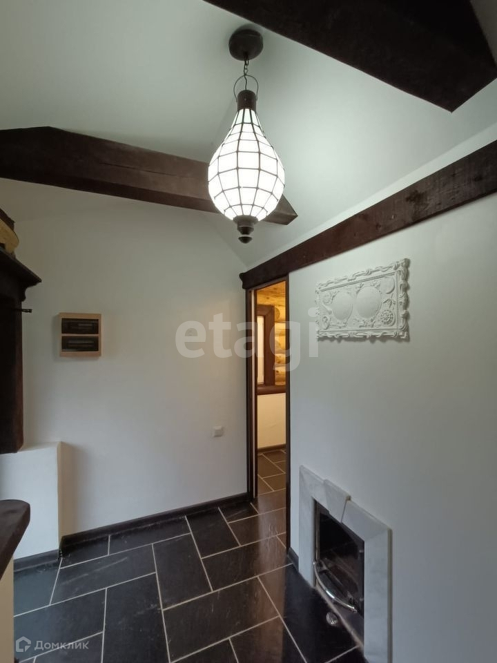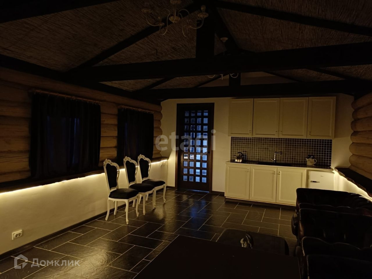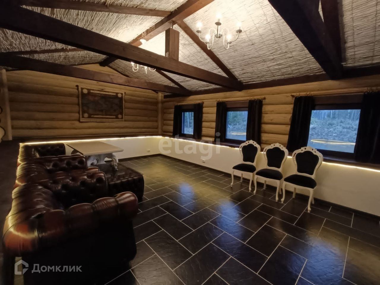 Деревянный дом ручной рубки-сборки из бревна диаметра 40 см, длинна бревен 12м. Дом выполнен в стиле шале. Стену зала украшает испанский гобелен ручной работы, полы выложены плиткой из испанского керамогранита, потолок дома украшен массивными балками и необычным решением стало это обшивка потолка из натурального камышового мата. Помимо основного освещения, вдоль зала вмонтирован световой кабель для оригинальной подсветки. Дом полностью готов и обустроен для круглогодичного проживания. Мы ценим пространство, поэтому дом выполнен с целью сохранить его и показать очарование дерева. Для отделки выбраны только дорогие и натуральные материалы. Цветовая гамма подобрана с использованием спокойных тонов. Все дорожки и площадки на участки залиты армированным бетоном. Ключевые элементы дома — деревянные балки. Они присутствуют не только на внешней стороне дома, но и на внутренней.