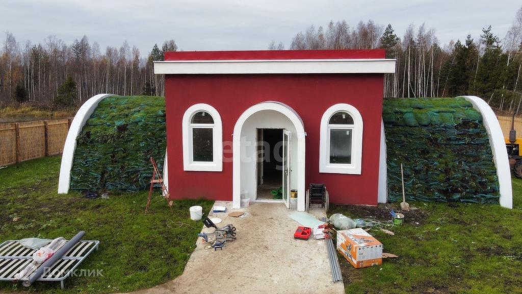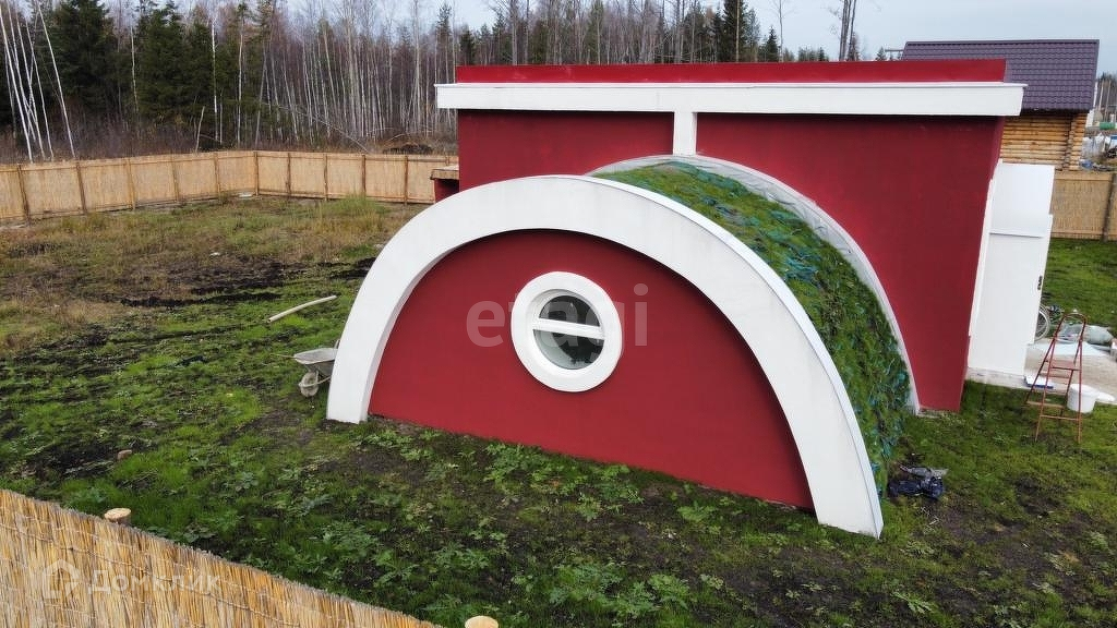 Продается необычный дом по адресу Московская область Дмитровский район поселок Участок №7. Дом теплый, для круглодонного проживания. На крыше дома имеется площадка, на ней будет газон, площадку можно использовать. Участок 10 соток, рядом есть водоем. Наличие общественного транспорта до г. Дмитров.