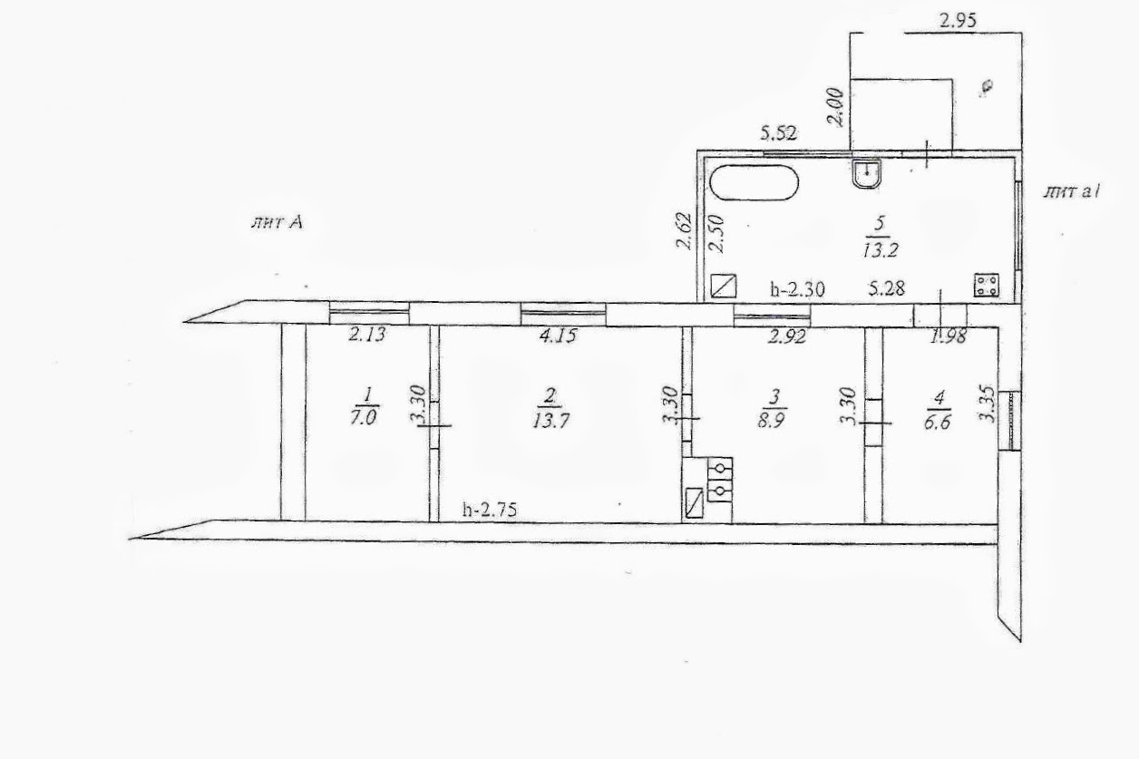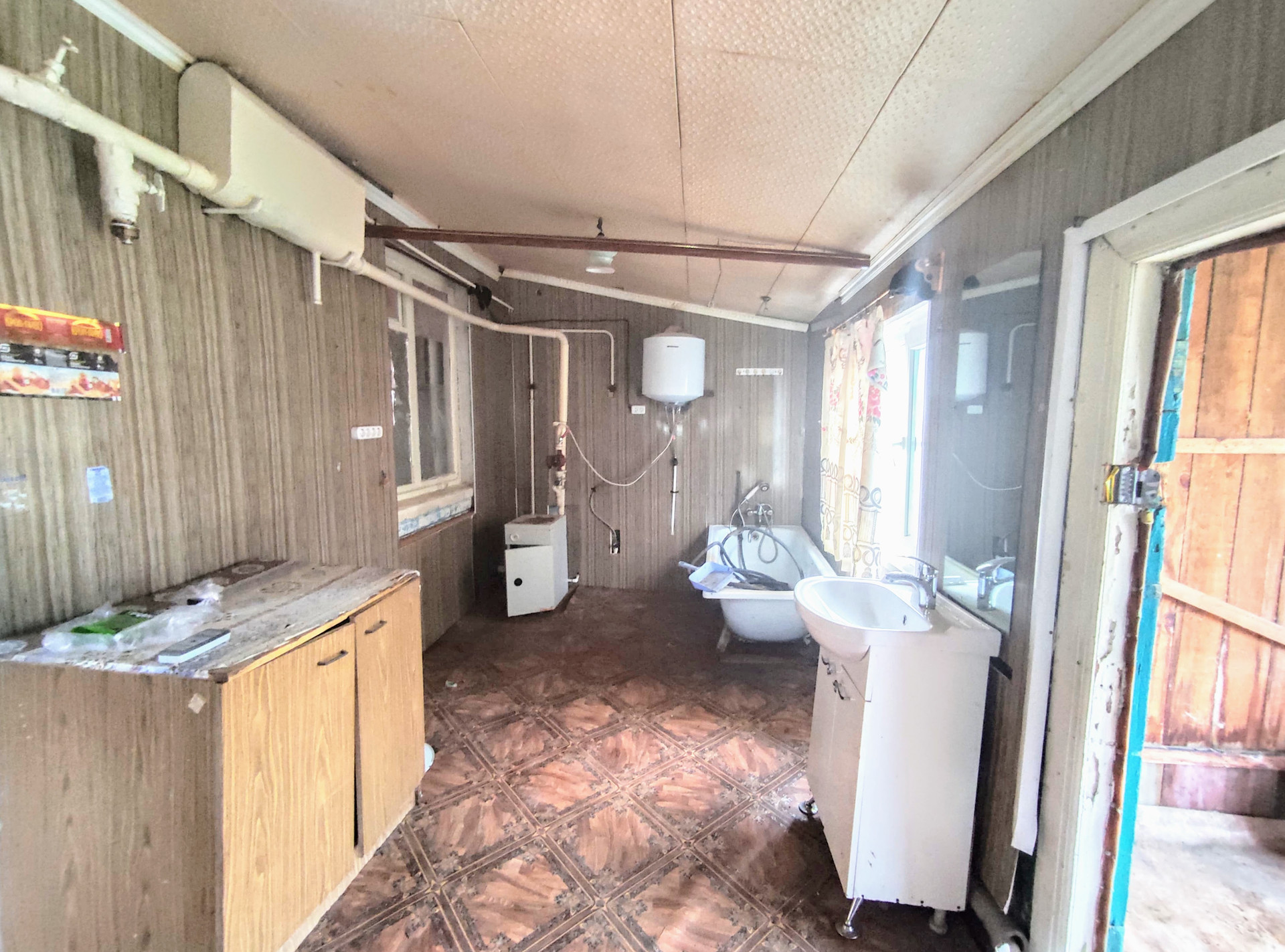 Состоит трех жилых комнат смежно-раздельного расположения, кухни и коридора. На стенах обои нейтральных цветов, потолочная плитка, полы застелены листами ДВП. В кухне стены обшиты пластиковыми панелями, потолочная плитка, полы застелены линолеумом. В кухне установлена ванная, есть место для установки унитаза. Установлены металлопластиковые окна и двери. Счетчики на все коммуникации. Бойлер. Отопление - напольный газовый котел. Входная дверь - деревянная. Перед входом в дом построен навес.