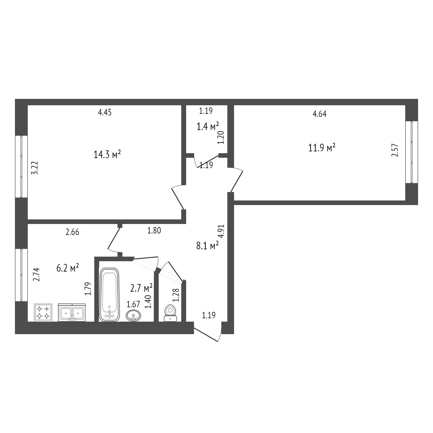 Общая площадь 45.7 м2