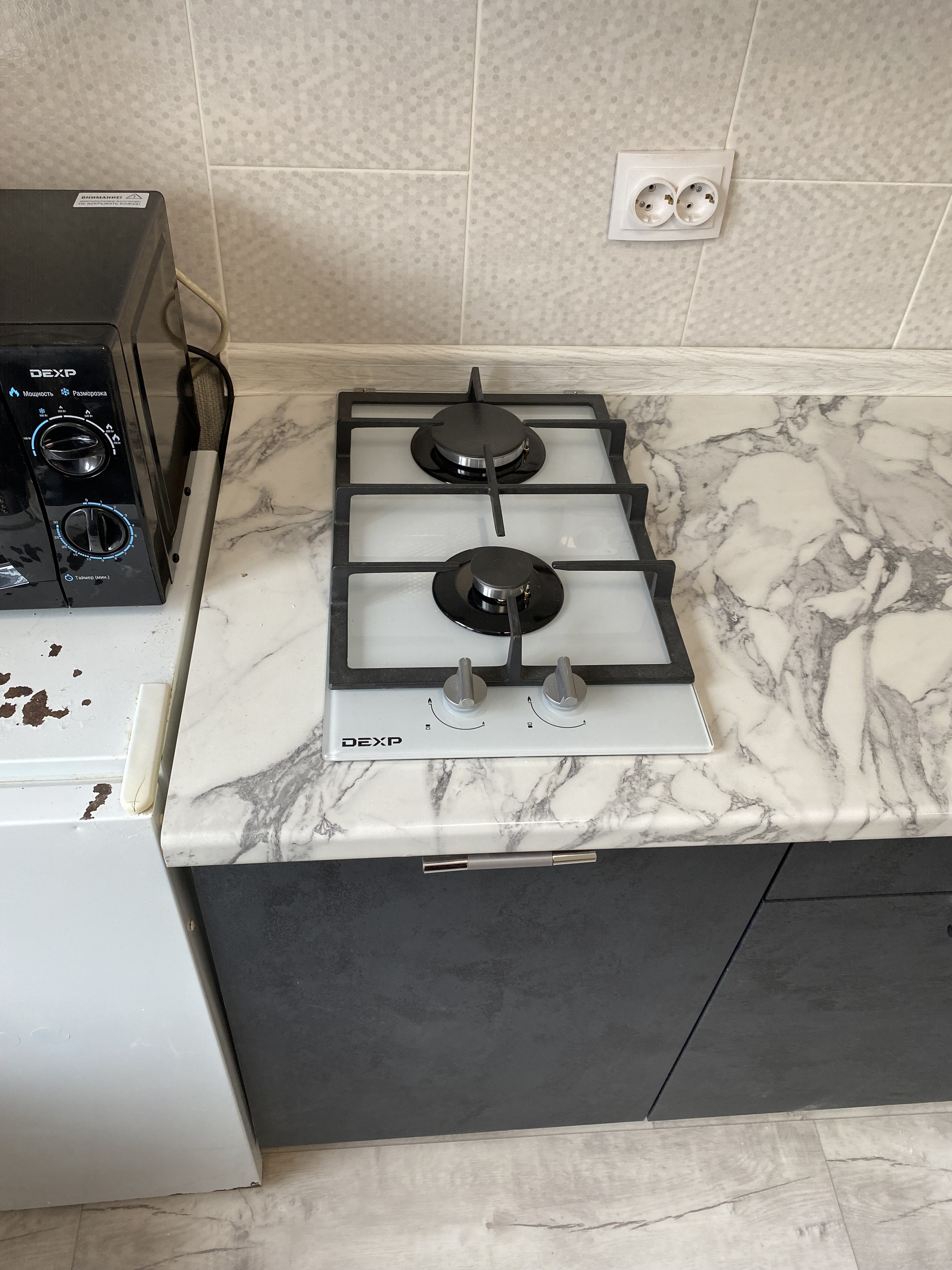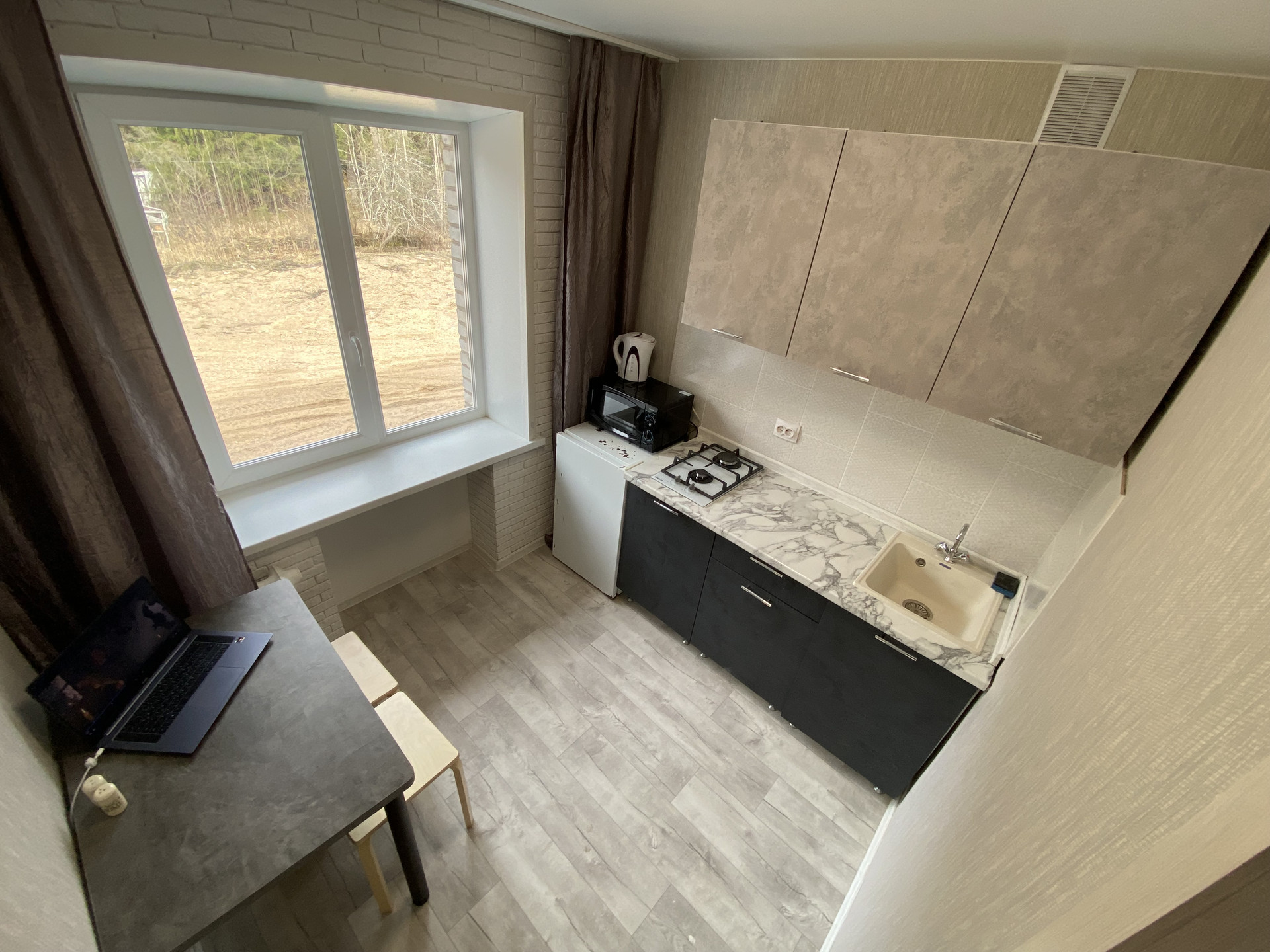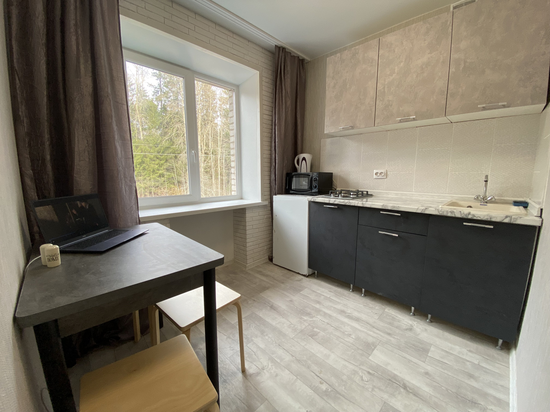 Кухня:  кухонный гарнитур,  газовая плита, стол,  холодильник, микроволновка, чайник, посуда,  газ болон.