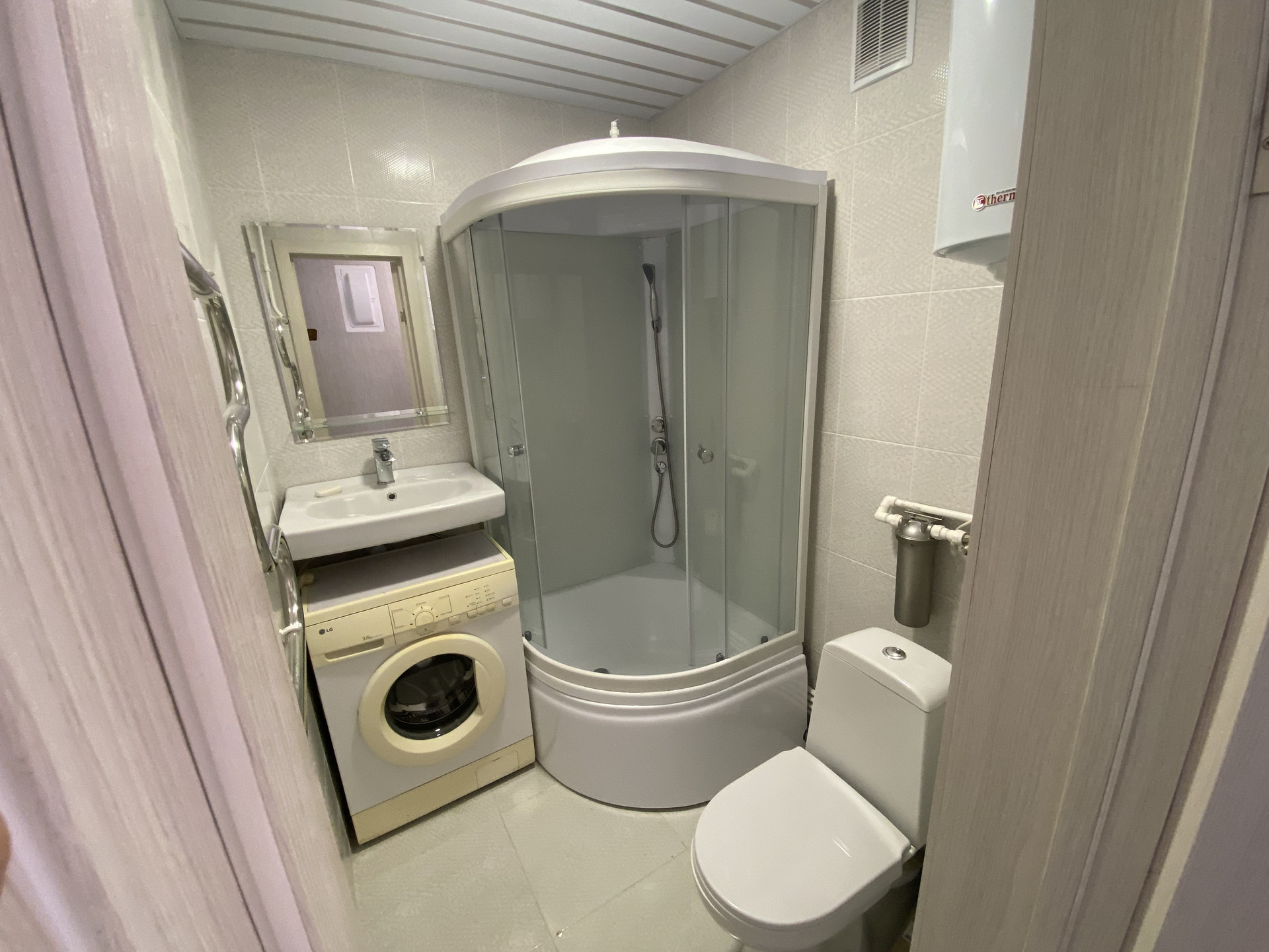 Ванна туалет: совмещенные, пол стены плитка, бойлер 150 литров,  стиральная машина, душевая кабина.