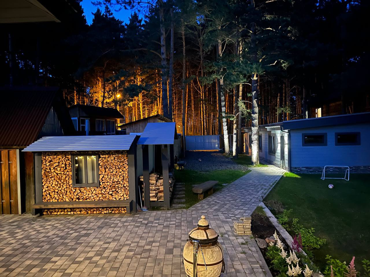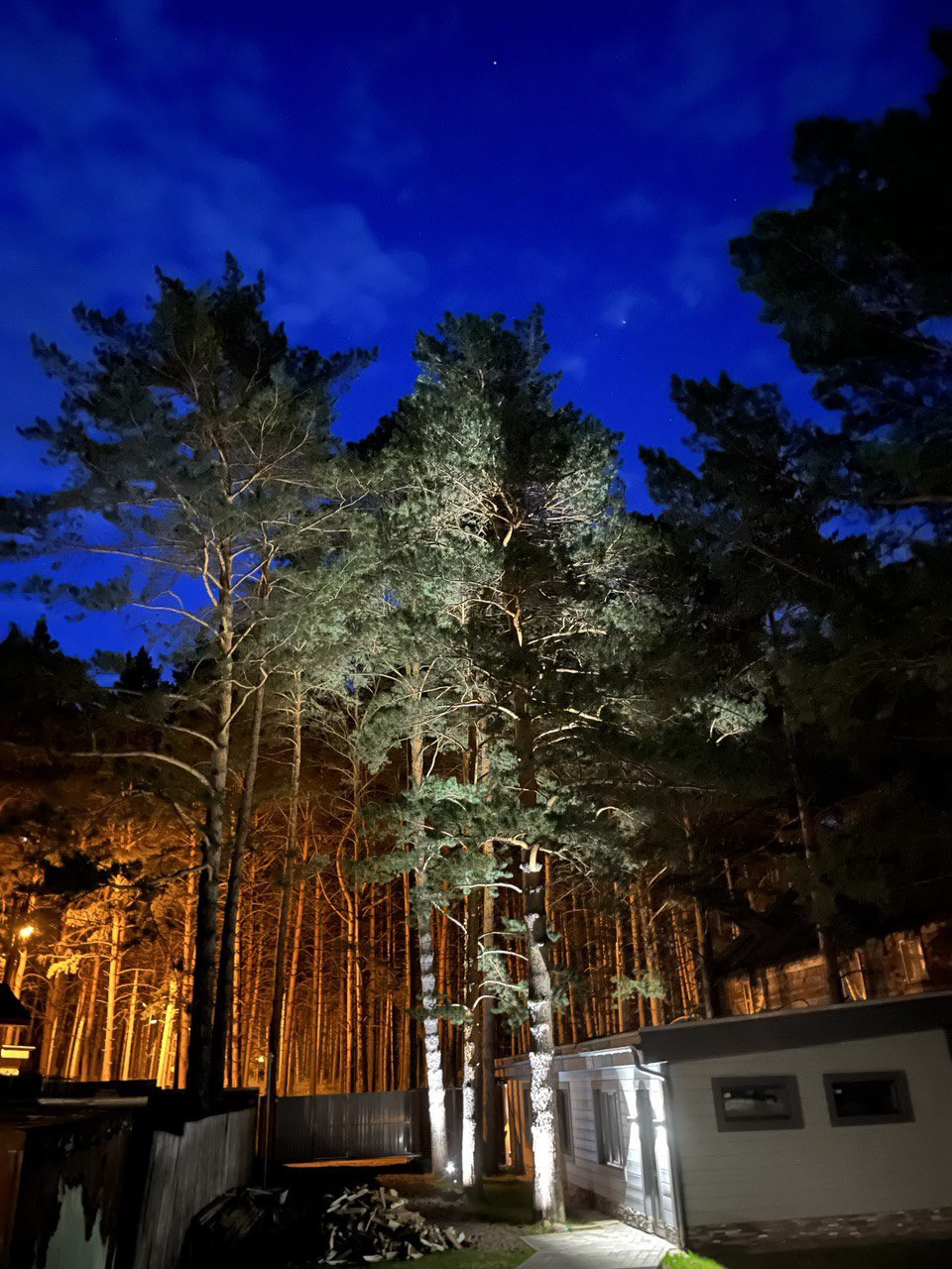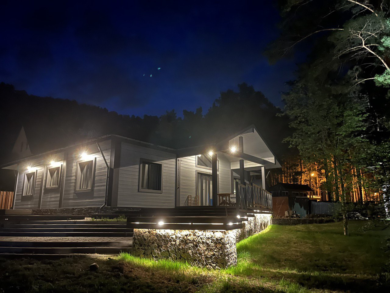 На участке 13 соток реализовано точечное освещение вековых сосен с каскадной террасой, выполненной из ступеней лиственницы, переходящих в ступени из брусчатки. Освещение входа и въезда в гараж. Освещение дома по периметру. Установлены откатные электрические ворота.Видеонаблюдение.