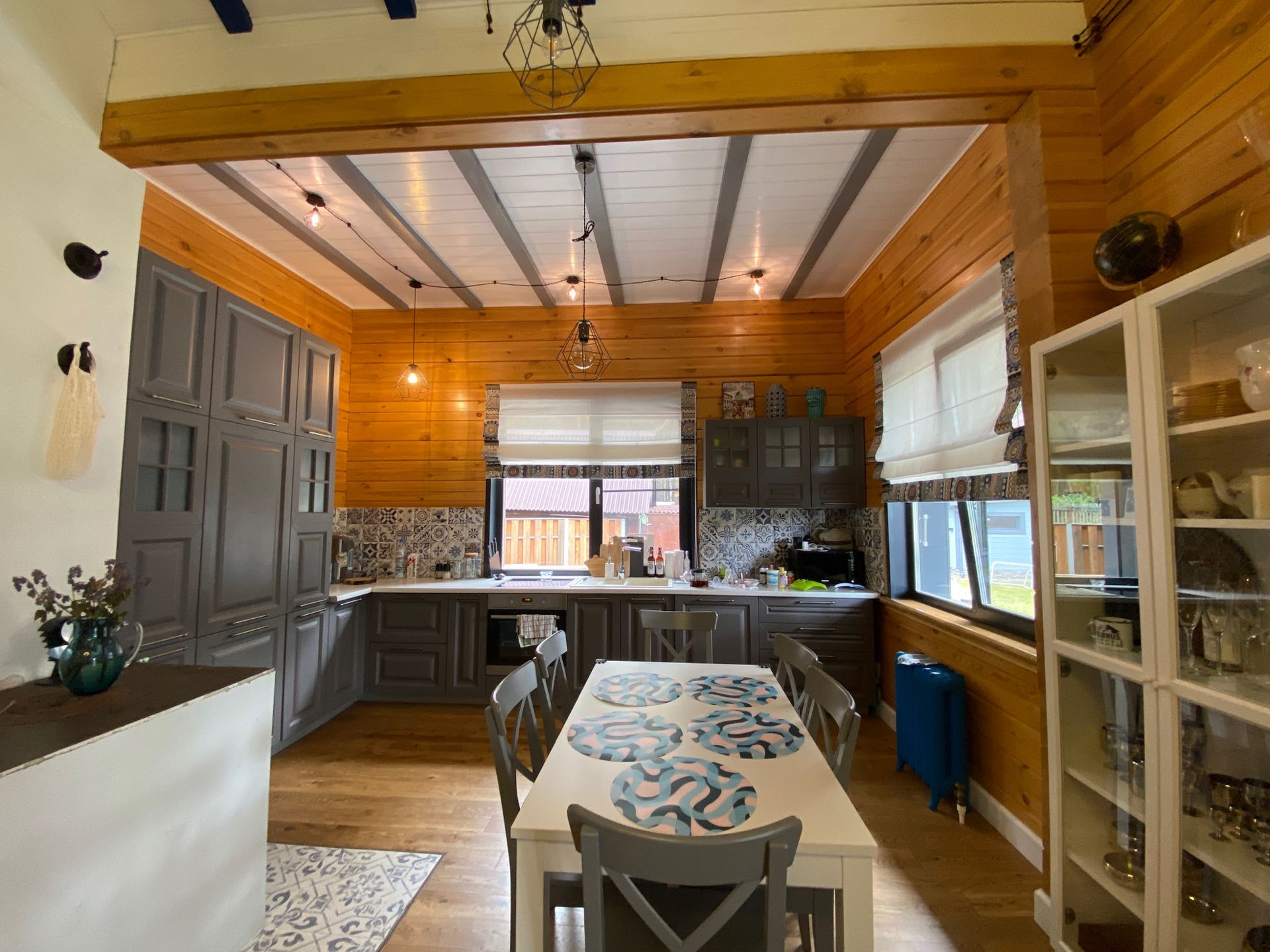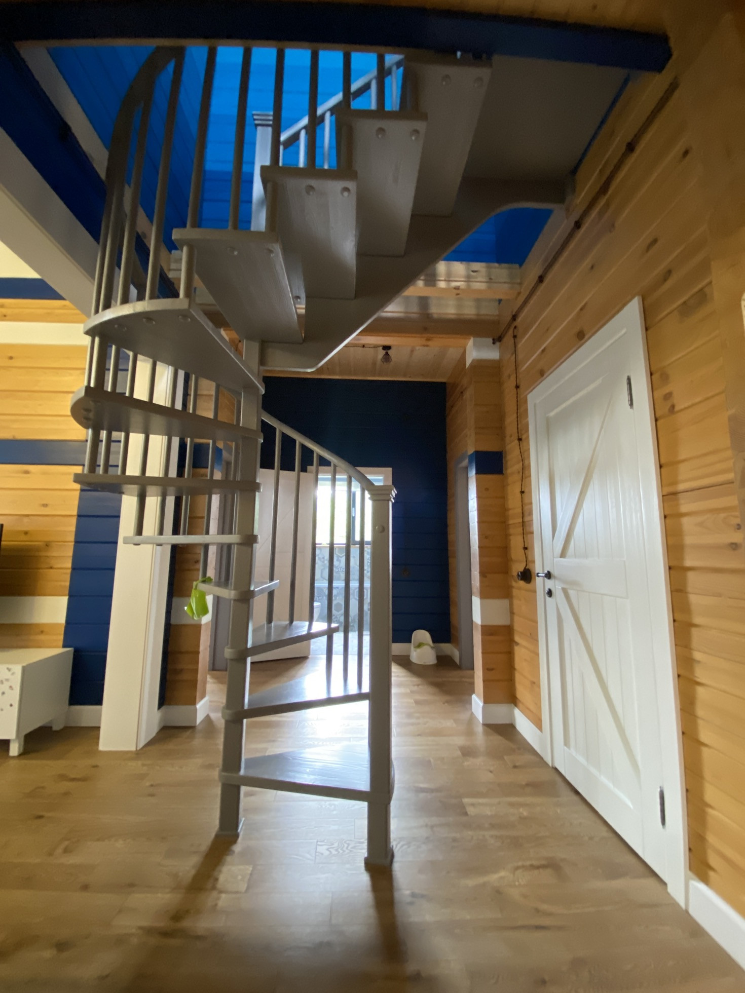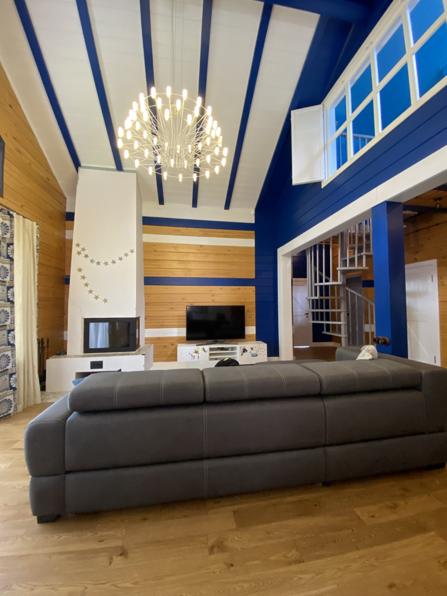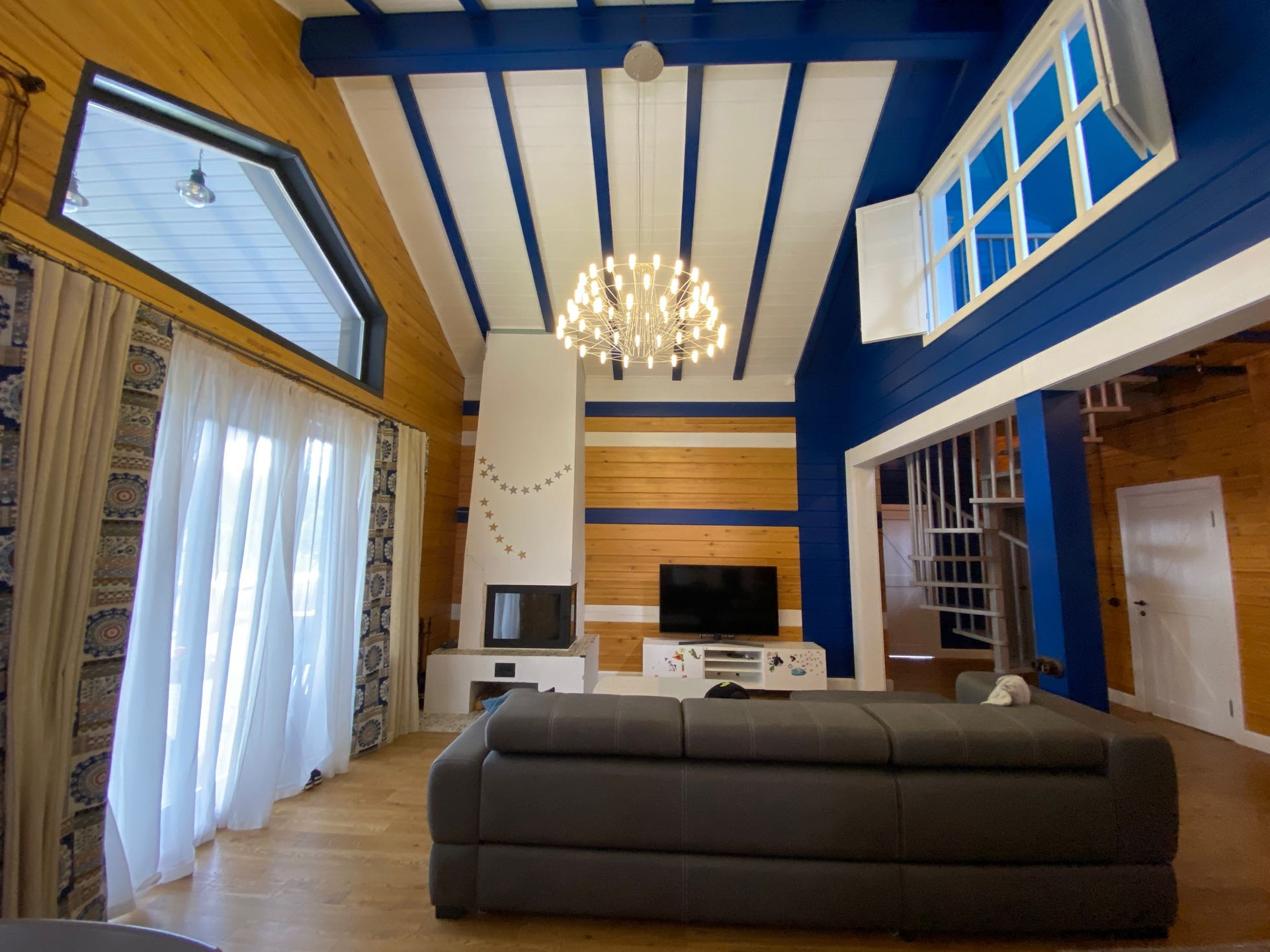 Первый этаж- это открытое пространство кухни (16 м2), столовой и гостиной с винтовой лестницей на второй этаж. Гостиная (60 м2) с высотой потолка 5,5 м, с окном во всю стену и вторым светом. Отдельные помещения на 1 этаже: три спальных комнаты, 2 ванных комнаты, прихожая,