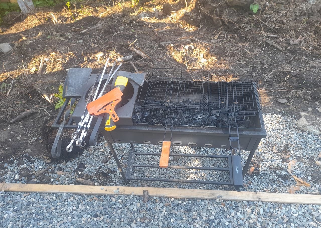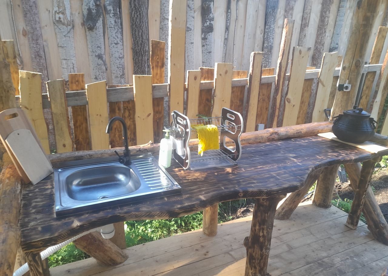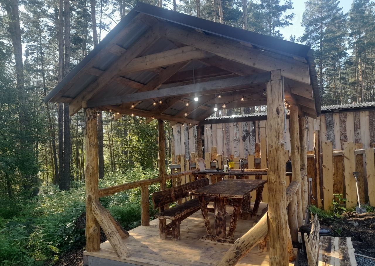 Беседка-летняя кухня имеет умывальник, столешницу, свет, большой стол и лавки из массива сосны. имеется мангал, вся необходимая посуда для приготовления пищи на костре и углях! все очень удобно и красиво.