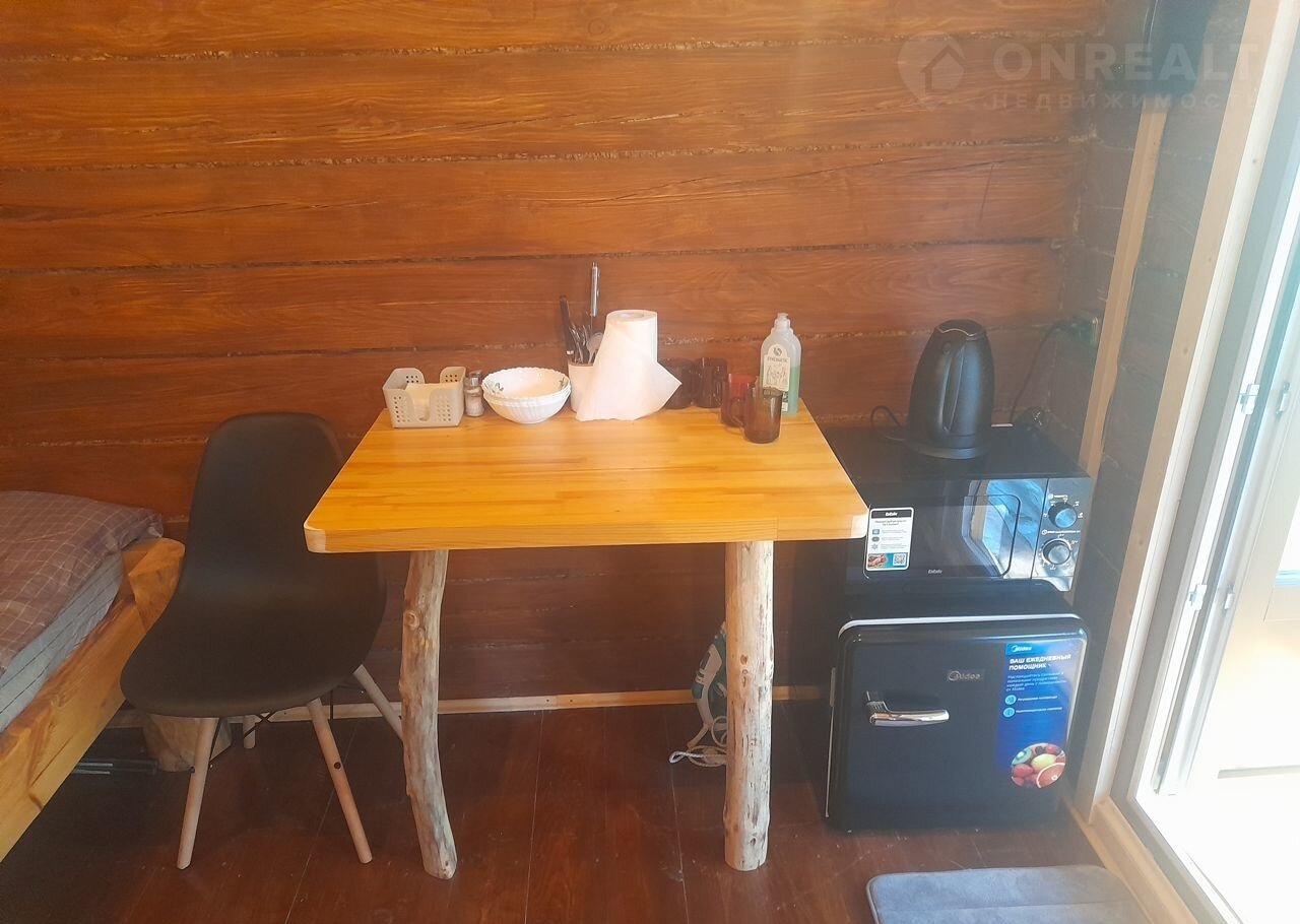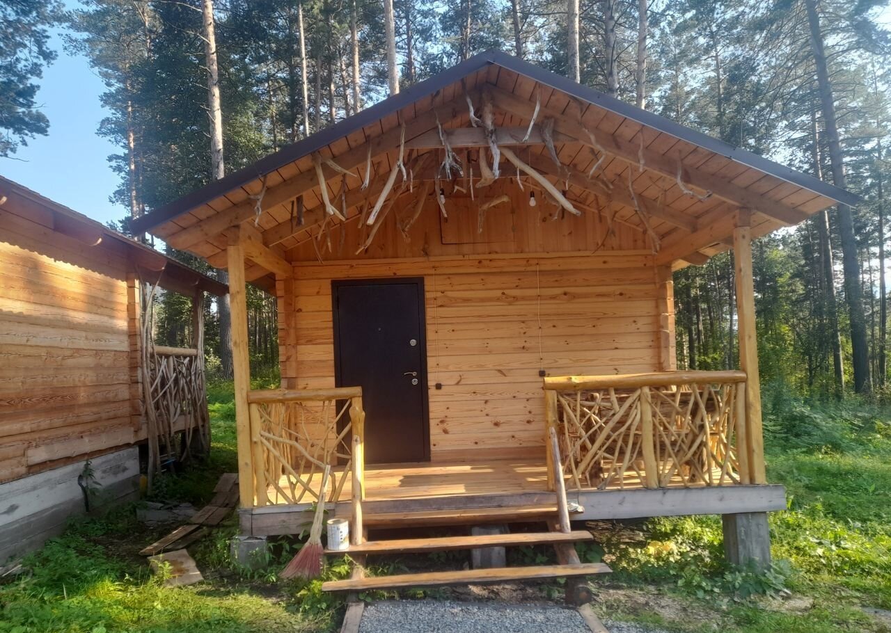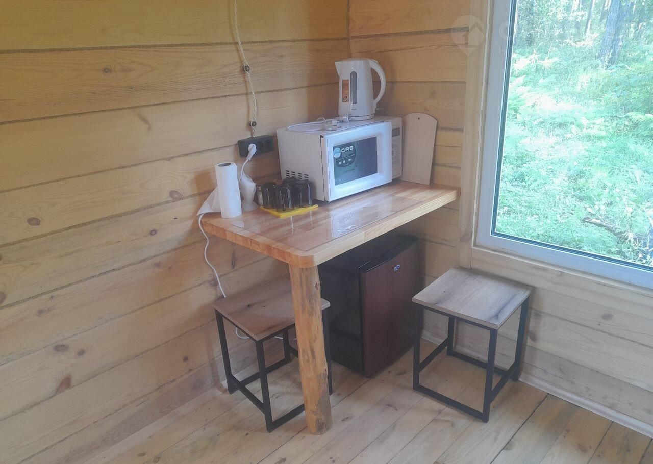 В домике (сосновый) большая 2х спальная кровать из массива сосны, отдельная односпальная кровать, стол, стулья, холодильник, микроволновка, чайник, холодная и горячая вода, фен, душ, все удобства, полотенца, мыльные принадлежности посуда! имеется терасса, стол и лавка, собственная мангальная зона с лавкой и мангалом.