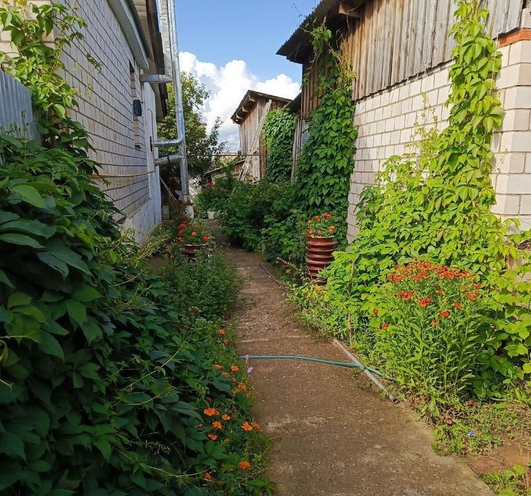 Общая площадь участка 7,5 соток, огорожена забором из профнастила. Облагороженная дворовая территория с кирпичным гаражом и баней, ухоженный огород с плодовыми деревьями, есть теплица, которая остается новым хозяевам, по територии огорода проведен летний водопровод. Есть сухое подполье с дополнительным доступом через улицу.