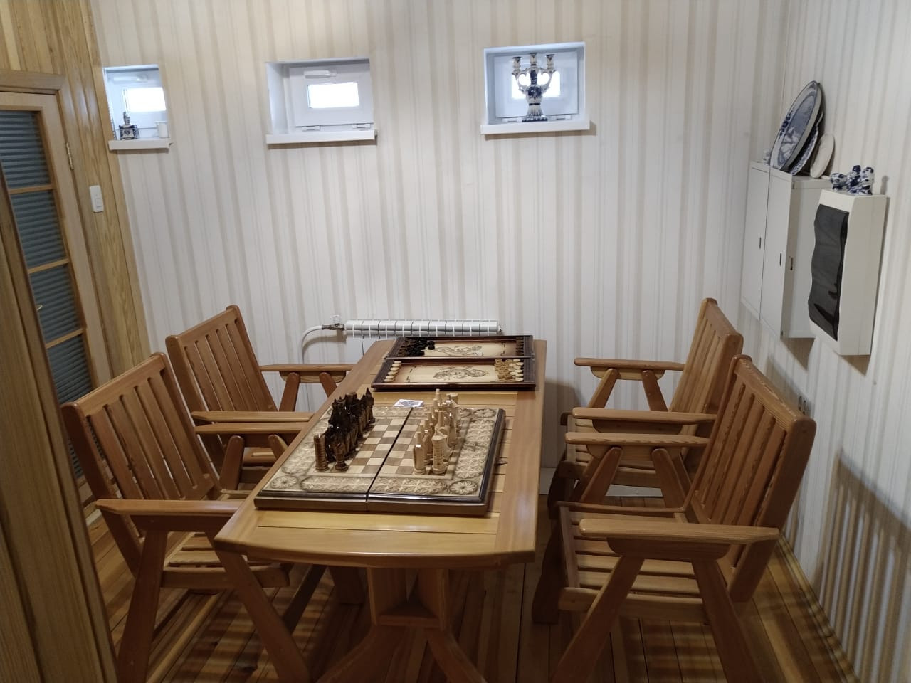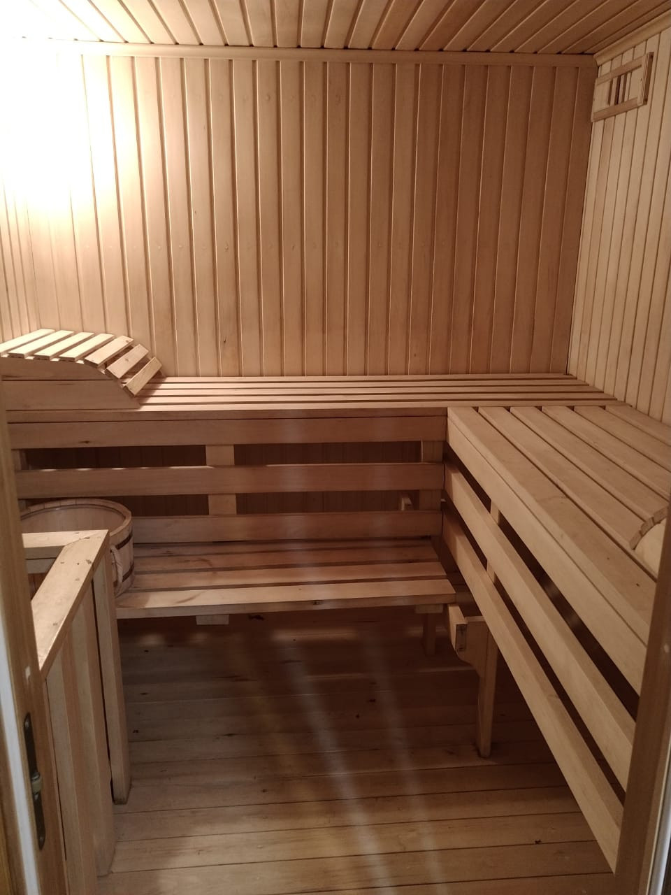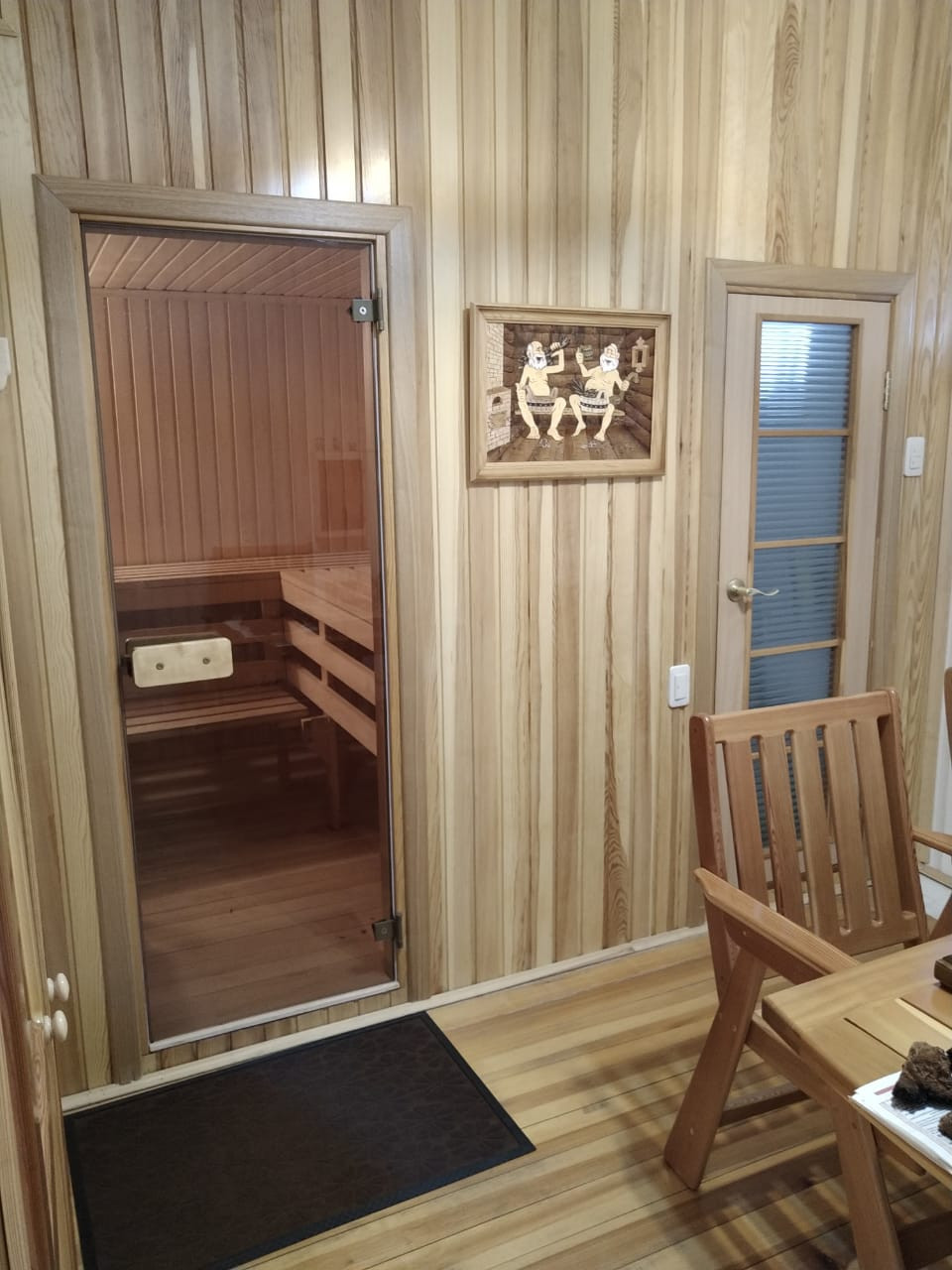 Сауна с комнатой отдыха находится в доме. Имеется третий (с отделкой под дерево) и цокольный этаж. Камин настоящий в гостиной комнате.