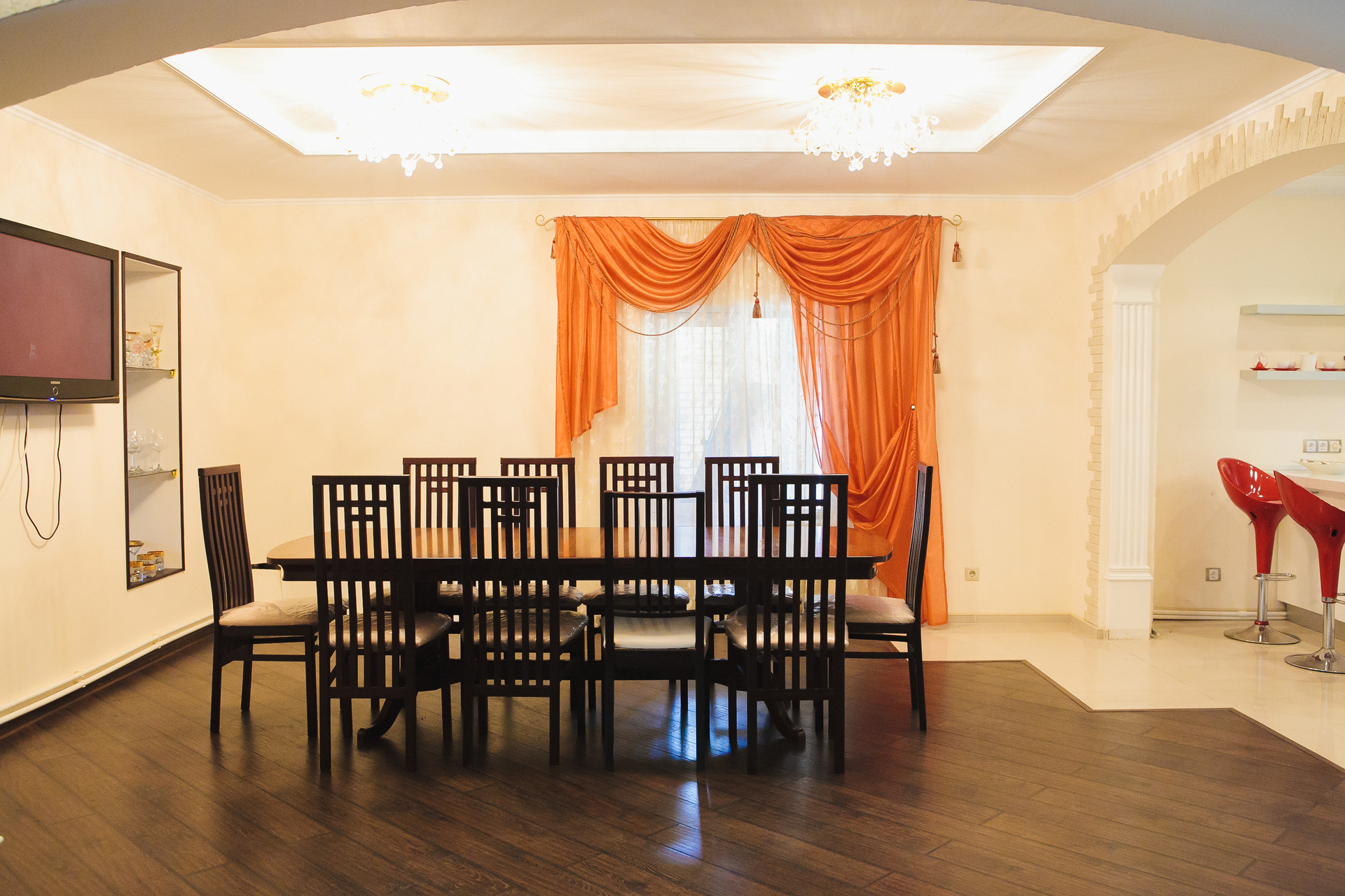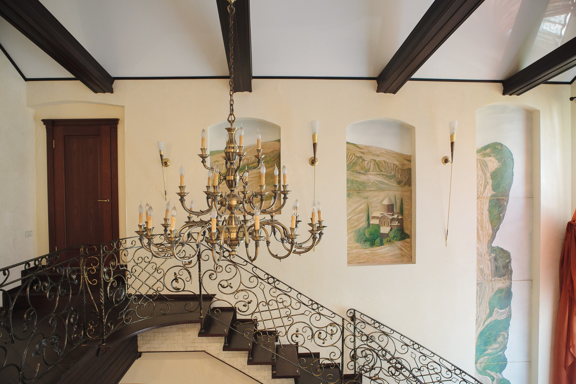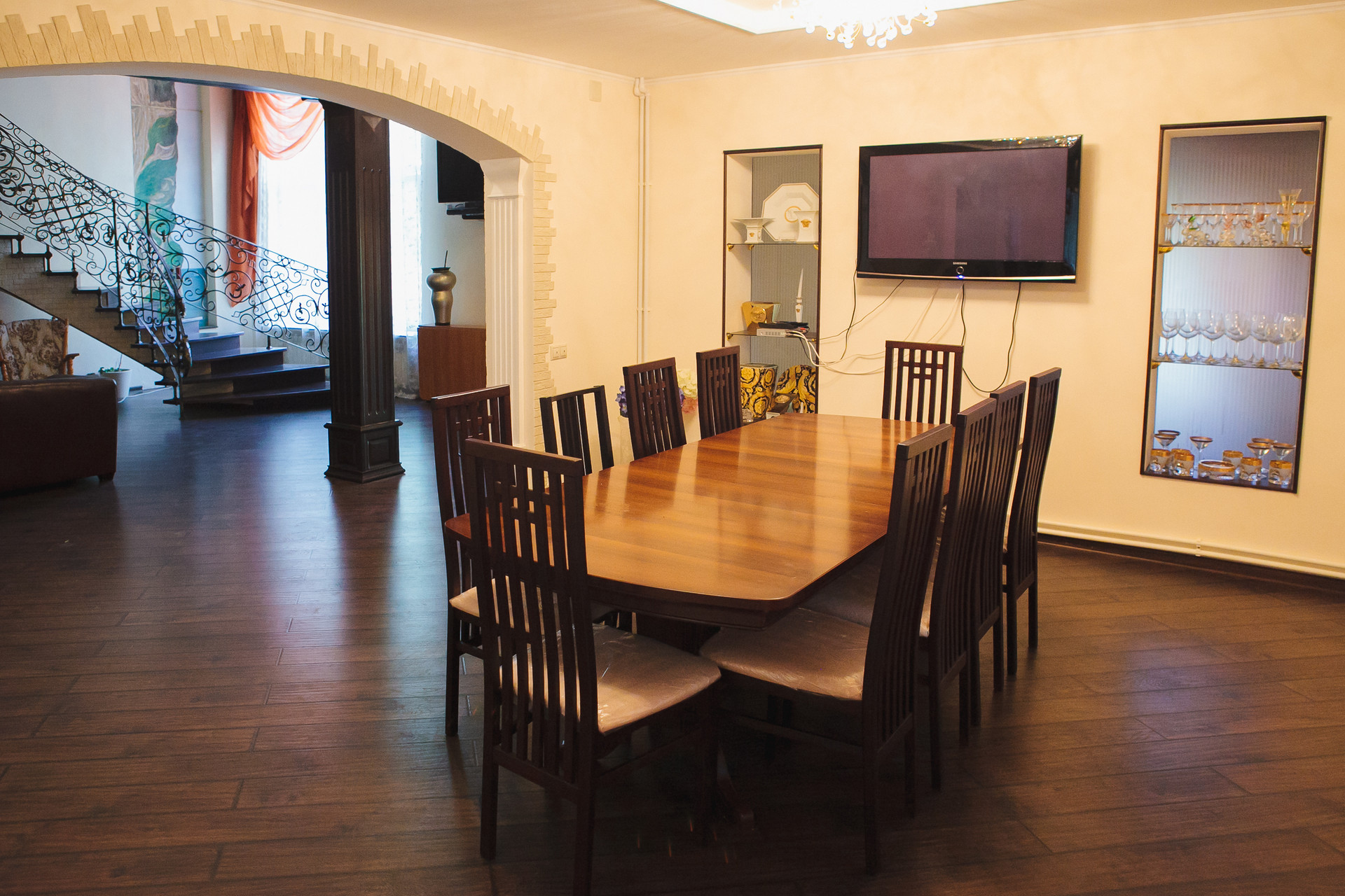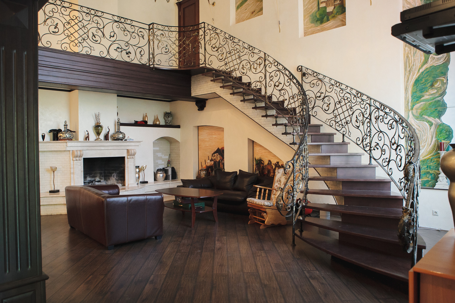 На первом этаже дома расположены: просторная гостиная с камином из белого мрамора, красиво дополненным кованными перилами лестничного марша, большая столовая с обеденным столом и стильной кухонной зоной, оснащенной мебелью и техникой. Так же на первом этаже есть гостевой санузел, ванная и хозяйственная комната, комфортная SРА-территория с красивыми окнами, выходящими на цветущий сад, декорами на стенах в виде морского пейзажа, глубоким бассейном, просторной горячей сауной и бильярдной комнатой.