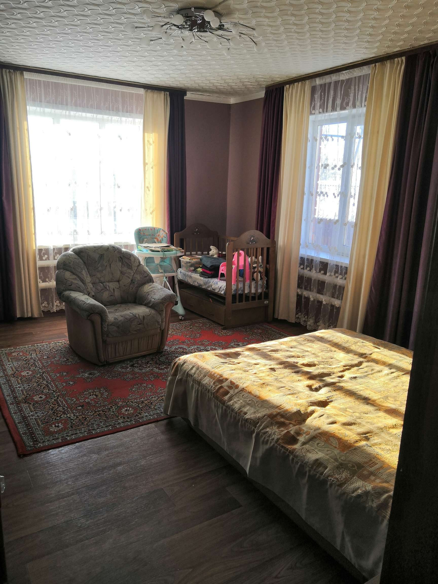 На первом этаже есть большой зал и три спальни. В зале лежит ломинат и тёплые полы электрические. В остальных комнатах качественный линолиум. Есть кондиционер. На втором этаже две комнаты. Второй этаж был жилой, но за ненадобностью, отопление там было отключено. При желании можно быстро подключить. Есть холодный и тёплый  коридор. В доме сделан ремонт, всё в приличном состоянии, только на кухне нужен небольшой косметический ремонт.