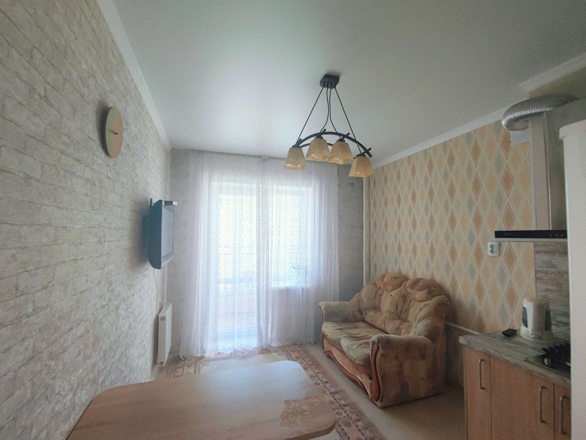 Комната и кухня расположены в противоположных направлениях, окна выходят на запад и на восток.