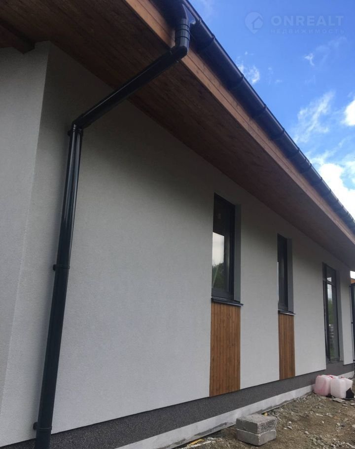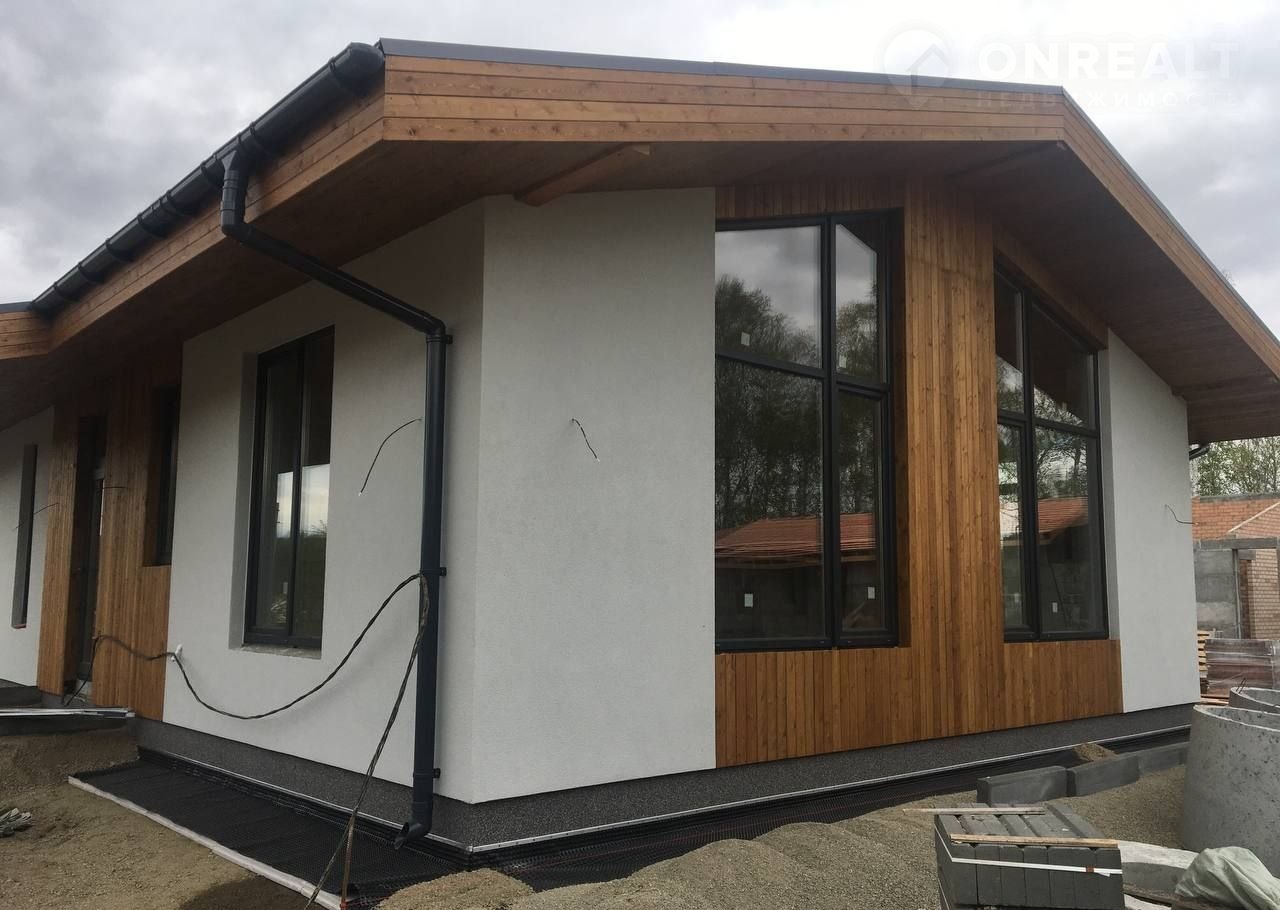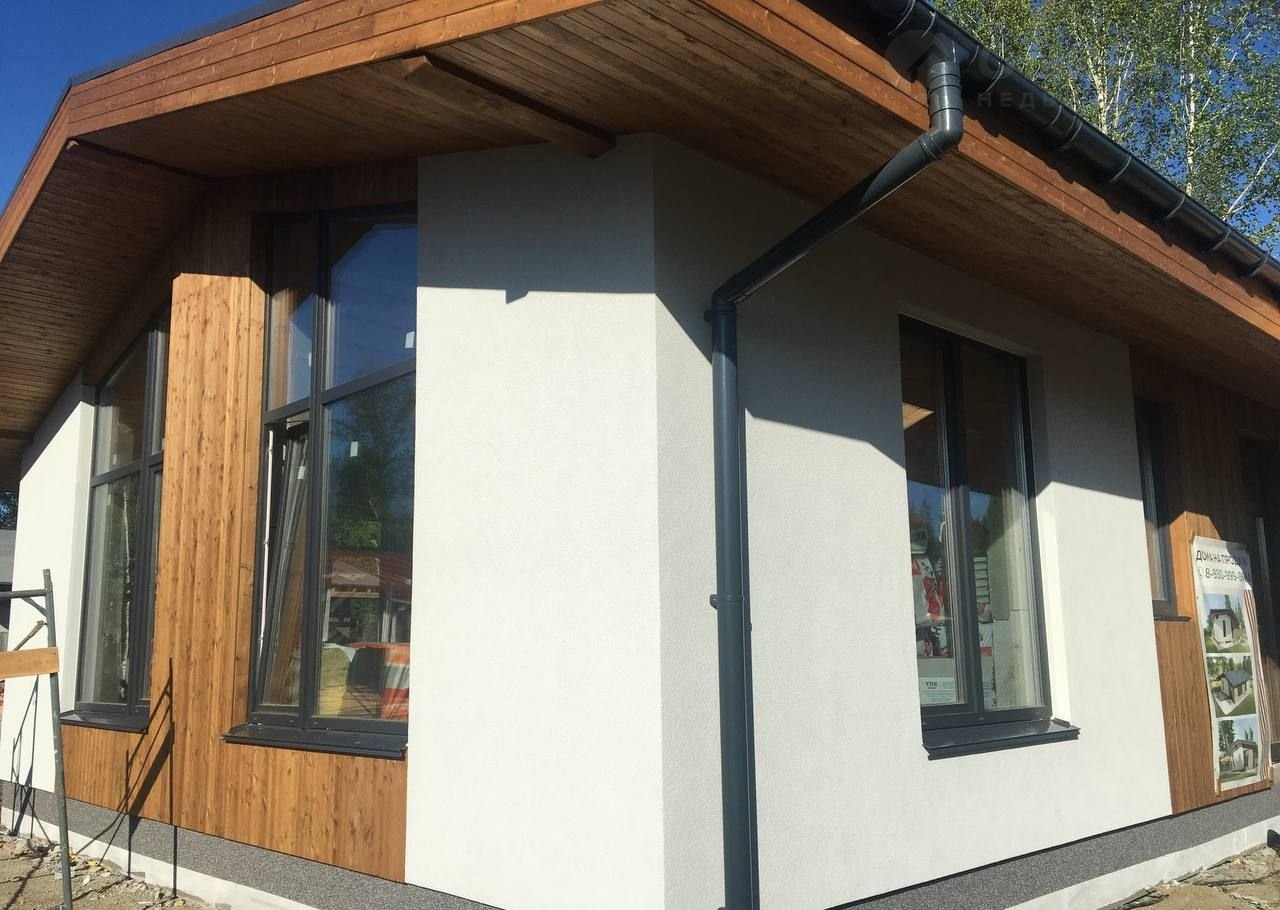 — Фасад: Отделка фасада выполнена с применением технологии "Мокрый фасад", выполненной по утеплителю- минплита 50мм, с армирующим слоем. По верх выполена декоративная штукатурка, а ниши отделаны фасадной доской "Планкен" из лиственницы. С такой отделкой фасадов, наши дома выглядят современно, лаконично и необычайно красиво. Высота потолков в доме от 3 м до 4.2 м, что даёт возможность реализовать современный и стильный дизайн вашего уютного дома.