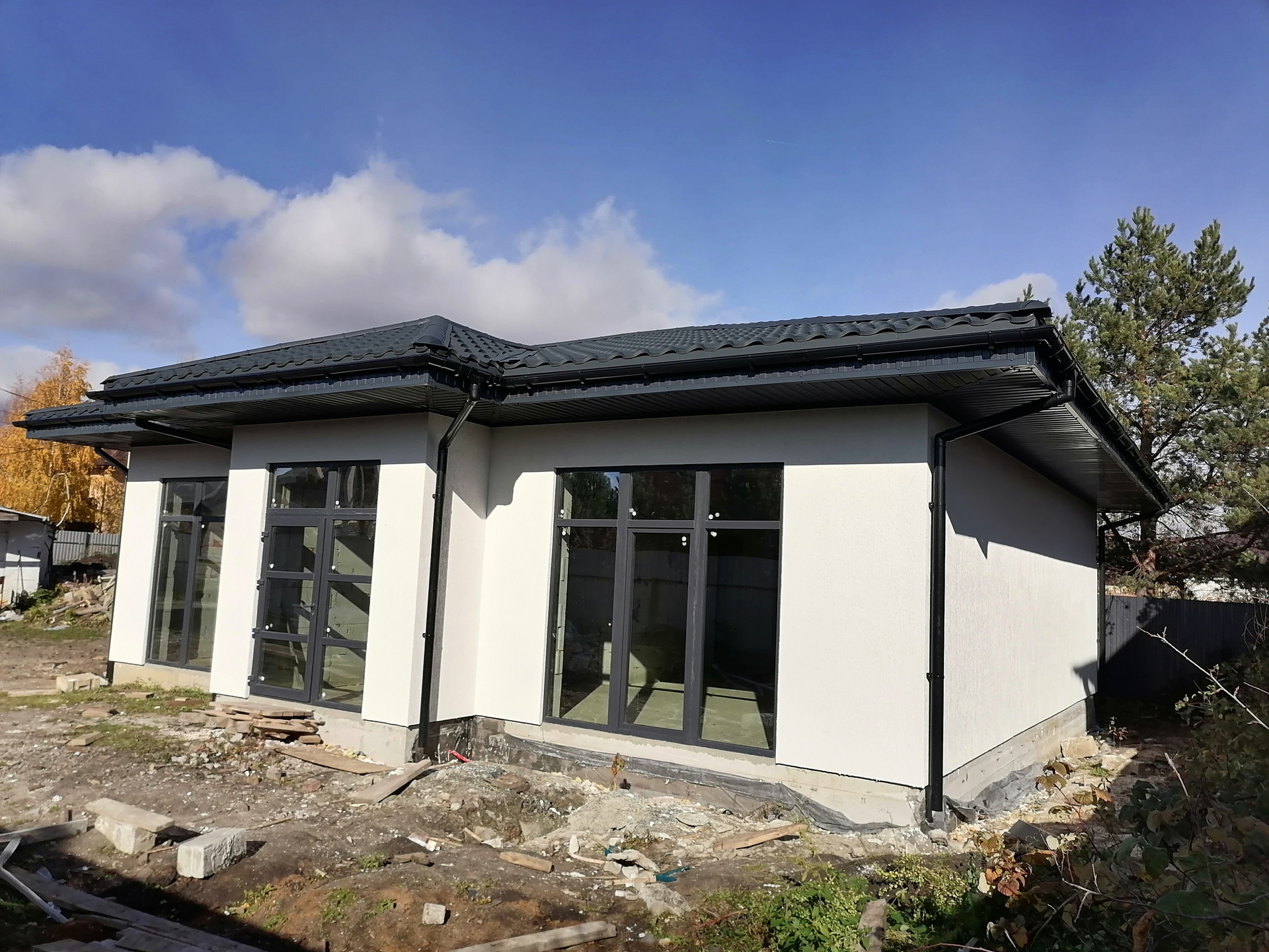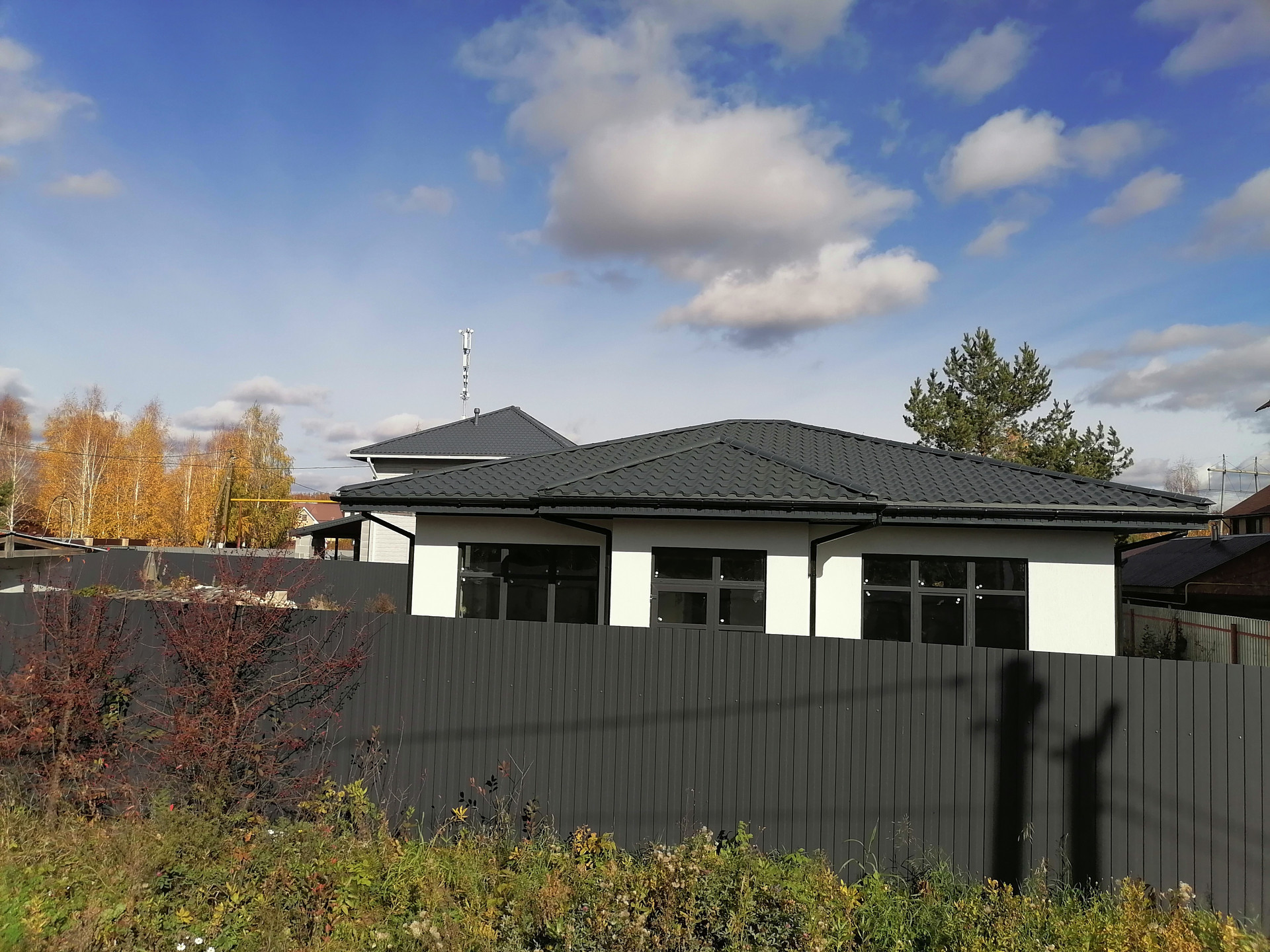 Фасад кануфер, теплые полы, крыша утеплена металлочерепица, отмостка по периметру дома.