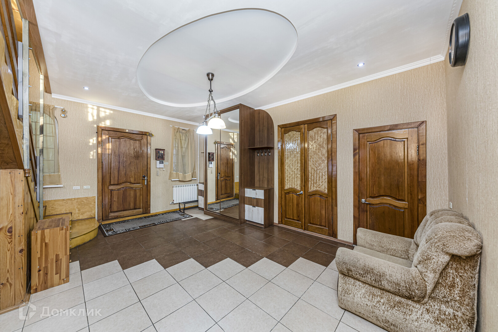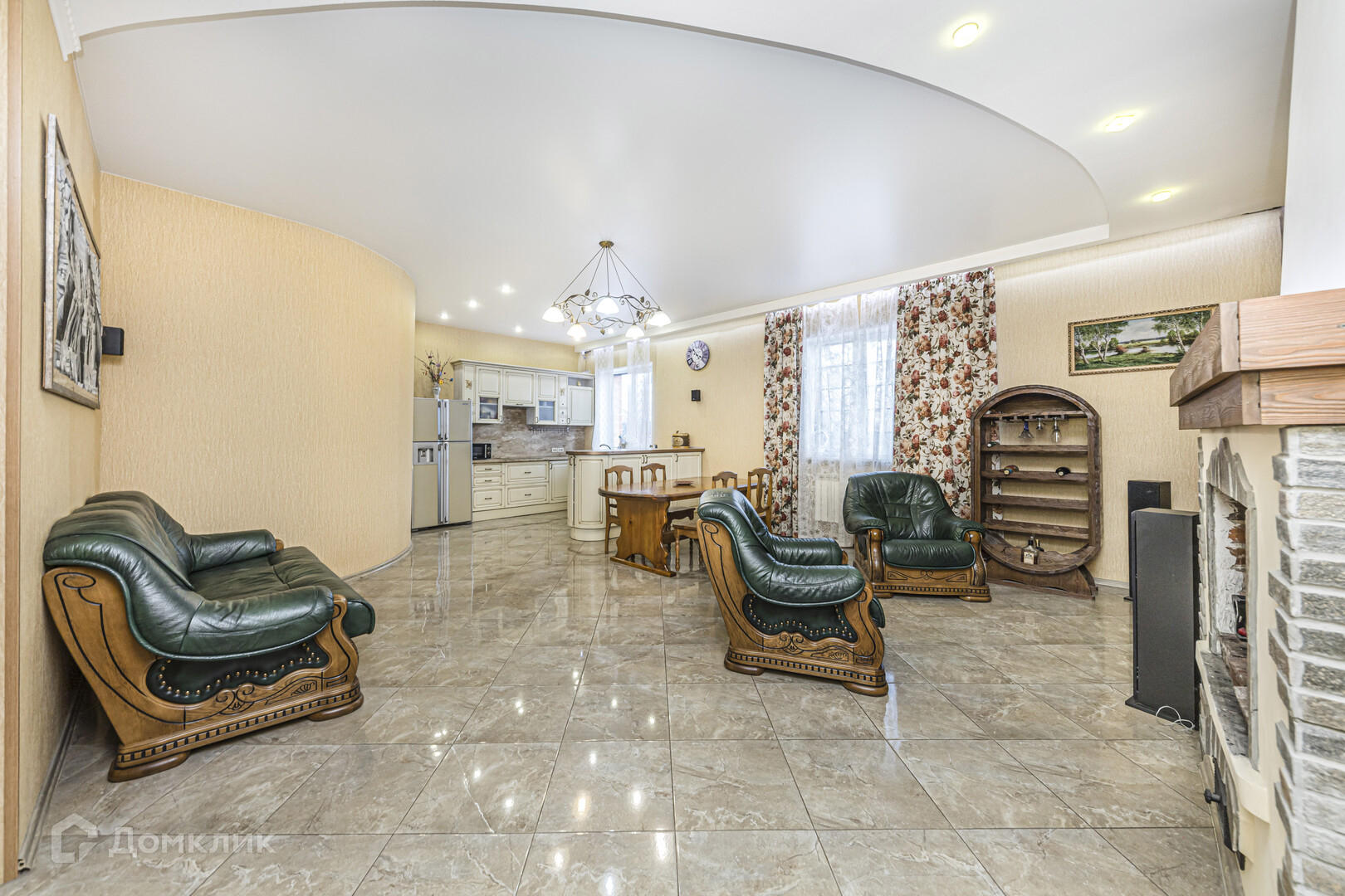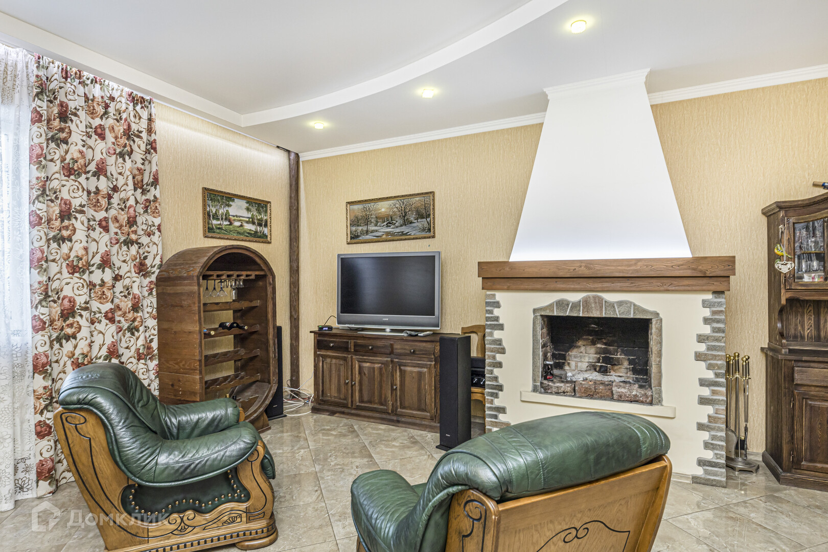 На первом этаже гостевая комната с камином. Теплый пол. Входная группа: на полу керамогранит. На входе установлена металлическая дверь. В прихожей на полу керамическая плитка, стены оклеены обоям светлых тонов, потолок гипсокартон.