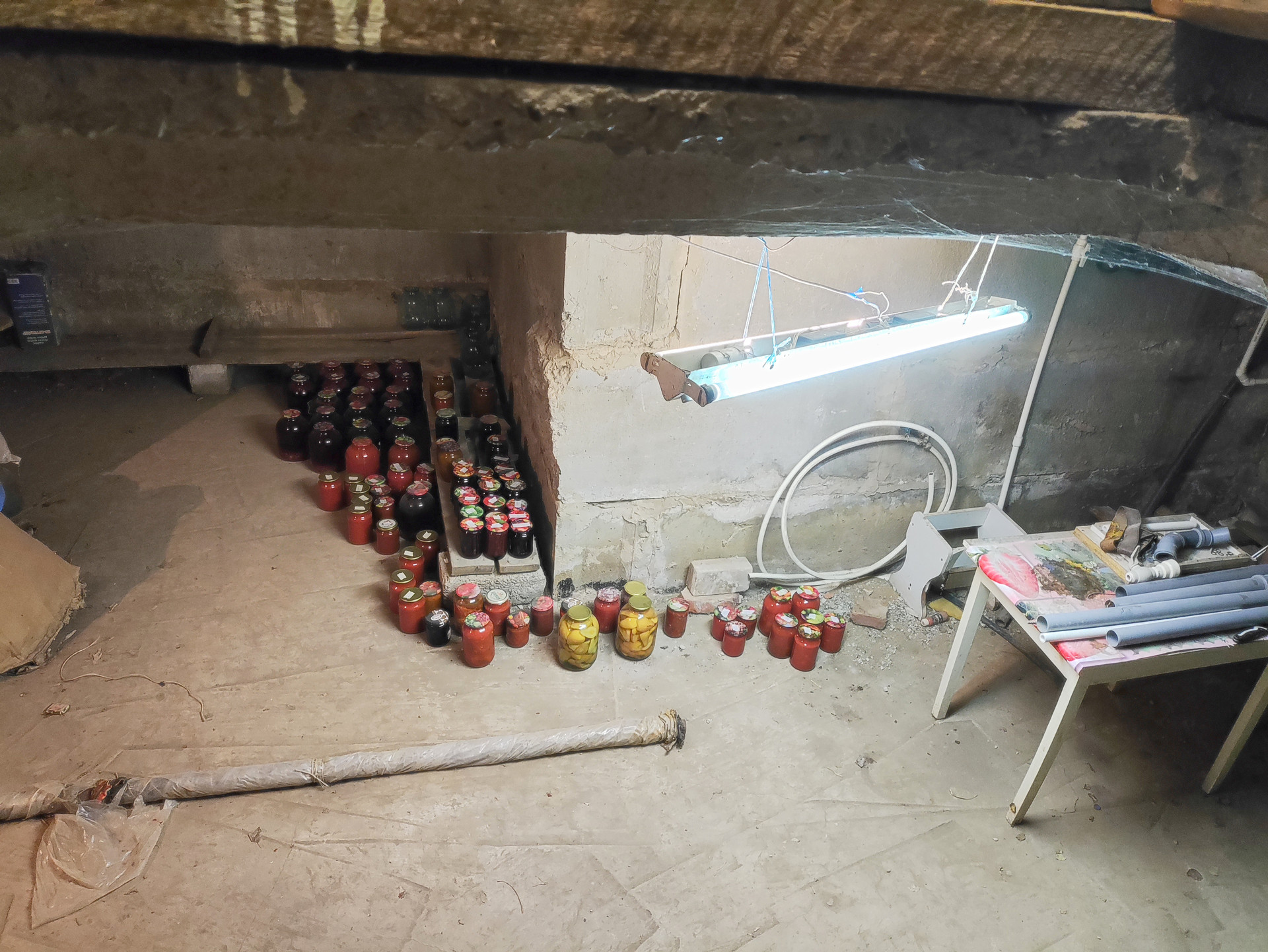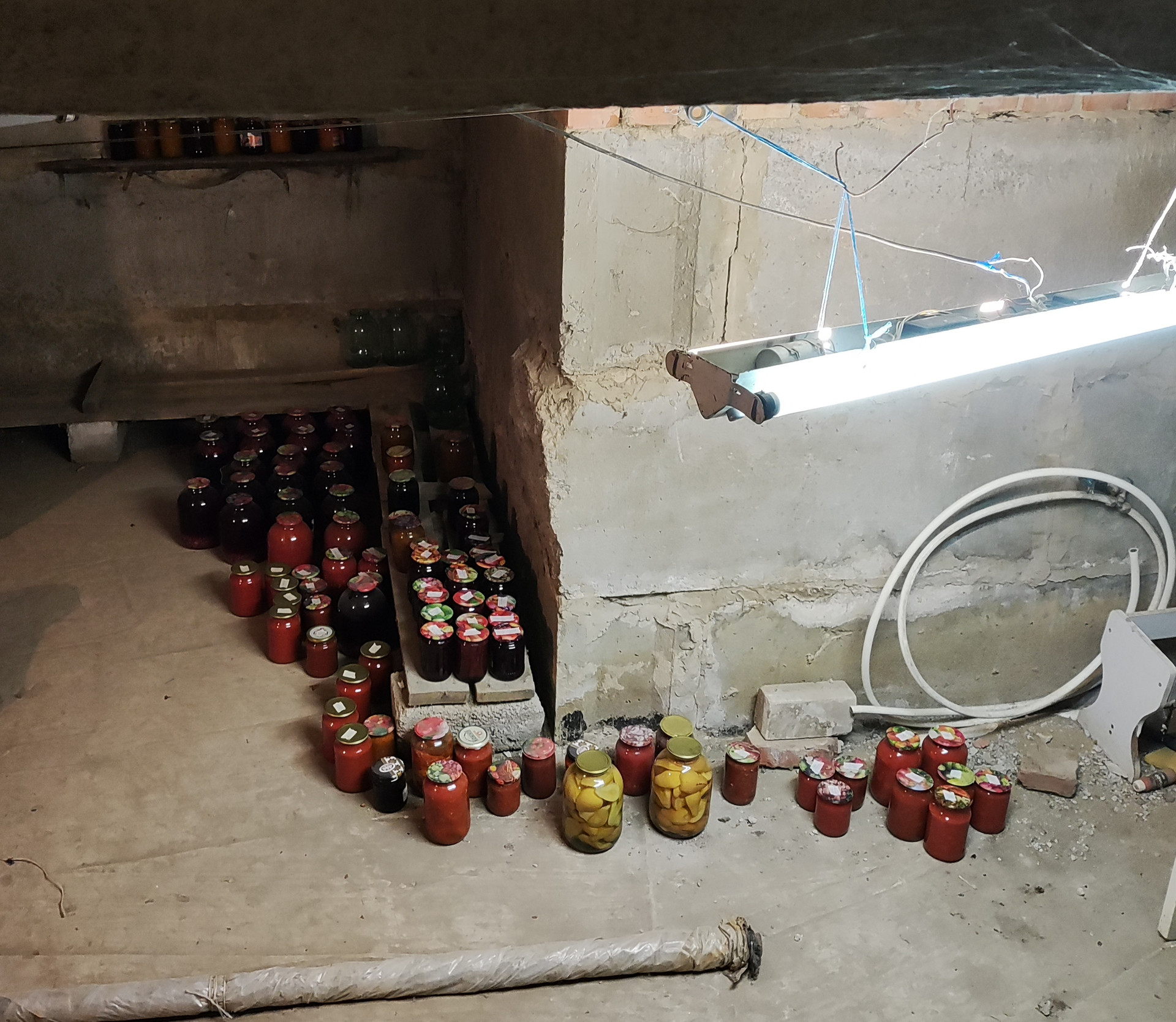 Большой подвал хороший, сухой (выход из дома), ящики для хранения овощей, полки для банок.