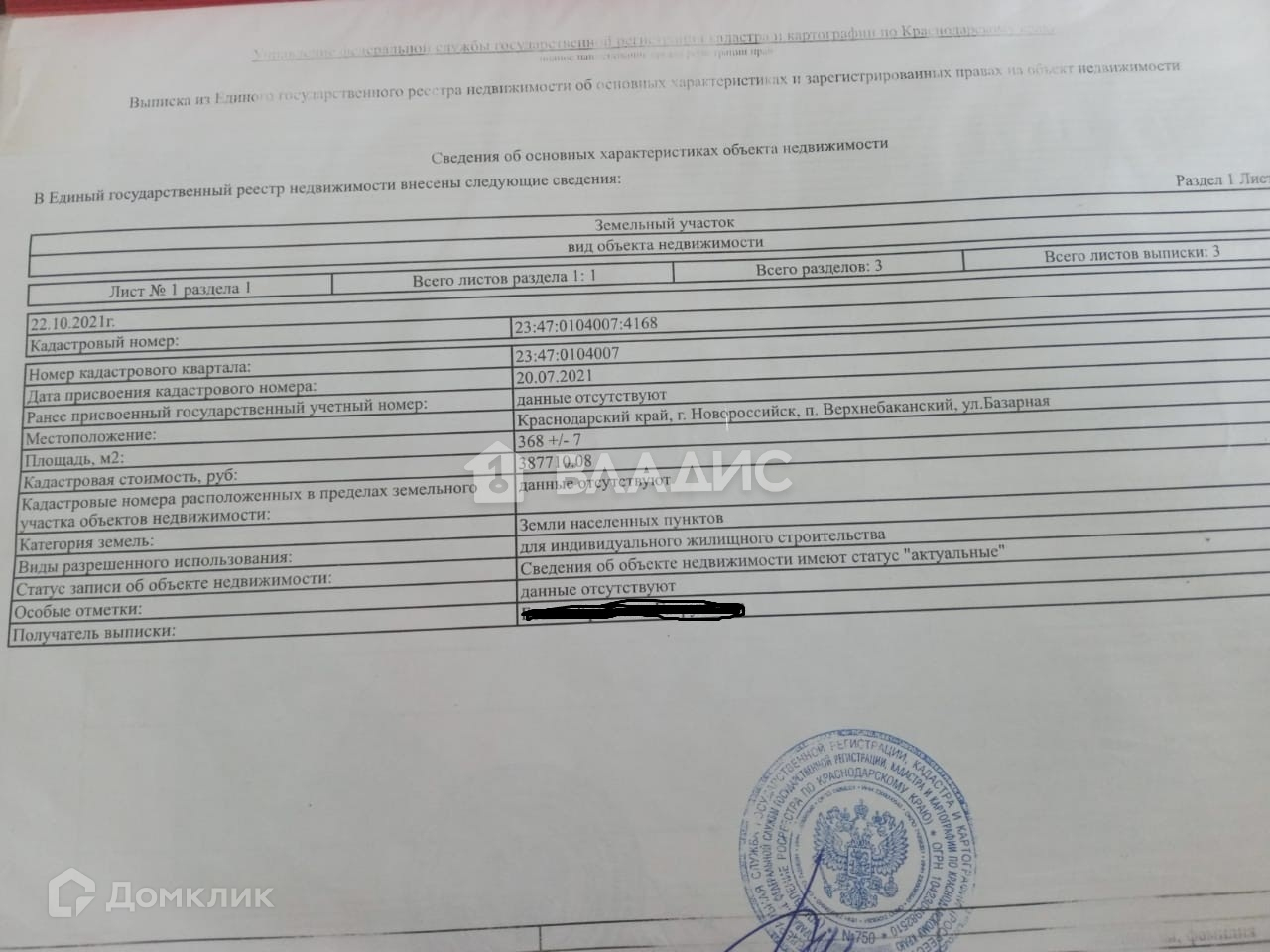 ● Кадастровый номер - 23:47:0104007:4168