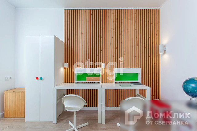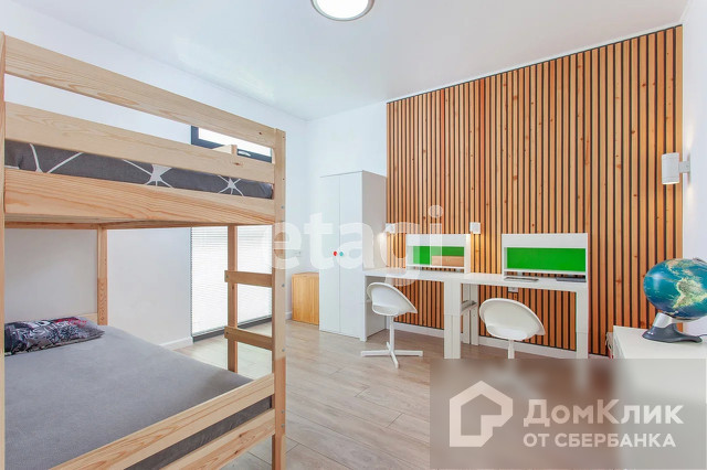 Обустроенная детская комната 13 м3, с двухъярусной кроватью и рабочей зоной, хорошо освещена.
