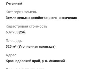 Код объекта: 9254. Продается земельный участок категории сельскохозяйственного назначения, для сельскохозяйственного производства, входит в черту города Анапы, адаптирован под строительство котеджного поселка. Электричество проходит по фасадной границе участка, так же на участке имеется точка доступа к газу высокого давления. Газ низкого давления проходи... |