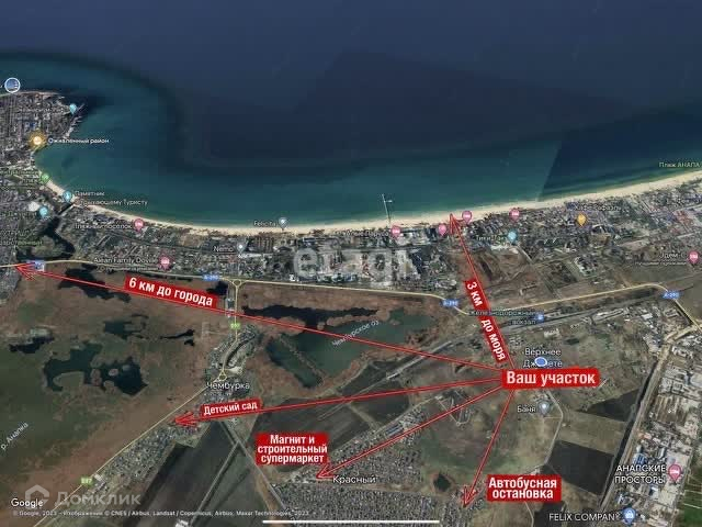 По улице идёт Электричество 15 кВт. , вода проходит рядом с участком, соседи уже строятся и живут круглогодично. С участка открывается потрясающий вид на море, город и горы, вокруг только природа и тишина, до моря 30 мин пешком, до центра Анапы 20 минут на машине.
