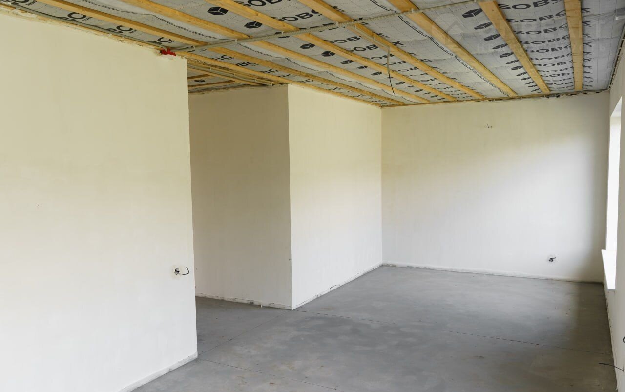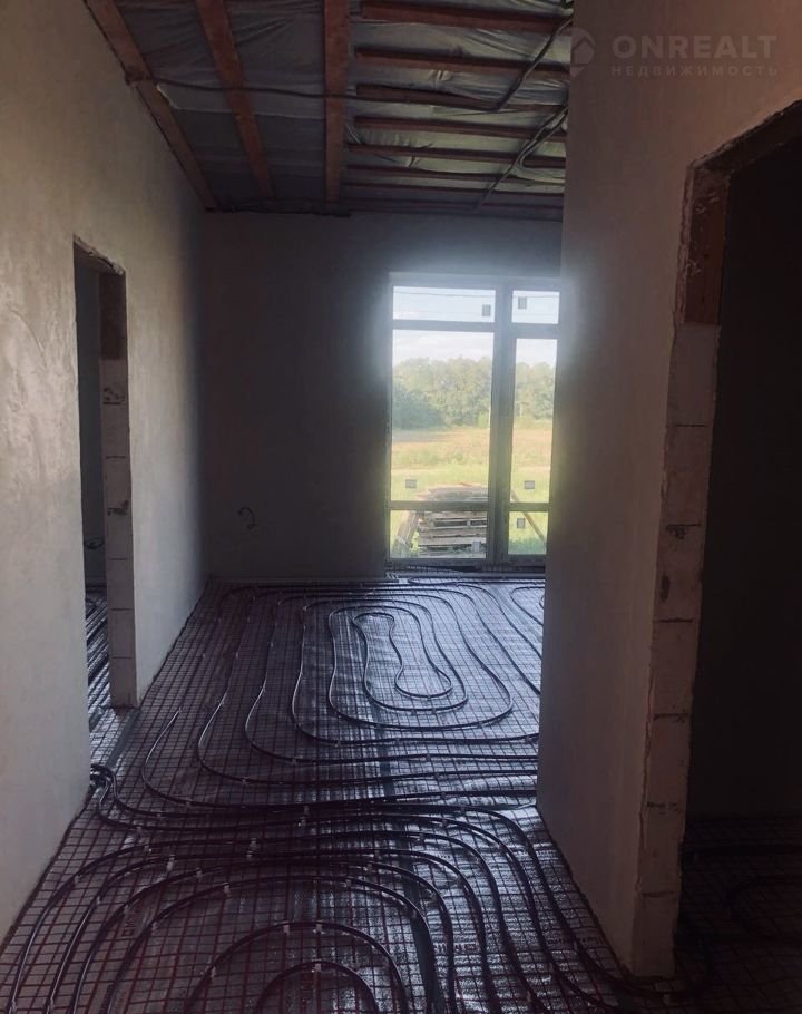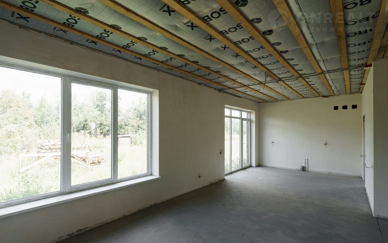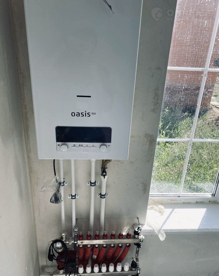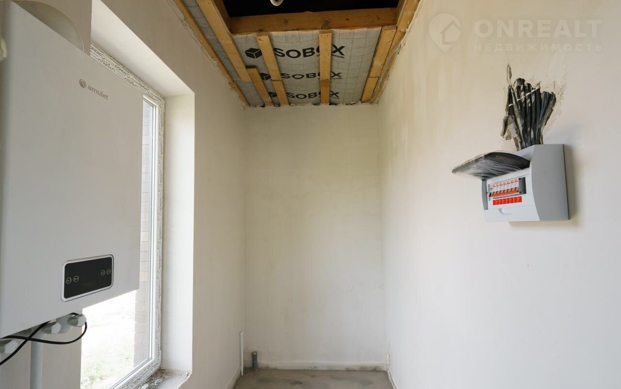 В доме выполнена разводка всех необходимых коммуникаций (электрика, вывод воды, канализация), произведена штукатурка стен под маяк. Проведено отопление теплый пол с выводом под радиаторы и выполнена стяжка пола. Далее установлены двухконтурный газовый котел, окна и входная дверь, предусмотрен дополнительный выход.