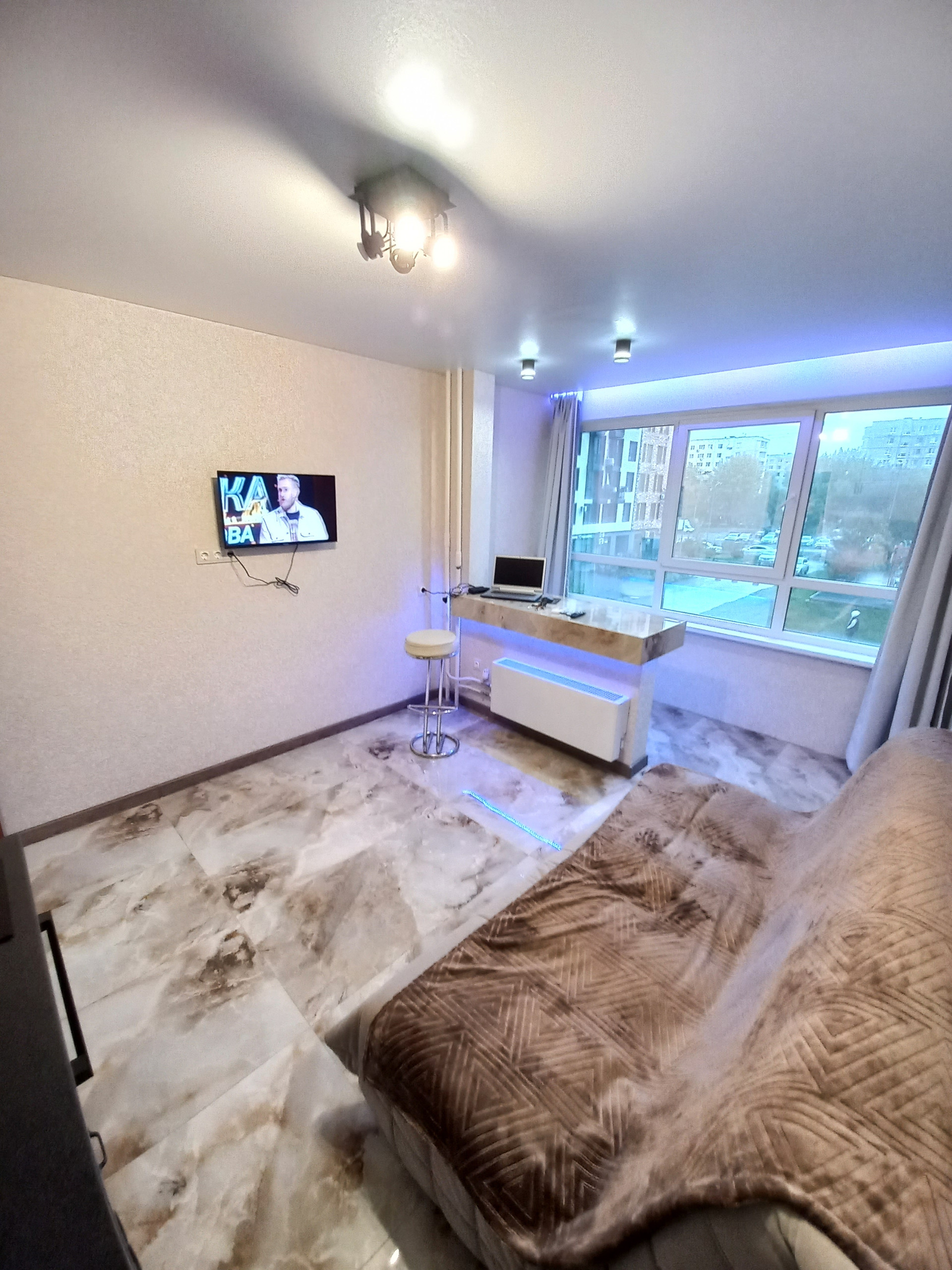Светлая новая квартира-студия в новом доме люкс класса 2022г. Ламинат,  натяжной потолок,  тройной стеклопакет, санузел в плитке. Панорамное остекление.  Очень выгодная инвестиция для бизнеса или собственного проживания.  Аренда в этом доме подобных квартир 16000+коммуналка. Низкие коммунальные платежи. Последнее фото как можно увеличить данную планировку .