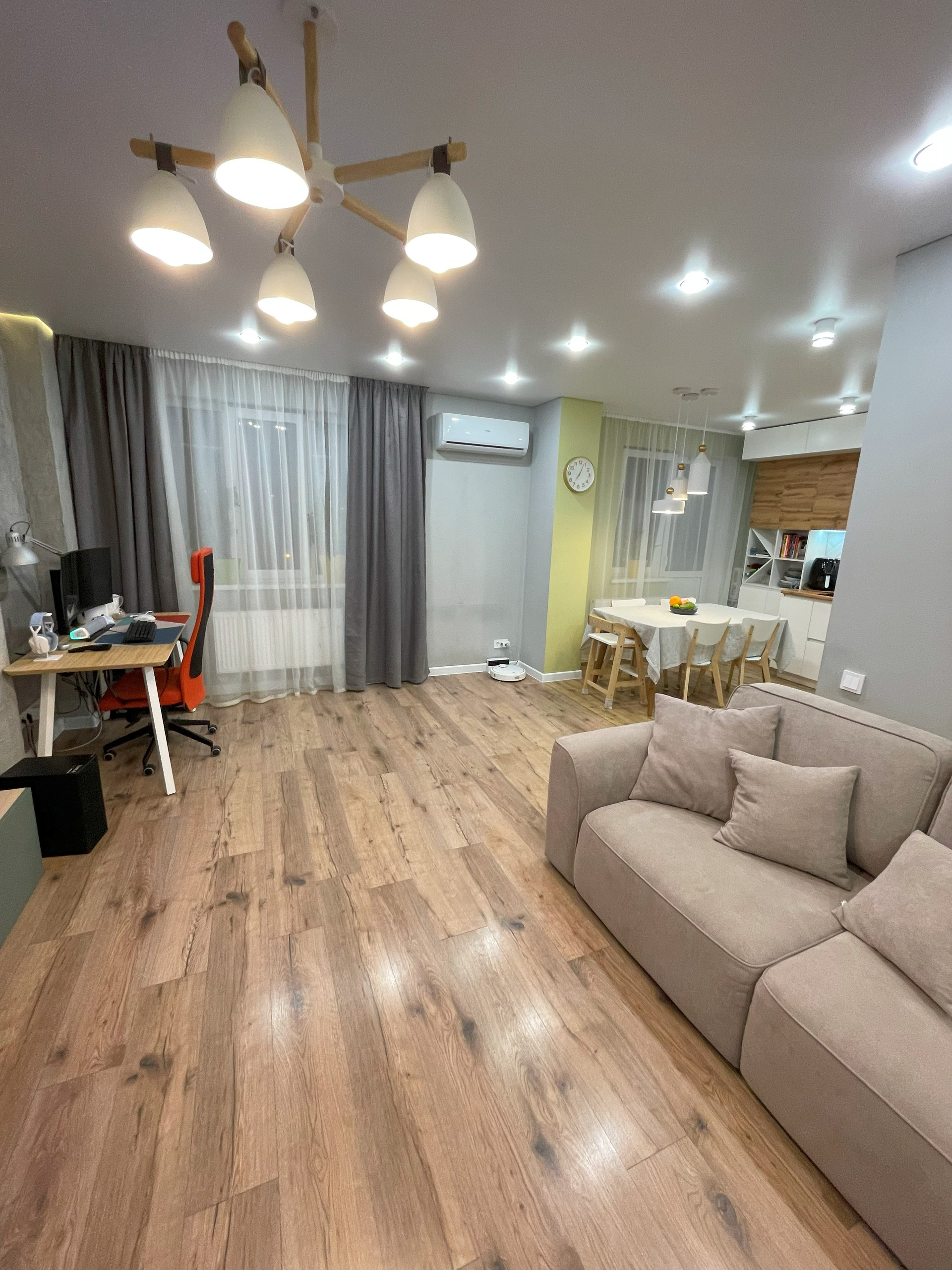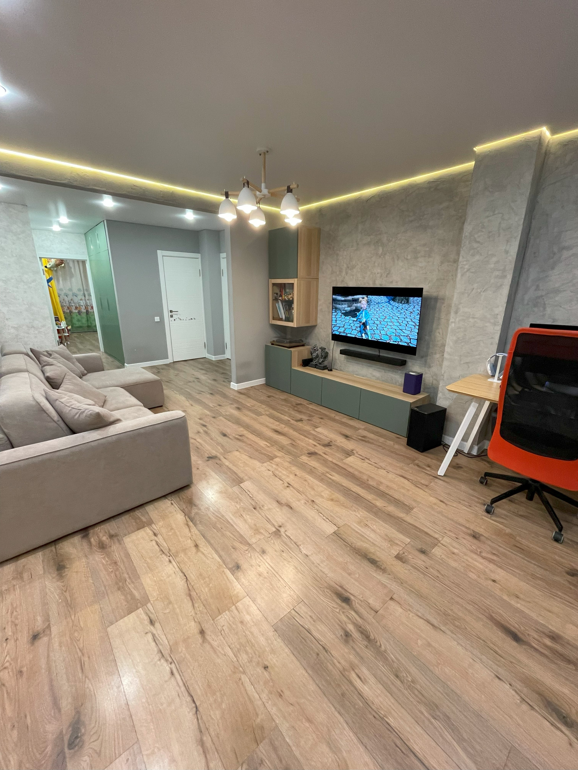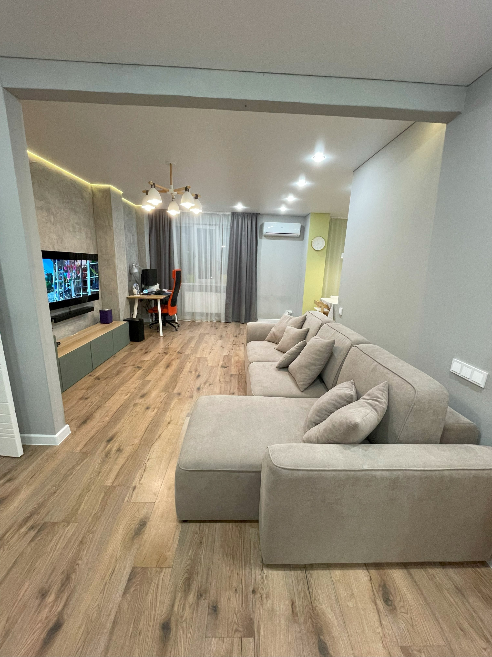 В гостиной установлена сплит-система Haier HSU-12HTM03/R2, подсветка потолка по периметру, стенка из икеи.