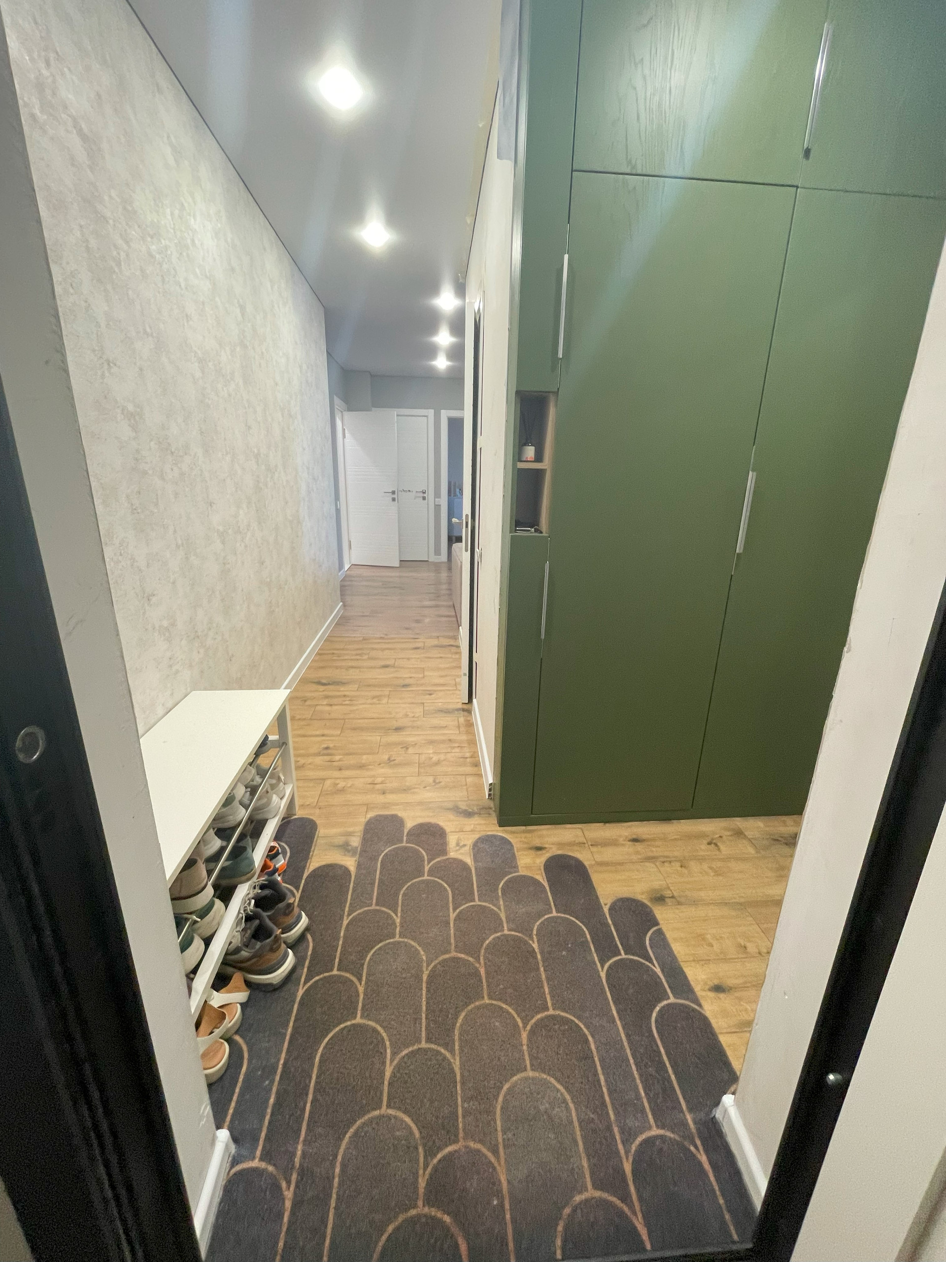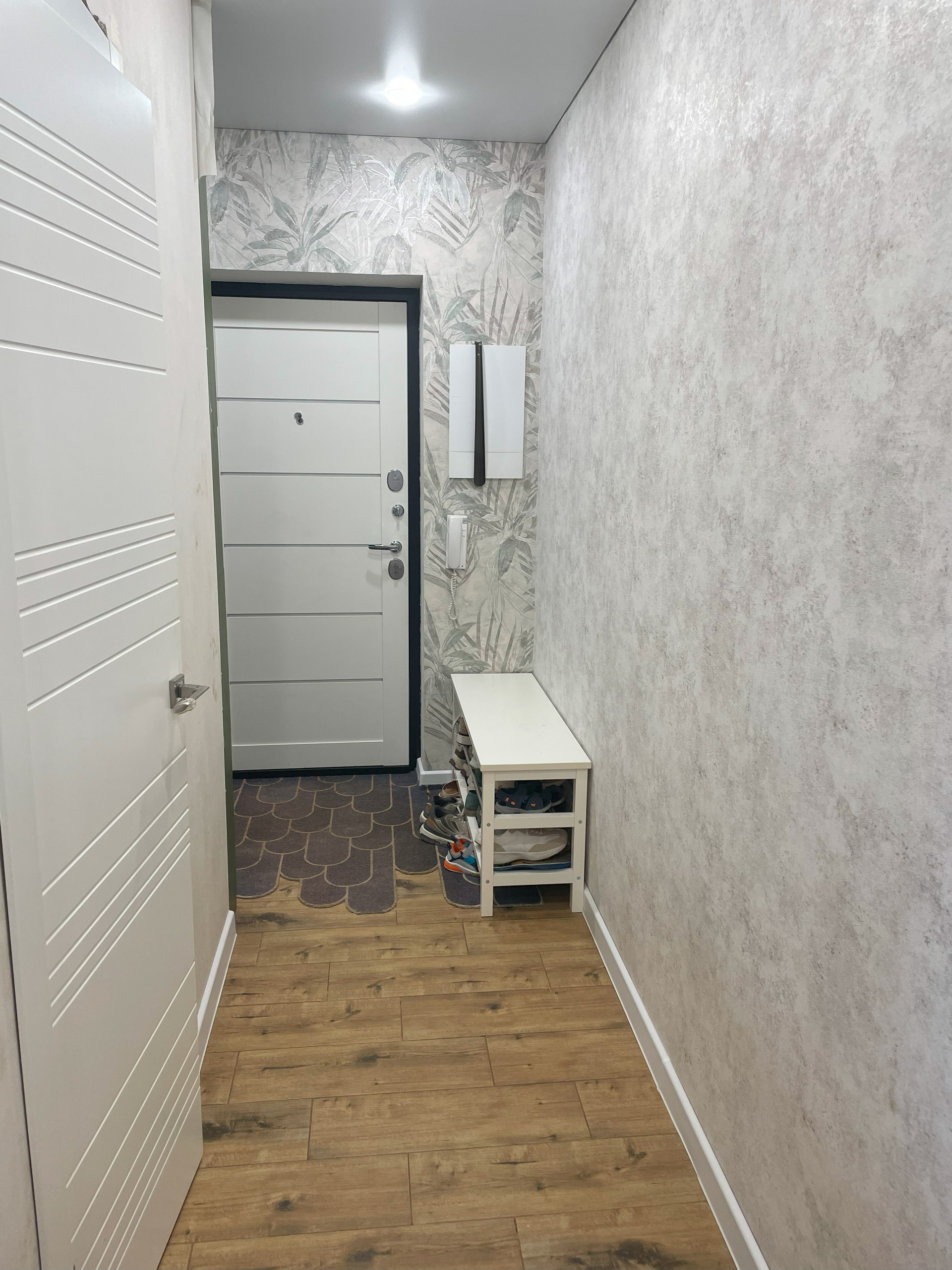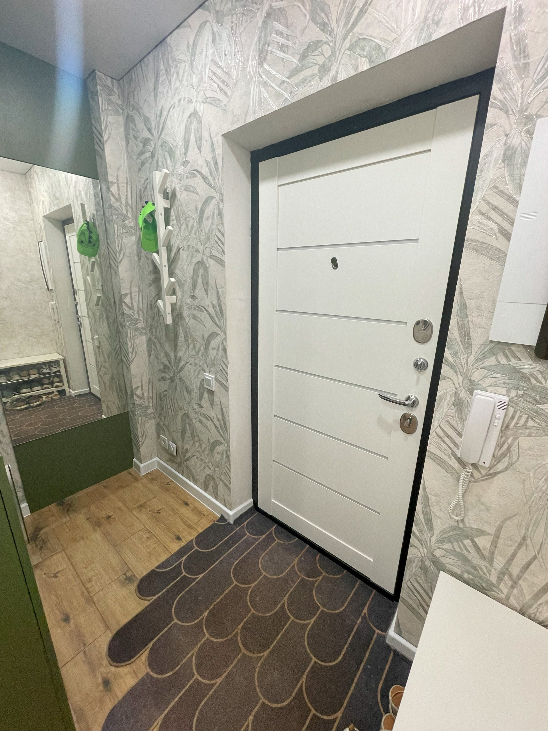 При входе встроенный шкаф для хранения вещей и обуви. Дверь-зеркало скрывает счетчики и коллектор для управления отоплением (вы можете регулировать температуру в каждой комнате отдельно).