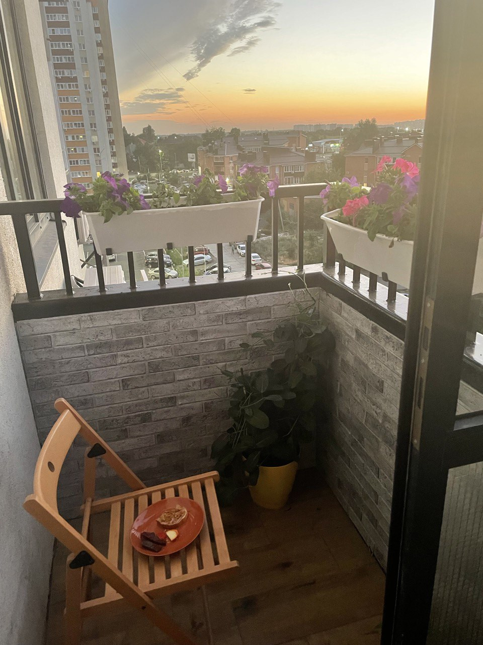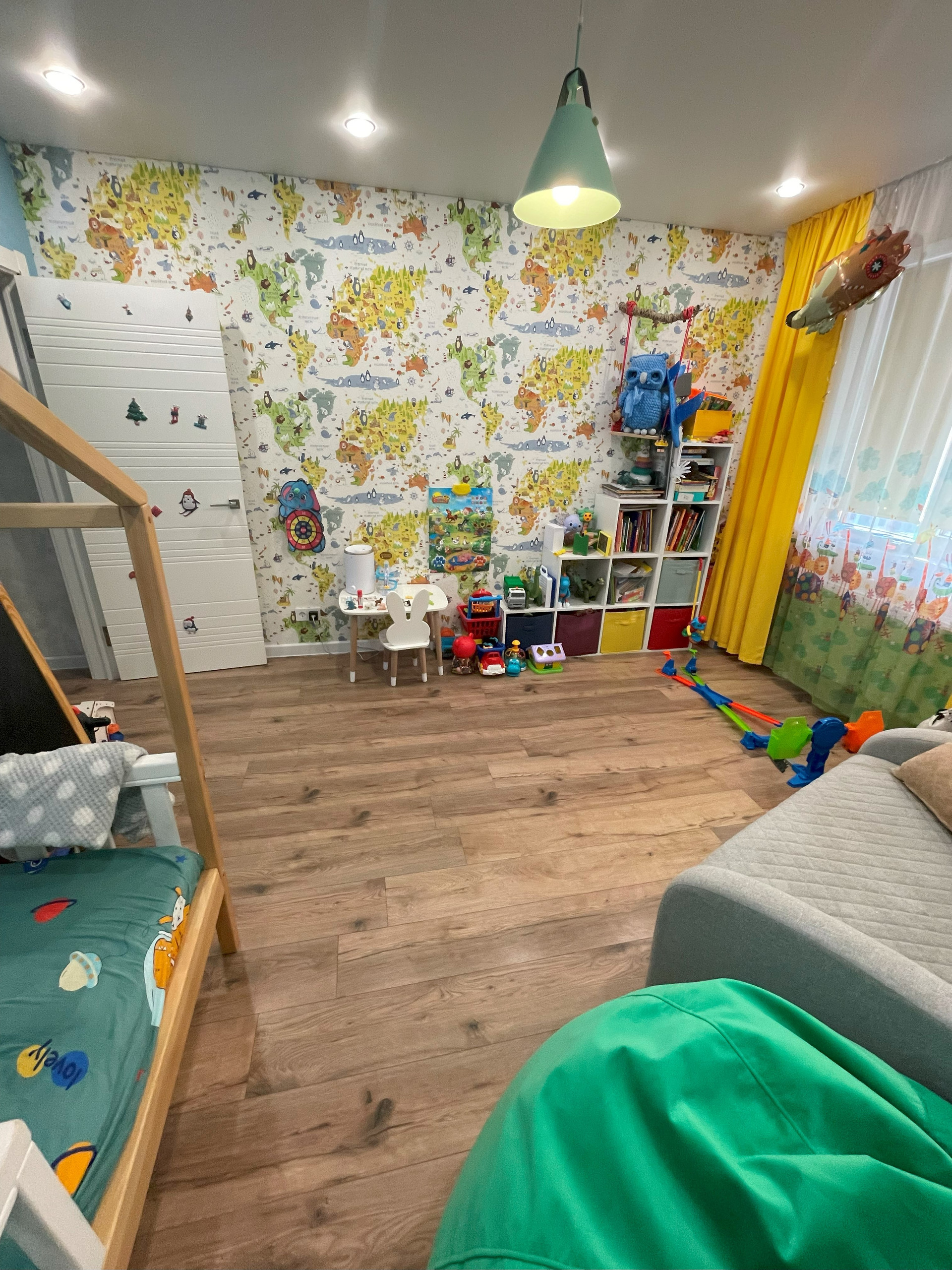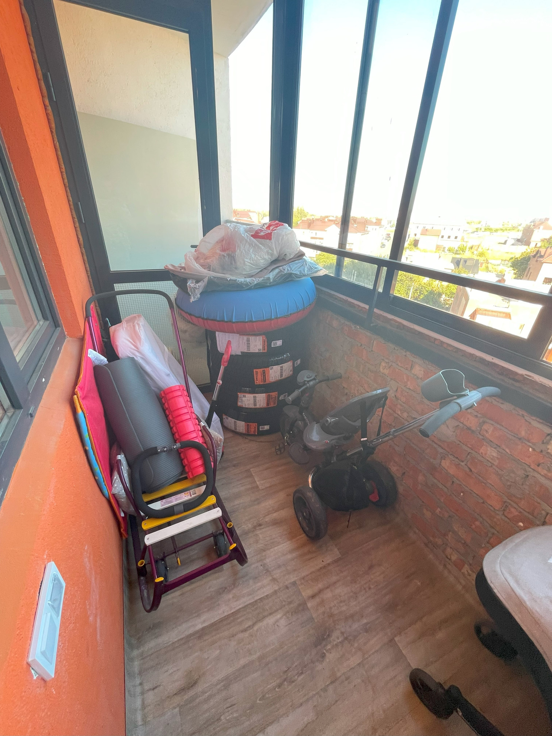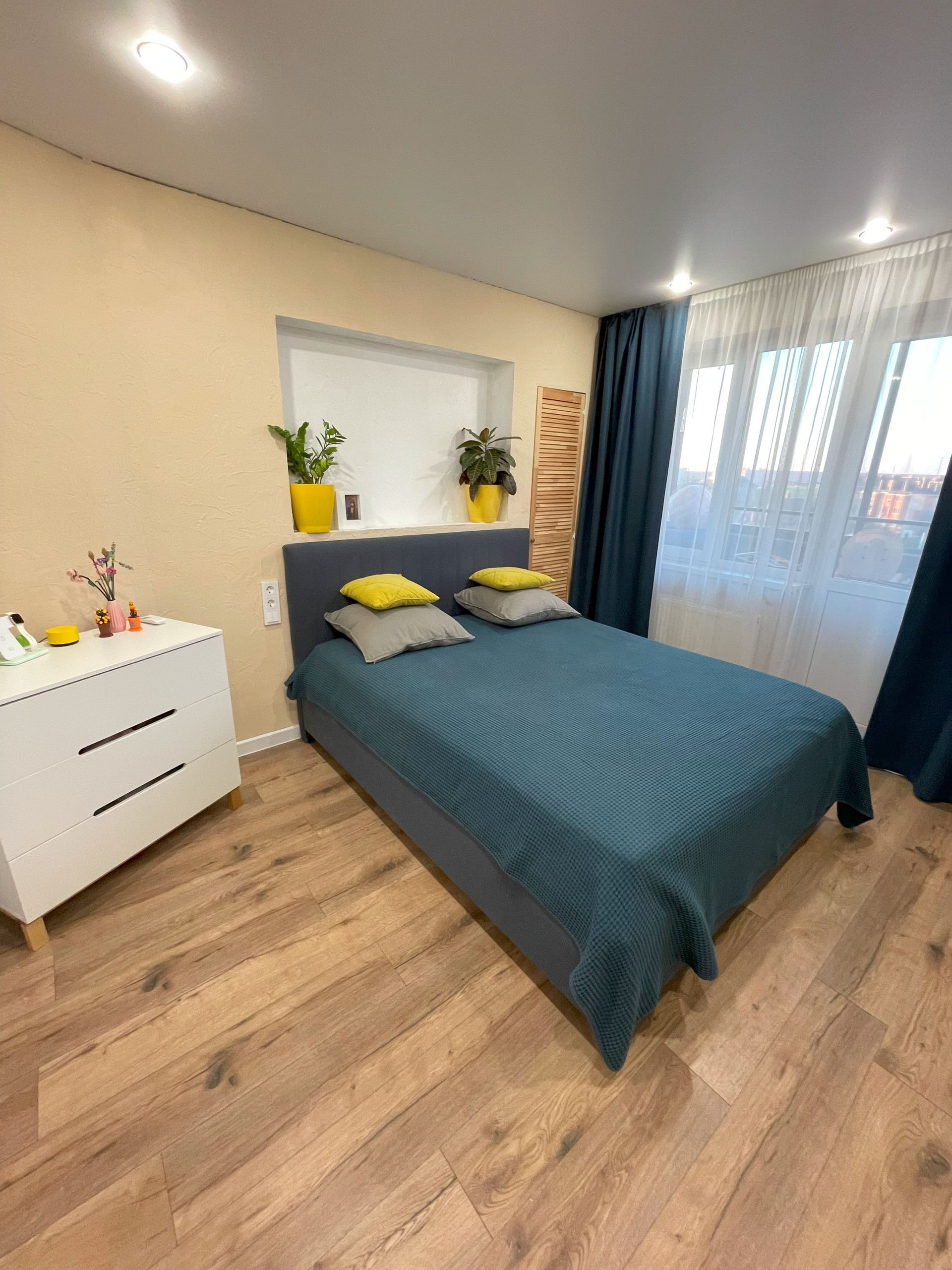 В спальне кровать с подъёмным механизмом и матрасом из икеи, ниша из гипсокартона с выводом под подсветку. Небольшая кладовка из двух стеллажей по 60см в ширину. На балконе постелен линолеум, мы используем его в основном для хранения вещей и сушки белья.