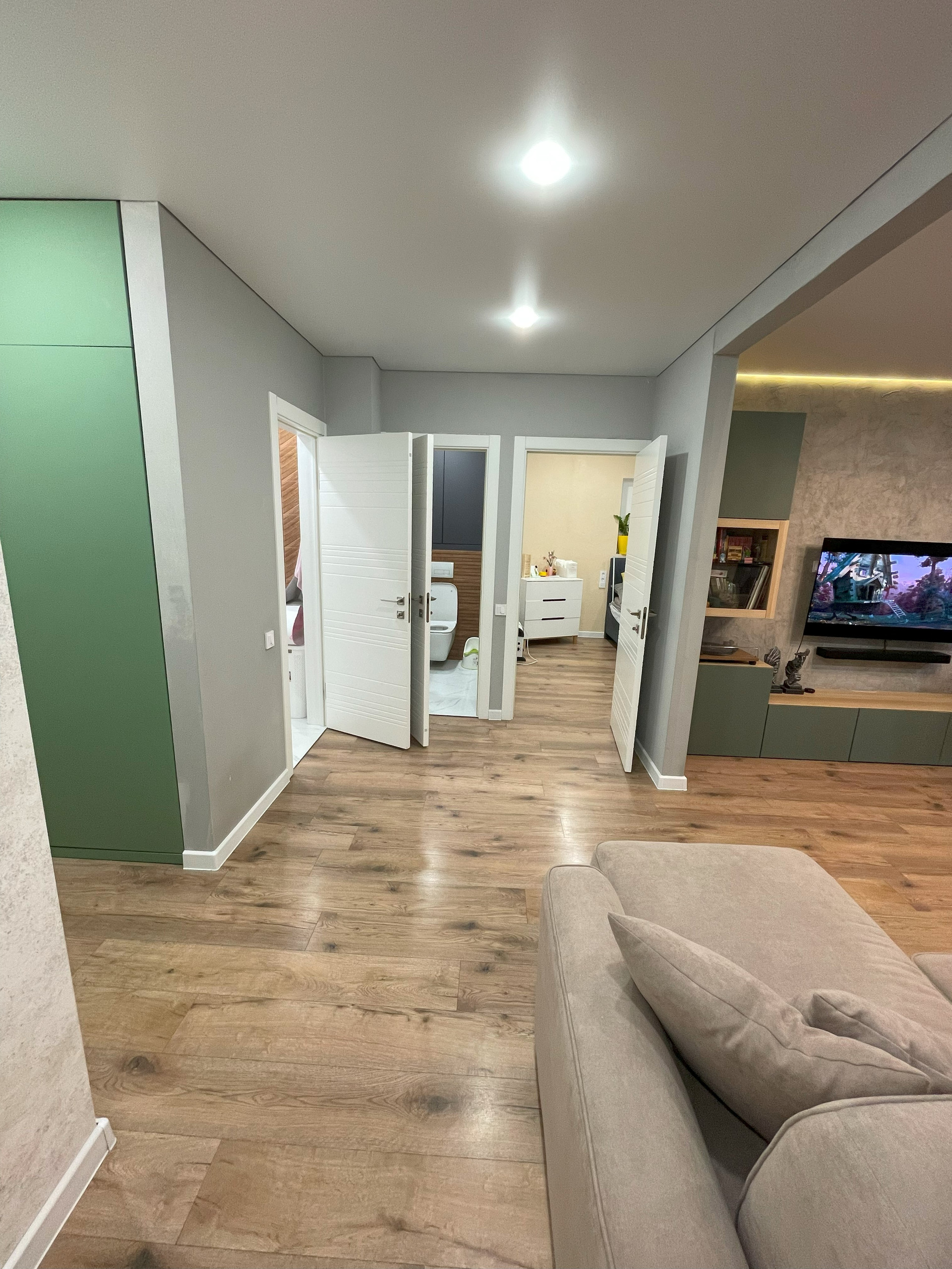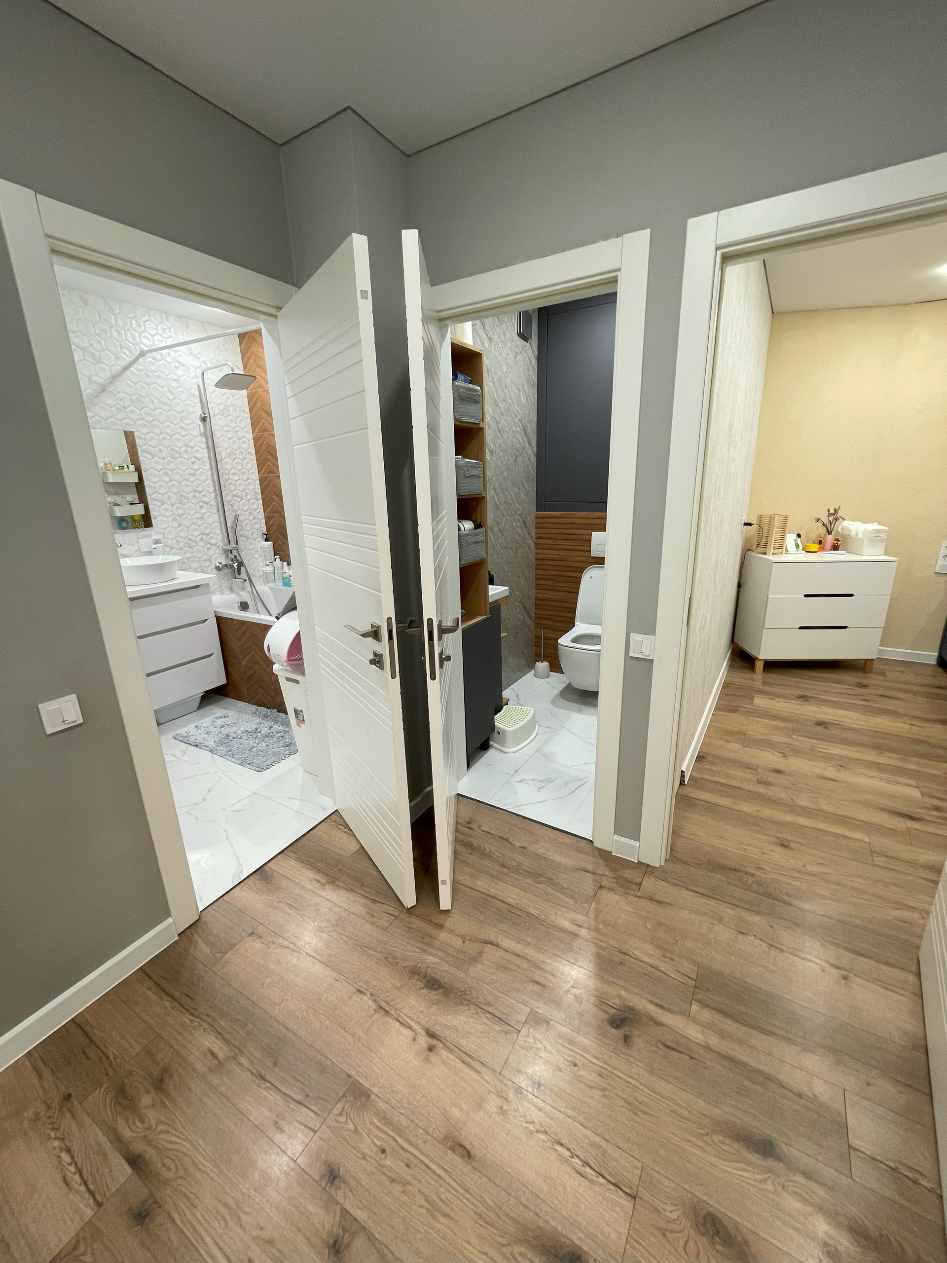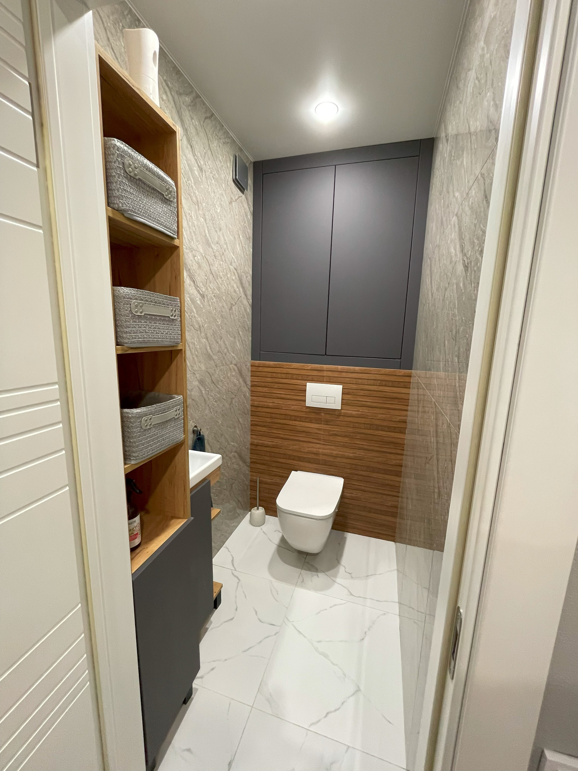 В туалете установлены распашные двери, которые скрывают бойлер и место для хранения химии или других принадлежностей. Стеллаж-шкаф, раковина и зеркало с подсветкой. Так же есть теплый пол.