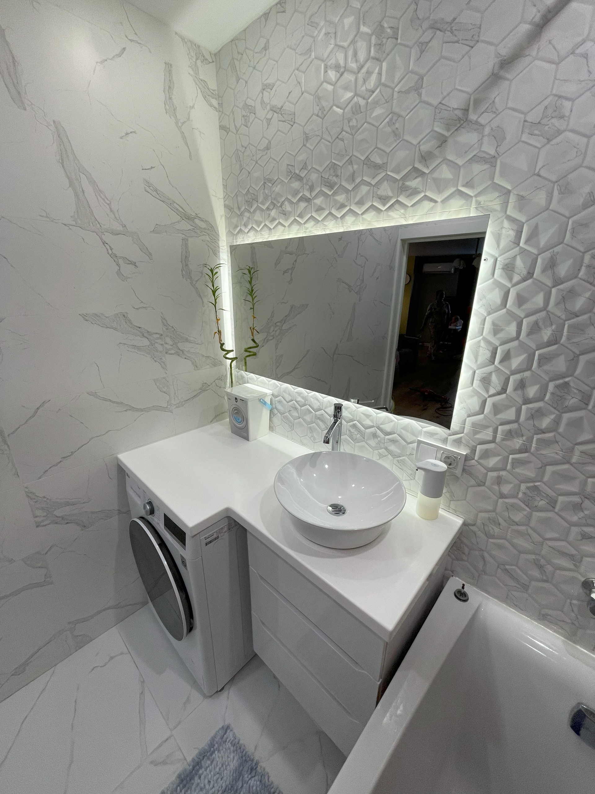 В ванне установлена стиральная машина с сушкой LG AIDD F4V5VG0W, столешница на заказ из акрила, зеркало с подсветкой и отдельным выводом для включения, так же есть розетка, теплый пол.
