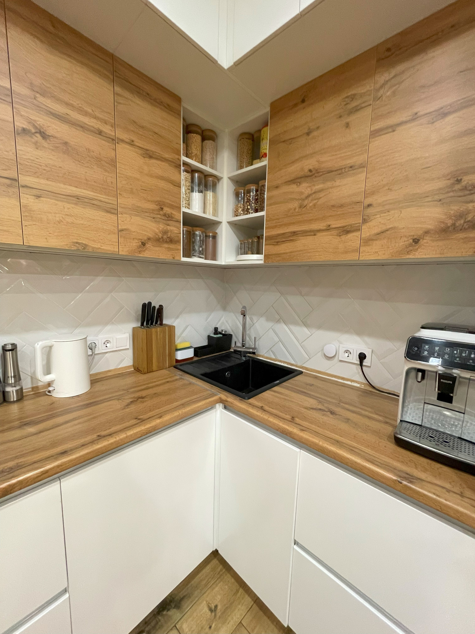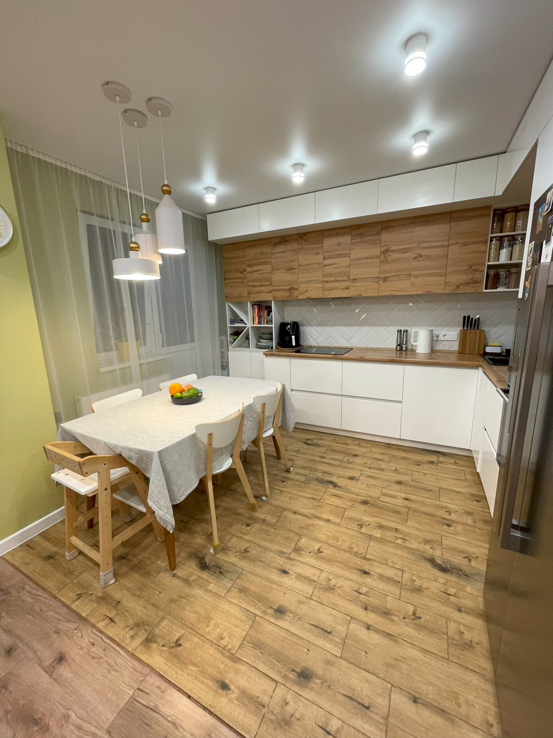 На кухне установлен измельчитель отходов Bort (пищевые отходы можно скидывать в раковину) и фильтр для воды Аквафор. Фартук из плитки, подсветка рабочей зоны. Техника: холодильник Beko BlueLight GN162320X с генератором льда и подачей холодой воды, индукционная варочная панель Electrolux IPE 6453 KF, электрический духовой шкаф Hotpoint-Ariston 7OFI4 851 SH IX HA, встраиваемая микроволновая печь Samsung FW77SUT, кухонная вытяжка Electrolux LFG 9525 S, посудомоечная машина 60 см Zigmund & Shtain DW 129.6009X. Лампы над столом можно включать отдельно, что создаёт вечерами уютную обстановку. Умный регулятор пола, который синхронизируется с Алисой. На полу балкона уложена плитка, есть стеллаж для хранений вещей.