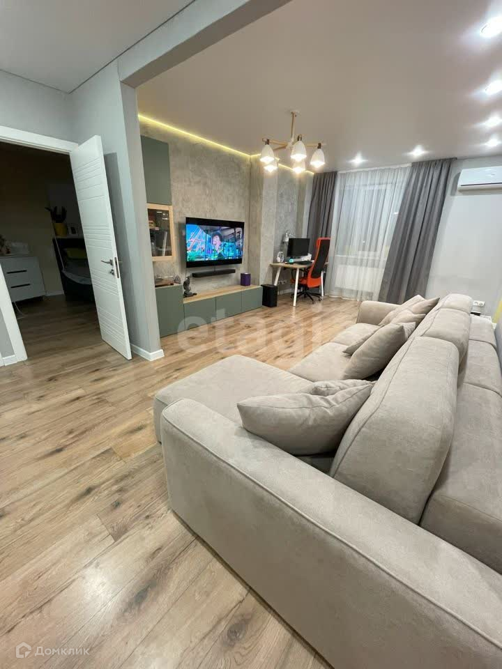 В гостиной установлена сплит-система Haier HSU-12HTM03/R2, подсветка потолка по периметру, стенка из икеи.