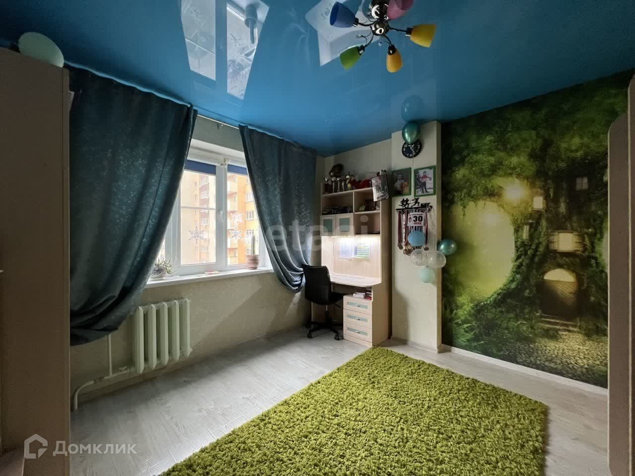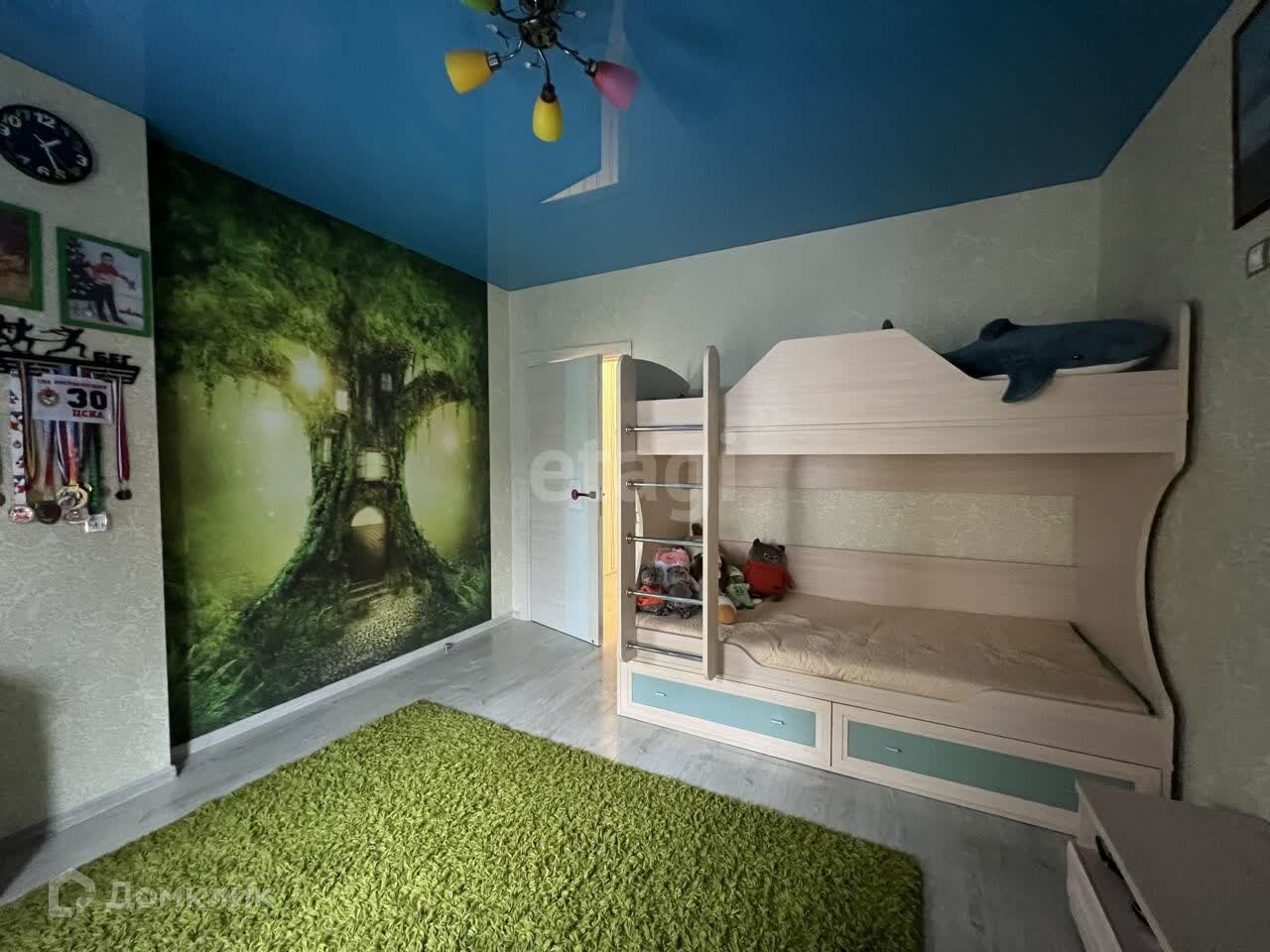 В детской двухъярусная кровать, шкаф, письменный стол с полками и ящиками, стеллаж для книг.