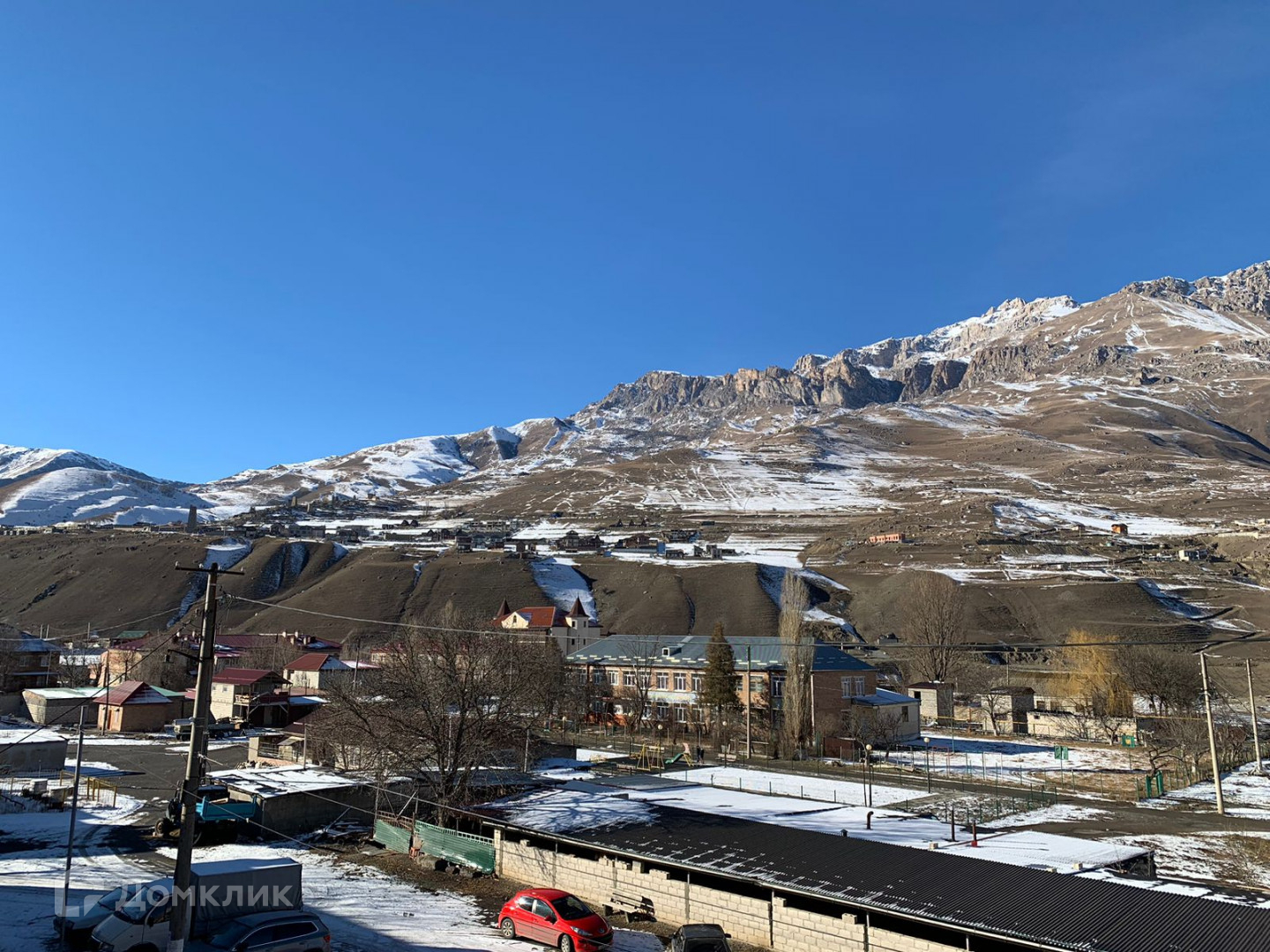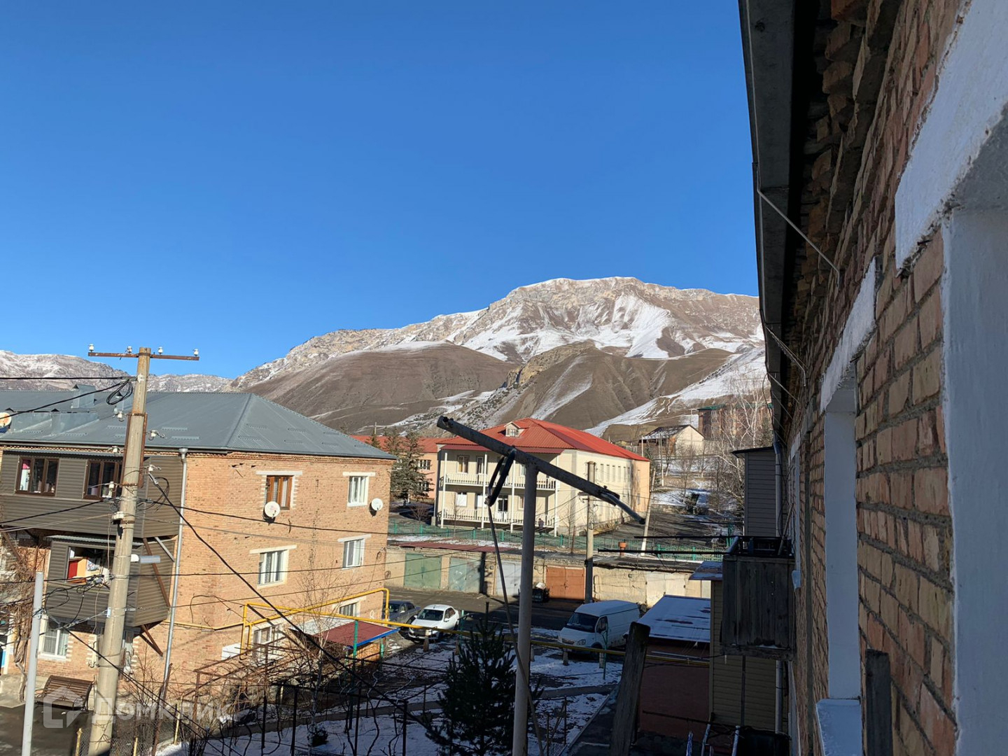 Вид из окон на заснеженные горы.