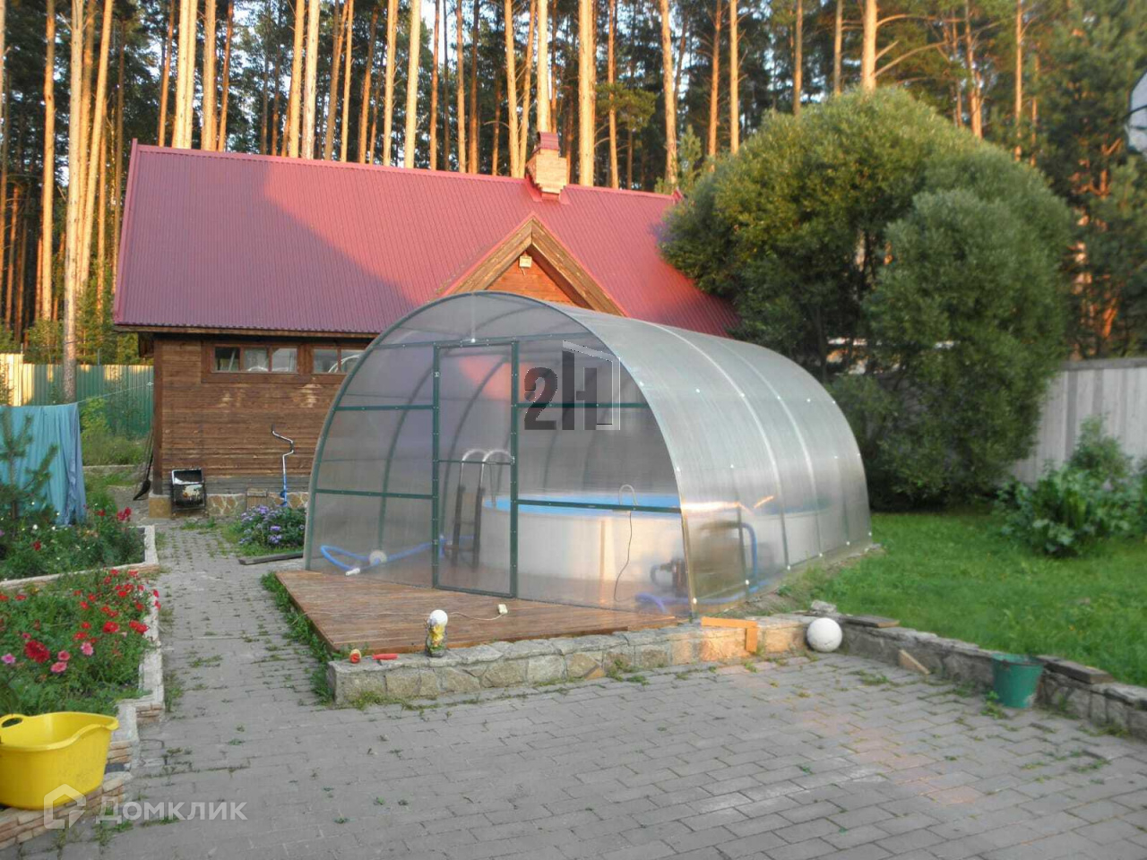 Гостевой дом: брус 150 мм., площадь: 39,9 кв м, две комнаты 13 кв м и 10 кв м, прихожая. Отапливается котлом. Дом утеплен, обшит вагонкой с обеих сторон. В гостевой дом проброшены под землей трубы с утеплением от основного котла, установлен дополнительный термостат и насос подкачки.