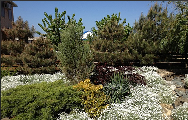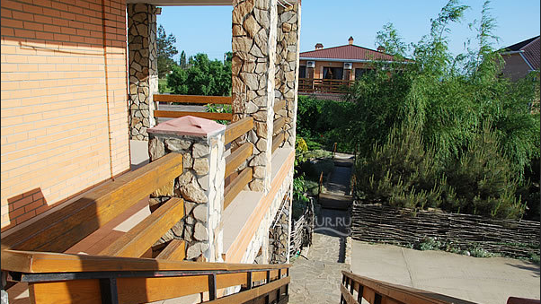 Квартира имеет большой балкон - лоджию, можно застеклить (но не стоит). Все в зелени. На фото видно лестницу- вход и большой балкон. Все гармонично и очень комфортно.