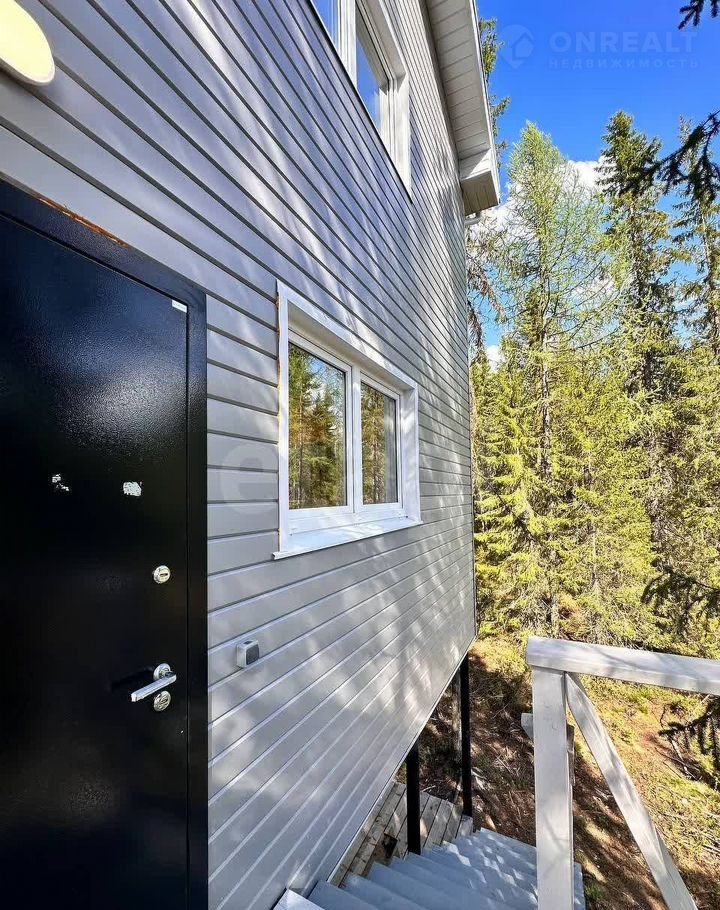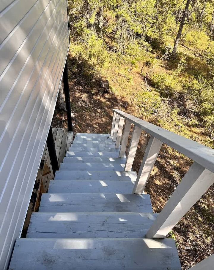 Планировка дома функциональна и рассчитана на круглогодичное проживание. Первый этаж занимает просторная терраса, идеальная для отдыха. На втором этаже расположена кухня с современным гарнитуром, встроенной посудомоечной машиной и системой «теплый пол», а также большая гостиная с санузлом. Третий этаж отведен под две спальни со встроенными шкафами, одна из которых имеет отдельный санузел. Отделка выполнена в скандинавском стиле с использованием практичных материалов: металлосайдинг на фасаде, металлочерепица на двускатной крыше, керамическая плитка в зонах с повышенной влажностью.